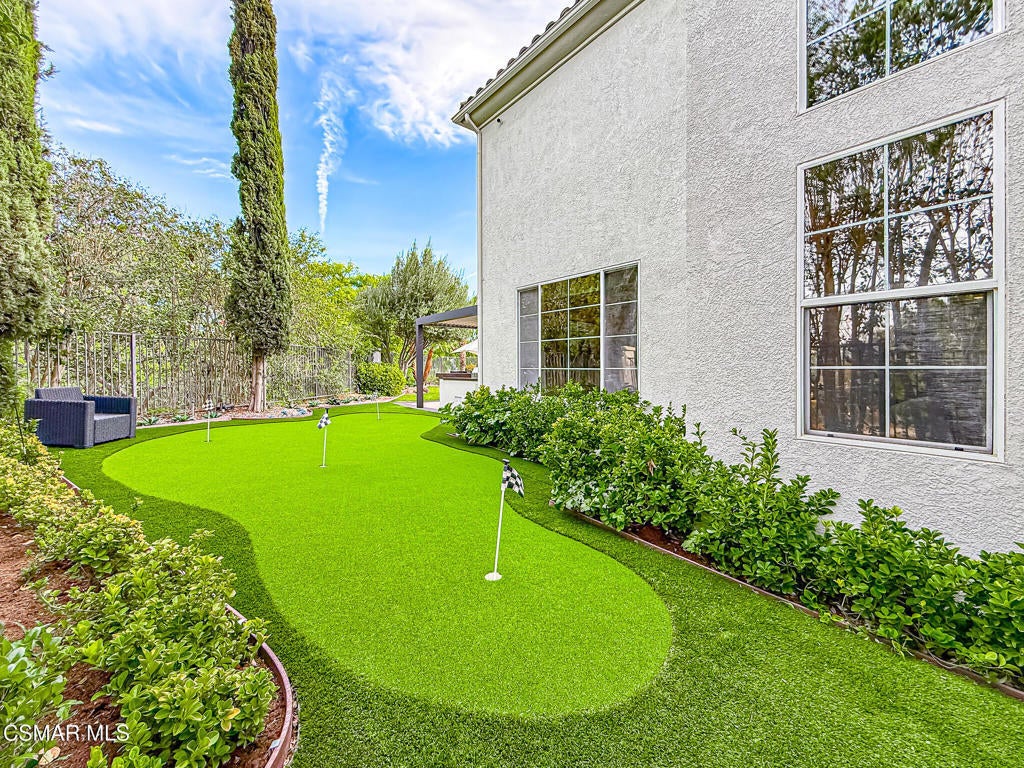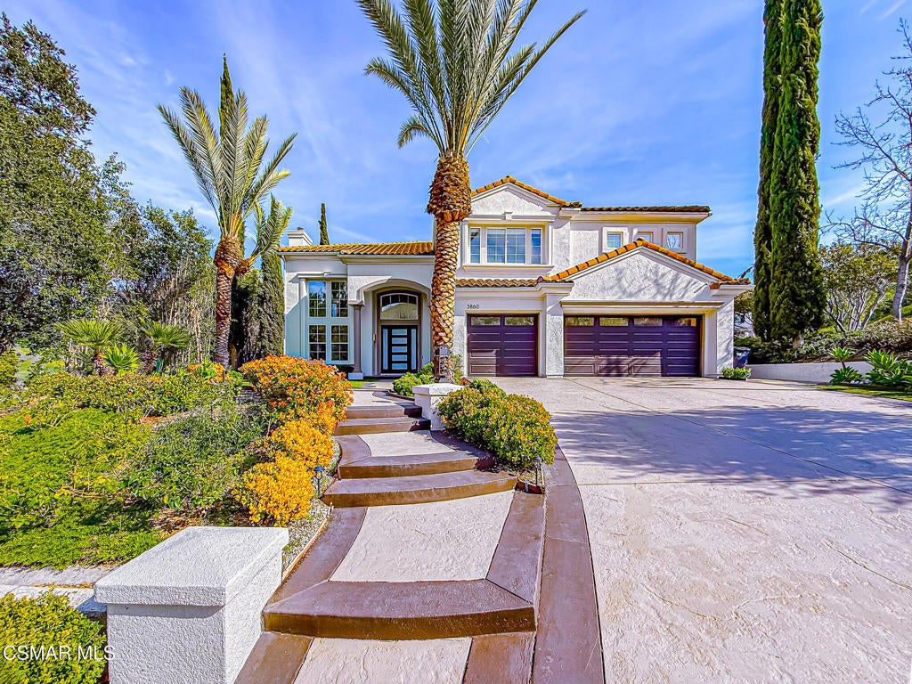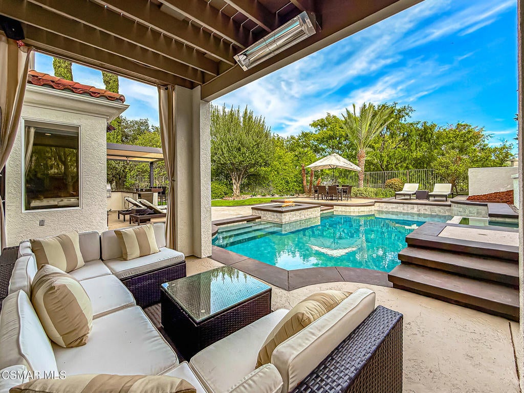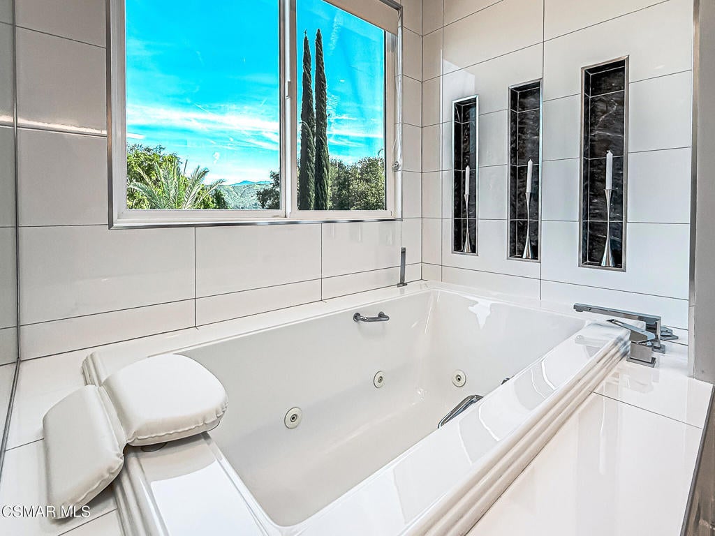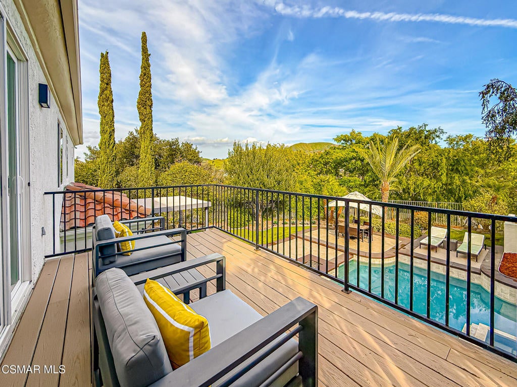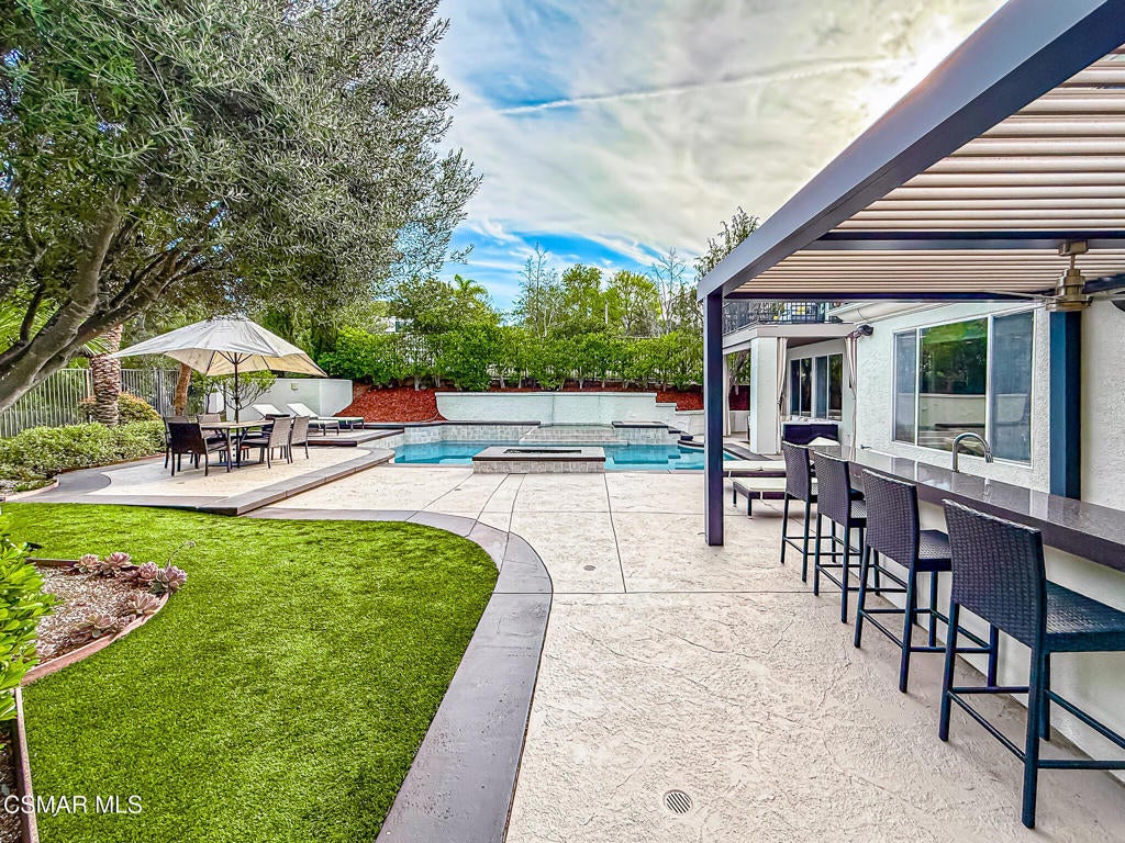 A rare opportunity to own a truly exceptional home. Nestled in the hills of Calabasas within the sought-after gated community of Calabasas View, this beautifully reimagined residence sits on an isolated lot on a quiet cul-de-sac and perfectly captures the essence of refined California living. Blending sophisticated interiors with effortless indoor-outdoor flow, the home spans 3,602 square feet on an expansive 10,141 square foot lot with incredible views of the Santa Monica Mountains. Designed for both grand entertaining and comfortable everyday living, the open-concept floor plan features four bedrooms, five bathrooms, and an open office area. A dramatic 20-foot two-story foyer creates a striking first impression, welcoming you into light-filled living spaces with a sense of openness and elegance. At the heart of the home, the gourmet kitchen is appointed with a stunning marble island and backsplash, professional-grade appliances, and a Chanson under-counter water ionizer. The kitchen flows seamlessly into the inviting family room, creating a warm yet sophisticated gathering space. Formal living and dining rooms offer elegant settings for hosting, while two fireplaces, located in the living room and family room, add warmth and timeless charm. A convenient downstairs en-suite bedroom provides an ideal retreat for guests or multigenerational living. Upstairs, the luxurious primary suite serves as a private sanctuary, offering beautiful views from every window, a spa-inspired bathroom, and a spacious walk-in closet. Enjoy peaceful mornings or spectacular sunsets from the private primary balcony. Two additional upstairs en-suite bedrooms are generously sized and versatile. Originally designed as a five-bedroom home, two upstairs bedrooms have been combined into a Pilates studio/gym and can easily be converted back if desired. The private backyard is a true entertainer's oasis, designed for resort-style living. Enjoy the updated sparkling pool and spa, a cozy firepit, outdoor kitchenette, multiple lounging areas, and a four-hole putting green, creating the perfect setting for relaxation and gatherings with family and friends. An attached three-car garage provides added convenience and security. Additional highlights include white oak flooring, Sonos sound system, ADT security system, Lorex security cameras, a fully owned Sunrun solar system, and a Chanson whole-house filtration and water softening system. Ideally situated within the desired Las Virgenes Unified School District, this home offers exceptional convenience with easy access to the 101 Freeway. Enjoy being just fifteen minutes from iconic Malibu beaches, a short distance to Erewhon Market, and only minutes from premier shopping and dining at The Commons at Calabasas, Westlake Village Promenade, and the Valley destinations.
