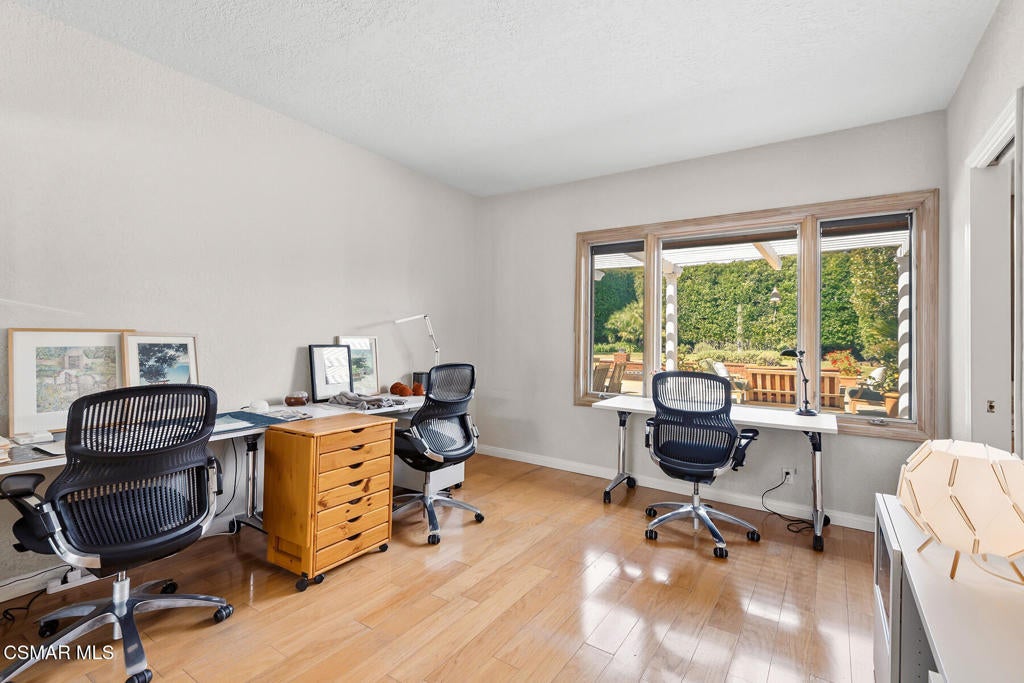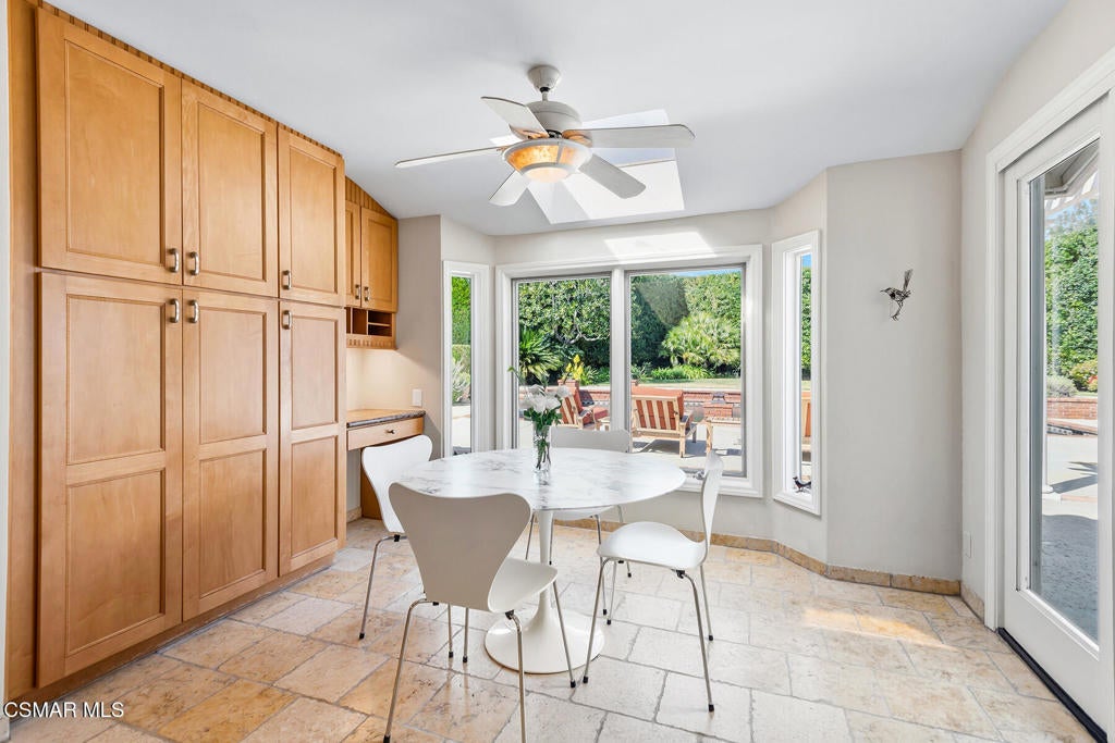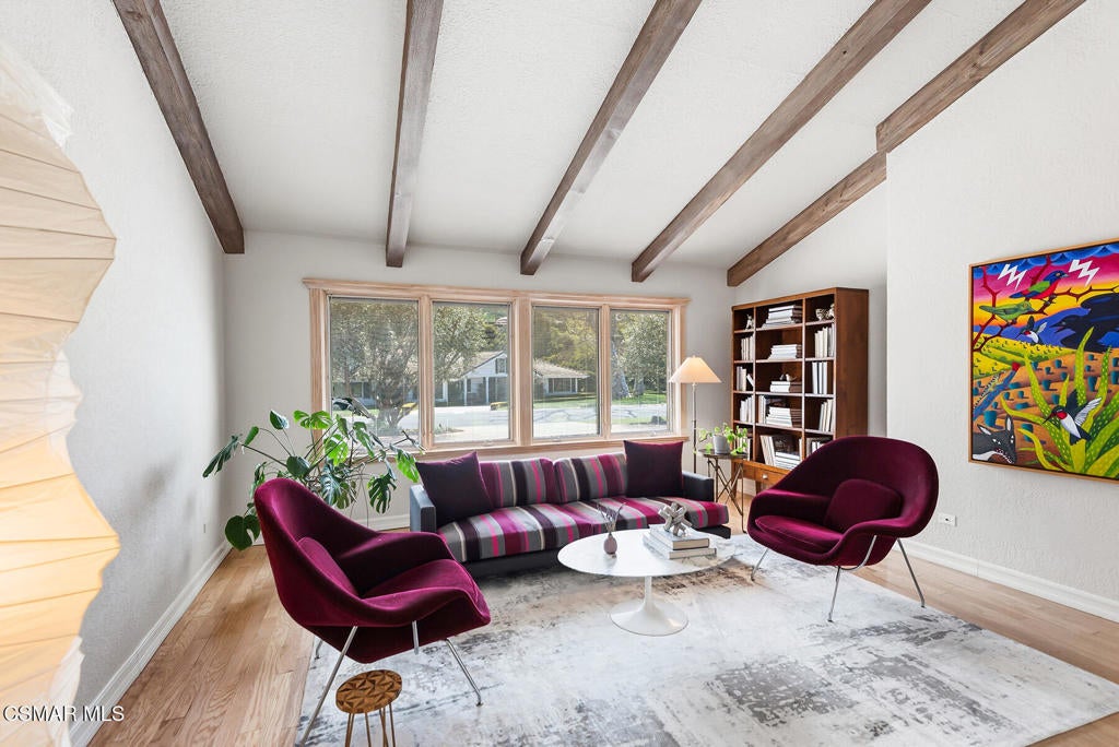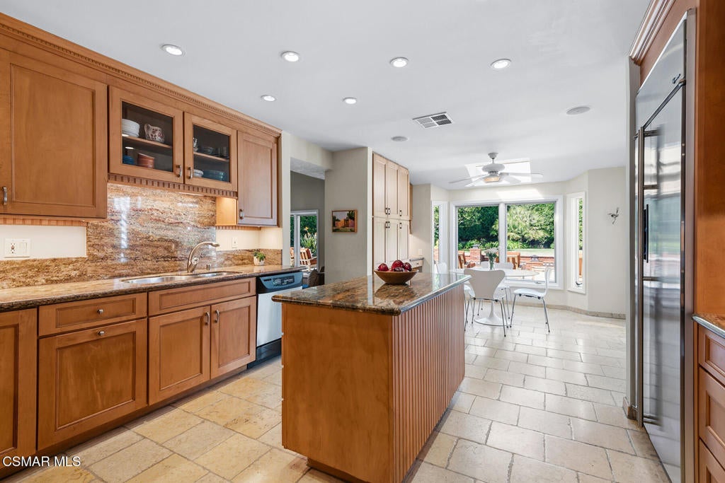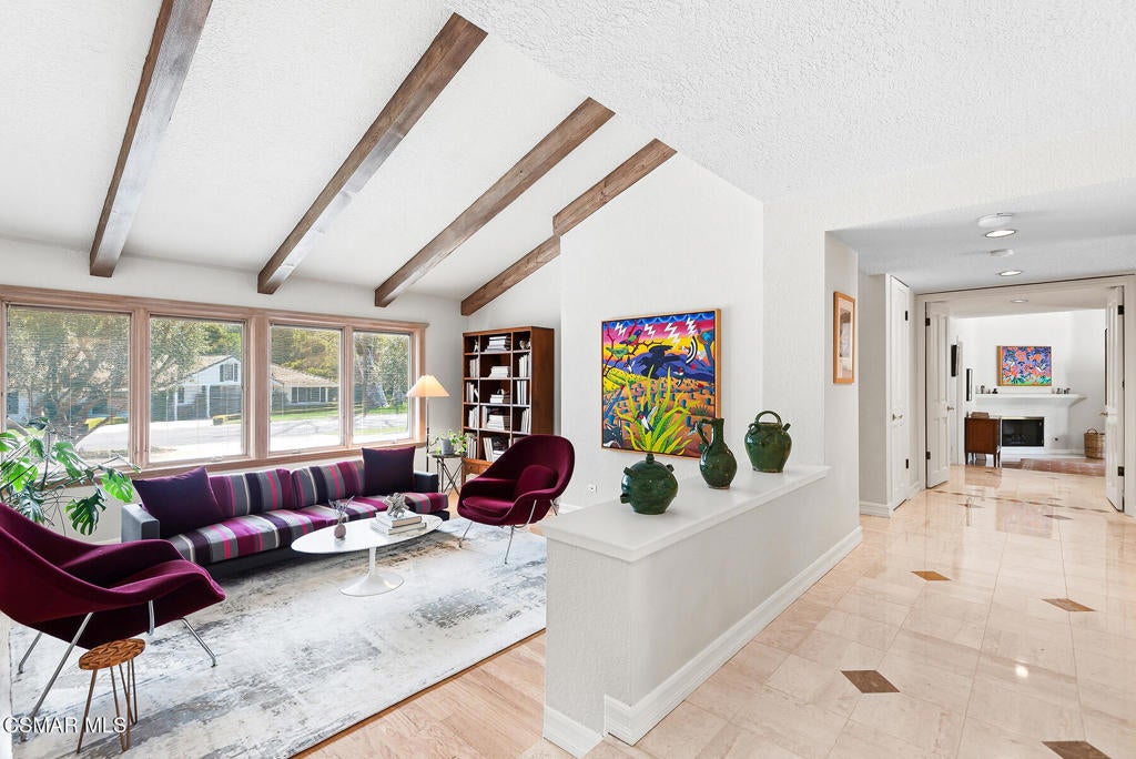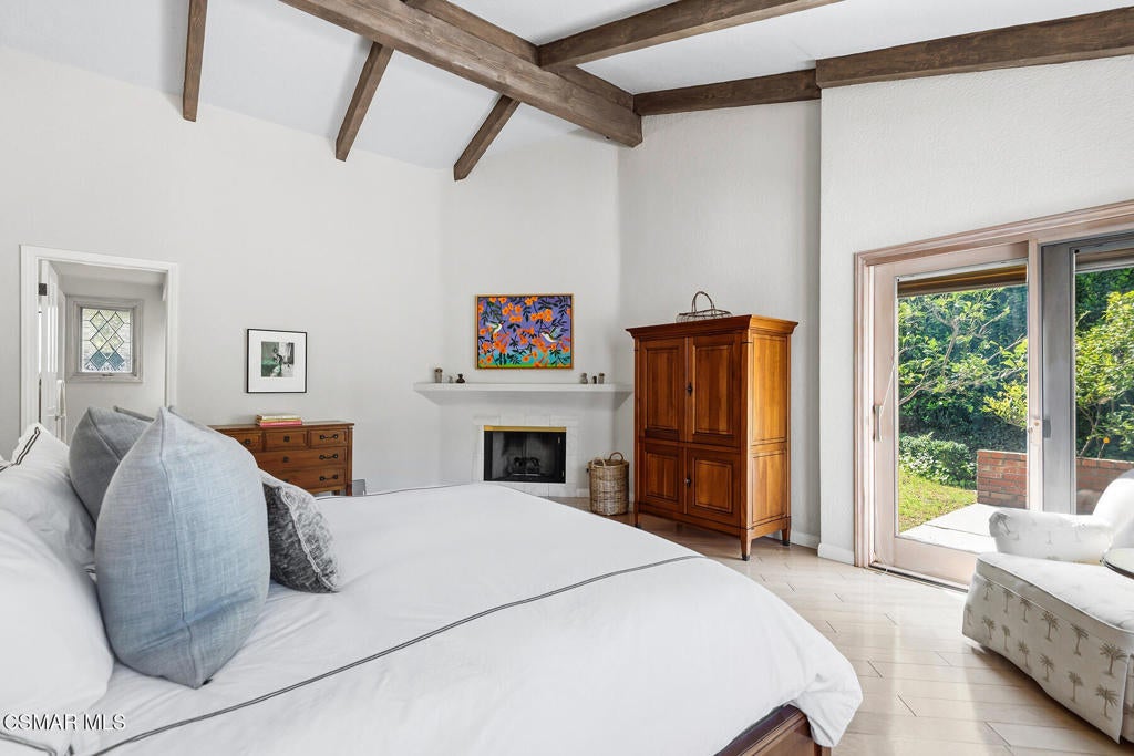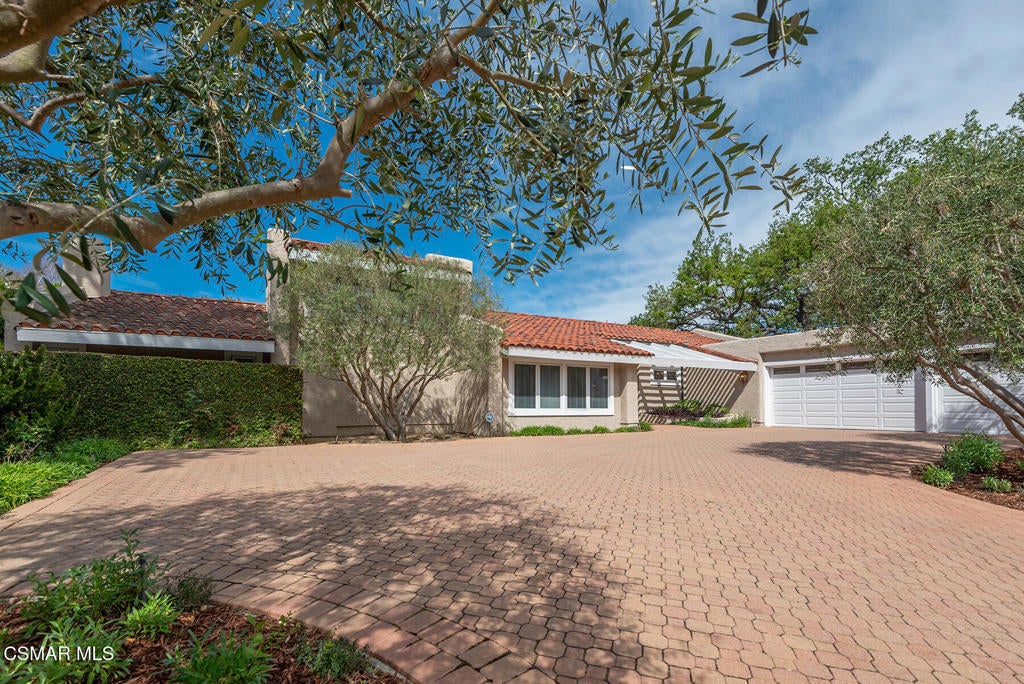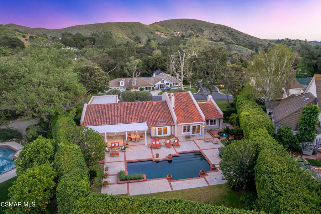 Welcome to 4011 Cresthaven Drive, a beautiful single-story California ranch estate set on a rare flat 0.48-acre lot in the heart of Westlake Village's coveted North Ranch. With 3,371 square feet of thoughtfully designed living space, this four-bedroom plus loft residence offers an extraordinary blend of warmth, character, and resort-caliber outdoor living.A beautiful interlocking paver driveway framed by mature olive trees and a three-car garage make a quiet first impression -- one that carries through the moment you step inside. Marble floors with inlaid detail, beamed ceilings, and an easy flow from the entry through the formal spaces set the stage for everything that follows.The formal living room at the front of the home is warm and inviting, with exposed wood beams and a wall of windows overlooking the manicured front grounds. The separate family room commands attention with soaring vaulted wood-beamed ceilings, a dramatic full-height brick fireplace, and direct access to the backyard. A dedicated dining room with a statement chandelier, windows, and garden views makes entertaining effortless.The chef's kitchen features custom Schuler cabinetry with pull-out shelving, granite countertops and backsplash, a built-in refrigerator, double oven, and a central island with integrated wine storage. A sun-filled breakfast nook with direct patio access completes the space and makes it the perfect spot to start the day.The primary suite is its own private wing, offering vaulted beamed ceilings, a serene fireplace, dual closets, with direct access to the backyard. The primary ensuite bathroom features custom Schuler cabinetry and is thoughtfully appointed to match the quality found throughout the home. Three additional bedrooms occupy the opposite wing, served by a shared bathroom and a hallway bathroom convenient for guests. A versatile loft with stunning wood-plank and beam ceilings rounds out the home as an inspiring office or flex space.Wood Pella windows and sliding doors are found throughout.Step outside and discover what truly sets this property apart. The resort-style backyard is an entertainer's dream, reminiscent of a Santa Barbara-inspired spa. A saltwater pebble-tec pool and separate spa anchor the outdoor space, surrounded by a thoughtfully designed brick and concrete patio with inlaid brick detail, a covered pergola ideal for al fresco dining, and lush mature landscaping including two lemon trees, a lime tree, and an orange tree. A mature privacy hedge encloses the entire rear yard, creating a sense of seclusion and privacy rarely found this close to everything Westlake Village has to offer.