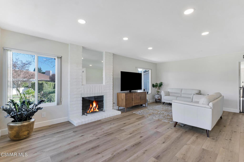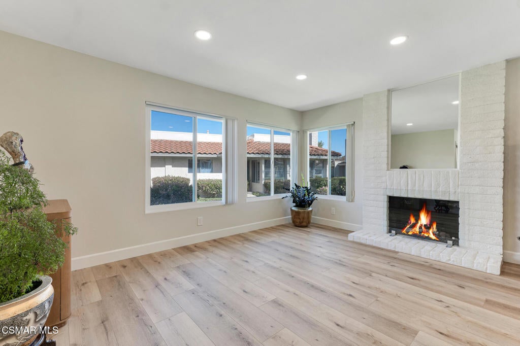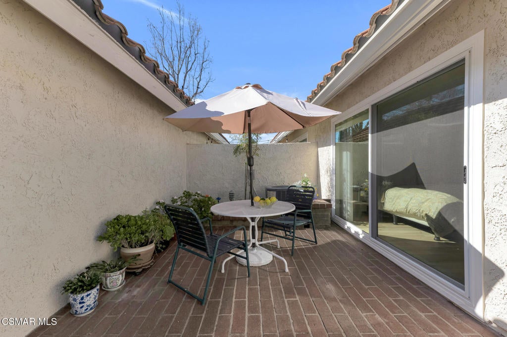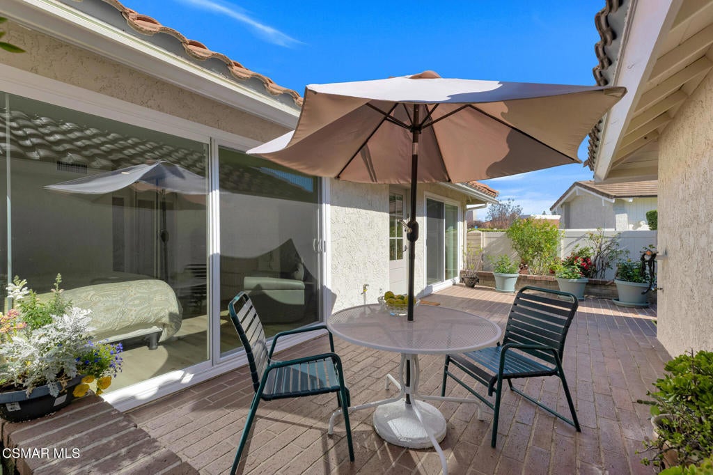 Welcome to this wonderful single-story, 2-bedroom, 2-bath end-unit condo in the desirable Triunfo West community. Enter from the peaceful greenbelt setting into a bright and inviting home designed for comfortable everyday living.As you step inside, you're welcomed into the light-filled living room featuring multiple windows and a cozy gas fireplace. Just beyond, the kitchen offers granite countertops, white cabinetry, a breakfast bar with counter seating, and convenient indoor laundry nearby. Continuing through the home, the dining area sits just off the kitchen and opens directly to the backyard, creating a natural transition to outdoor living.The spacious primary suite offers a relaxing retreat with an ensuite bathroom featuring quartz countertops, generous counter space, two closets, a walk-in shower and separate water closet. The guest bedroom is well-sized with mirrored closet doors, and the guest bathroom also features a quartz countertop. Ample hallway storage provides excellent space for organization.The dining area leads directly to the private back patio, complete with pavers and a mature lemon tree. This easy, low-maintenance outdoor space is perfect for relaxing and also provides direct access to the attached two-car garage.Recent upgrades include luxury vinyl flooring with a wood-like finish, newer windows, fresh interior paint, and recessed lighting in the living room.Triunfo West residents enjoy two community pools and a fantastic location near the lake, restaurants, shopping, and everyday conveniences. The home is also conveniently located near the community pool and guest parking, making it easy for both residents and visitors to enjoy the neighborhood.