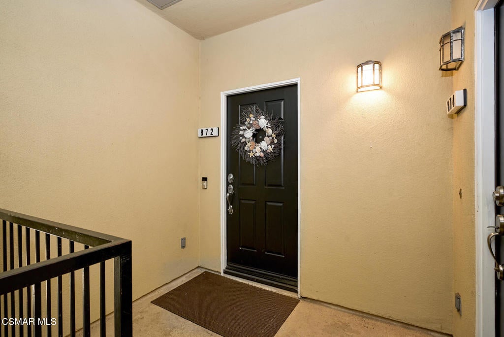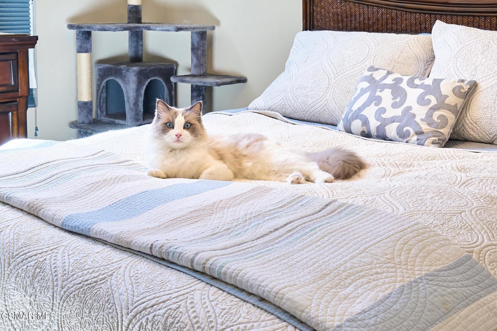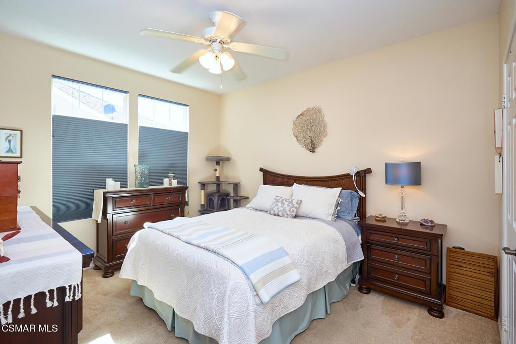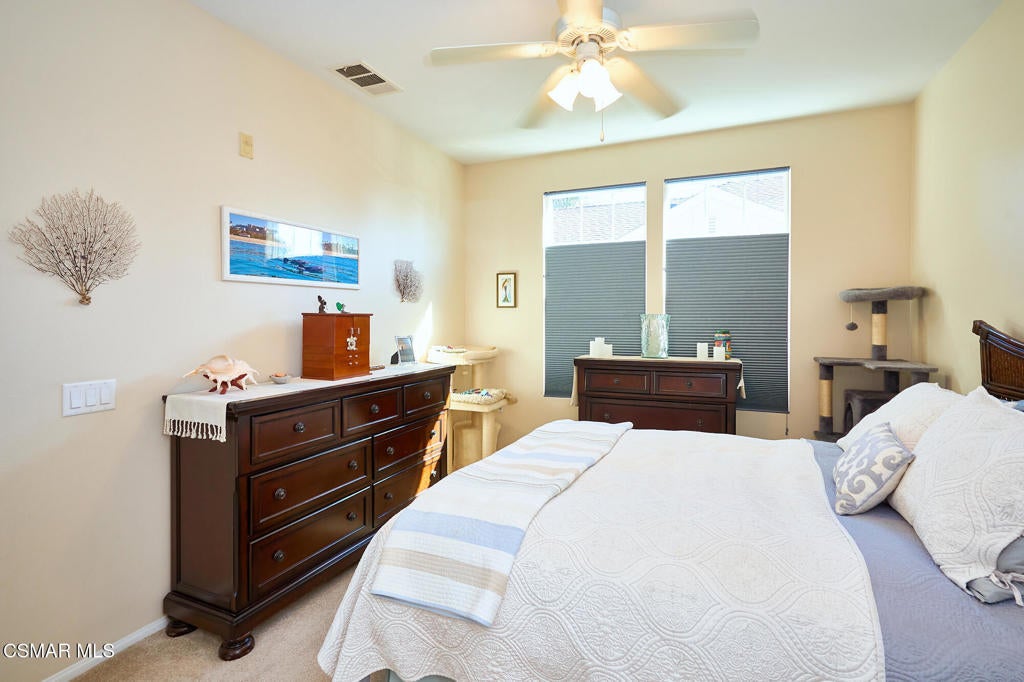Here's the light and bright upstairs 2+2 Harmony townhome you've been waiting for! Best location in the complex overlooking a tree lined walkway. Living and dining area open to an entertaining deck. Sunny and spacious with plantation shutters and the relaxing deck to enjoy Ventura's gorgeous weather. Step into the lovely entry of the cook's kitchen. Large workspace and cabinets, stainless appliances, which includes a refrigerator and a pantry! Newer laminate flooring and baseboards, new window treatments thru out including new shades in master bedroom. The primary bedroom suite is located off the living area. Features include a generous walk-in closet and en suite bath with an over sized bath tub. The secondary bedroom has a walk-in closet and is off the entry and closely located to the full bath. The hallway has a newer included GE stackable washer/dryer! Perfect wing for guests or roommates! There is central heating and all rooms have ceiling fans. Considerable amount of storage inside and off the deck and you're sure to enjoy the attached single car garage with opener. Old Republic home warranty in place and included. This beautifully maintained community has a reasonable HOA which includes trash, fire and earthquake insurance, exterior building maintenance, painting, pest control and roof. Ideally located just a couple of blocks from the Ventura Co Government Center, Thille Park, 101 & 126 Freeway access, and just minutes to Ventura's glorious surfing, marina and beaches, and a few miles to Ventura's historic downtown cultural district and funk zone. Walkable to shopping, restaurants, banking and more! Hurry and see this soon!!