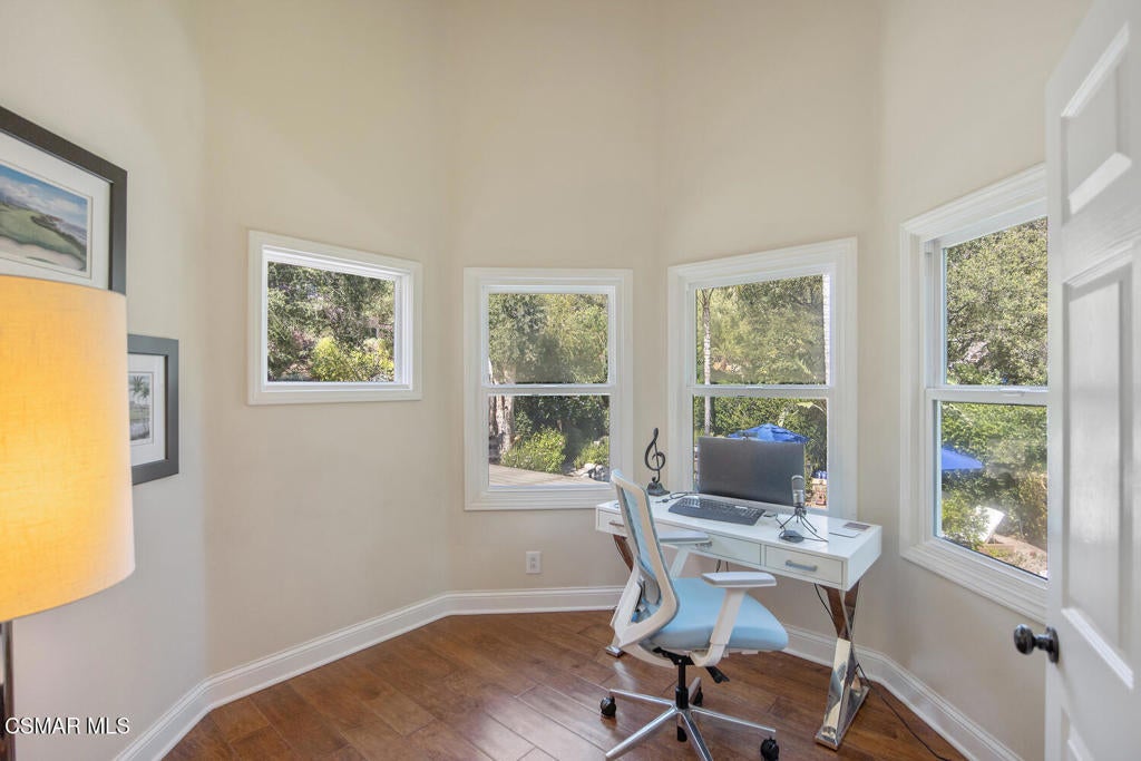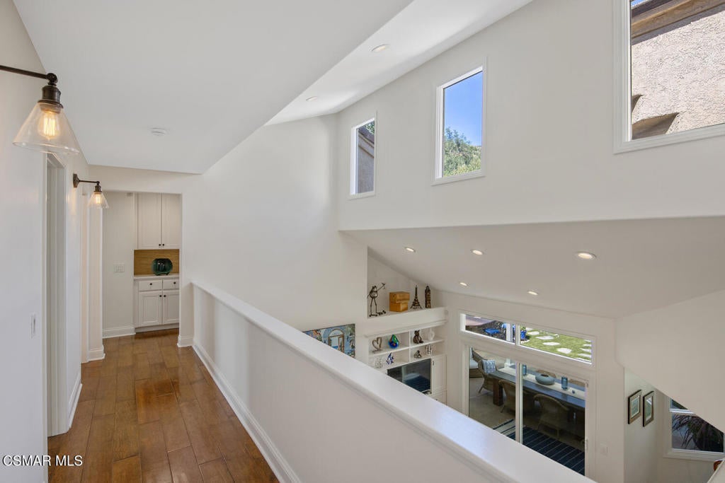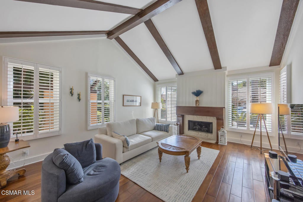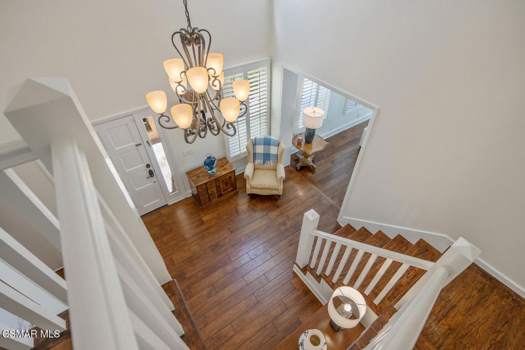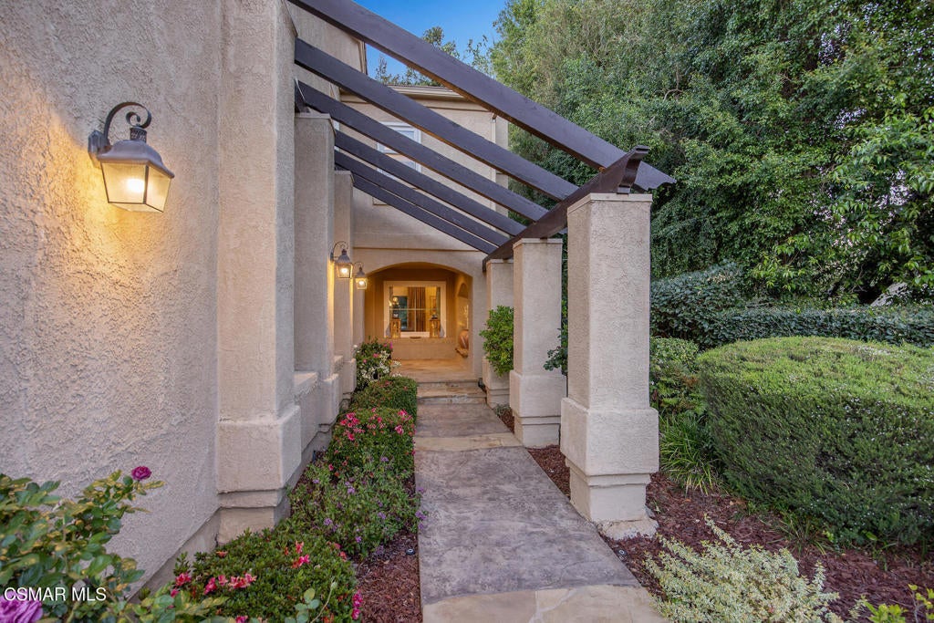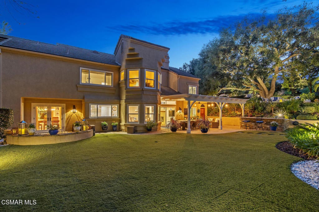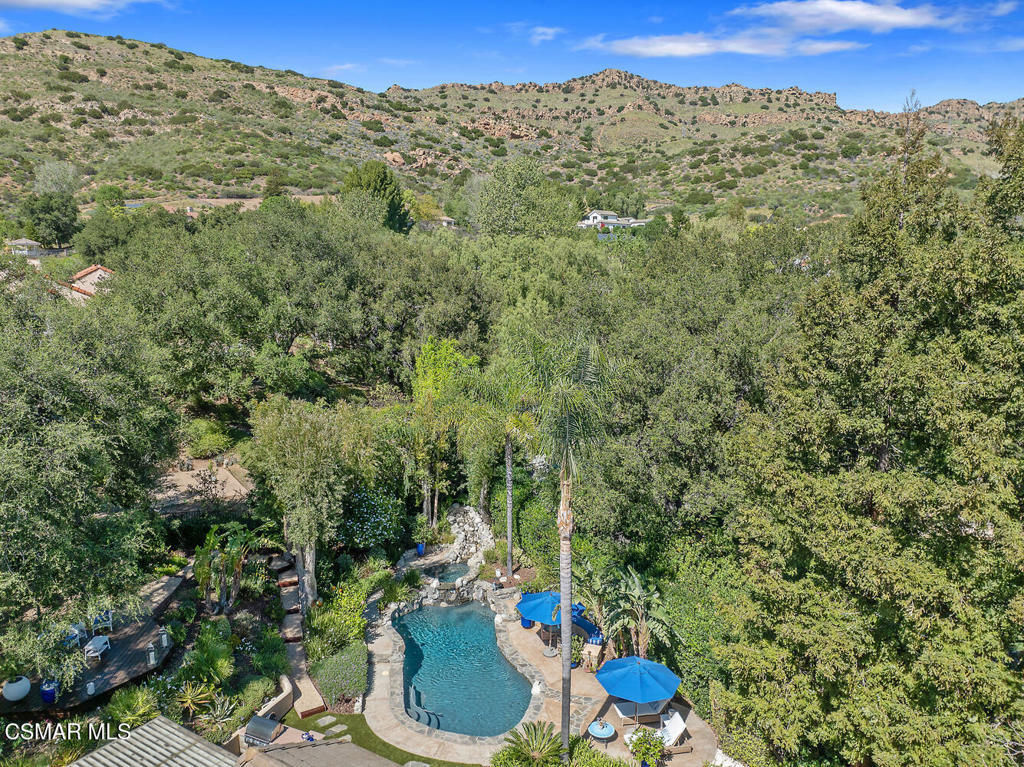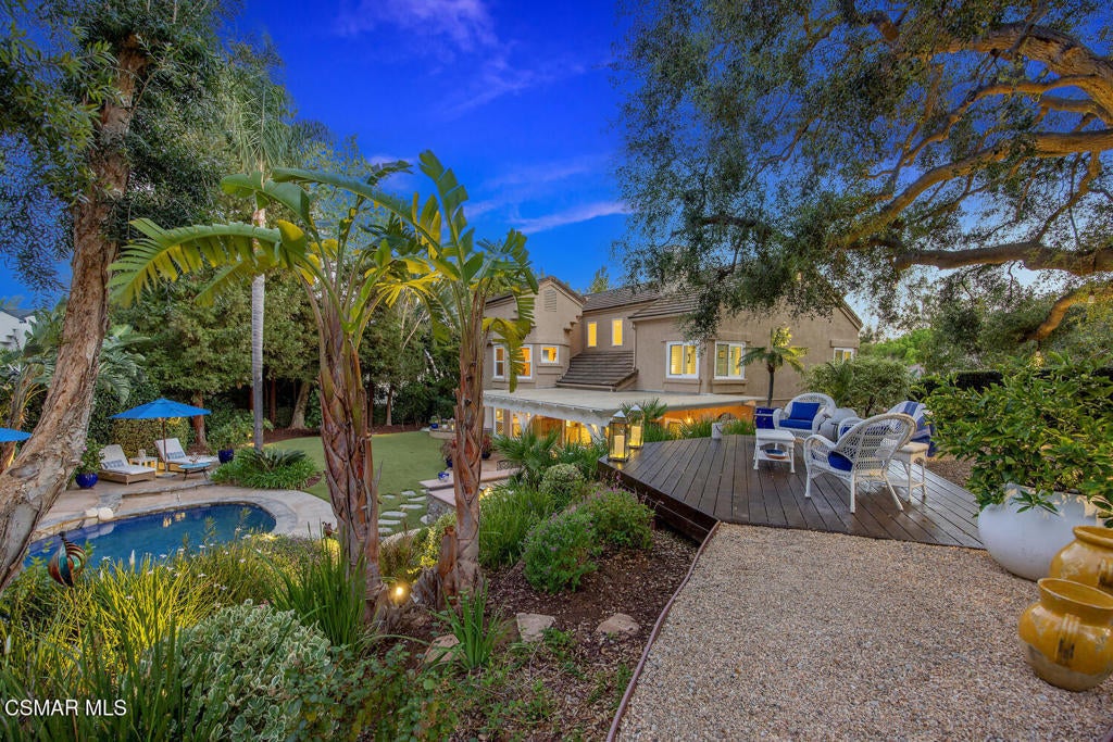 Stunning two-story home on a cul de sac with privacy and impressive curb appeal! Home offers 5 spacious bedrooms, 3 baths and a powder room, perfectly blending comfort and sophistication. Interior highlights include wood floors, soaring ceilings with wooden beams, abundant natural light, recessed lighting, large baseboards, newer windows, ceiling fans, plantation shutters, and recently painted interior. Light filled kitchen features stainless steel appliances including built-in refrigerator, Wolf oven/range, dishwasher, microwave, granite countertops, center island with seating, newer lighting, plenty of storage, and breakfast nook offering serene backyard views. Kitchen opens to the family room with built-in wall unit, fireplace, and high ceilings. Downstairs includes a large living room with fireplace, high ceilings, separate formal dining room, bedroom with updated bath, and a beautiful powder bath. The laundry room has a sink and includes the washer and dryer. Upstairs, the primary suite features a large walk-in closet with center cabinet, adjacent sitting room/office, and an exquisite bath with soaking tub, marble shower, and custom vanity with dual sinks. Three additional bedrooms and hall bath complete the upstairs. Set on spectacular grounds, the property is highlighted by a majestic oak tree, drought tolerant landscaping, and thoughtfully designed outdoor lighting that creates a warm and inviting ambiance. The backyard is a true retreat, featuring a sparkling pool, spa, waterfall, deck, several patio areas ideal for entertaining, artificial grass, and gorgeous plantings that provide both beauty and privacy. Built in BBQ w/bar counter and refrigerator. Patio overhang with heaters allows for year-round outdoor enjoyment.Three car garage with ample storage.A rare opportunity to enjoy picture-perfect indoor-outdoor living in an elegant, magazine worthy setting. With its generous living space and incredible outdoor setting, this home offers the perfect blend of luxury, casual elegance, and comfort. North Ranch living at its best!