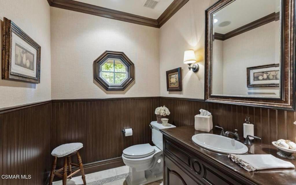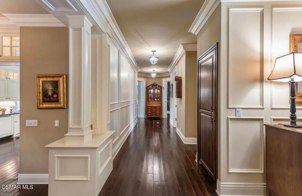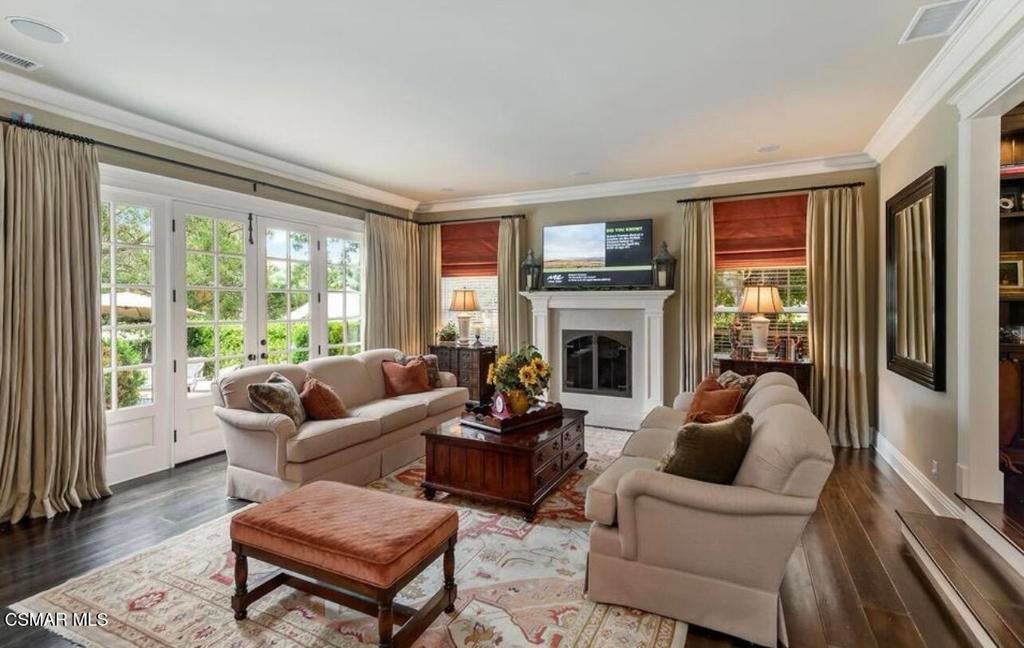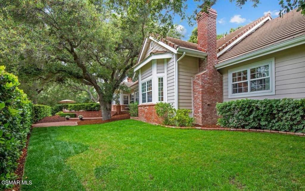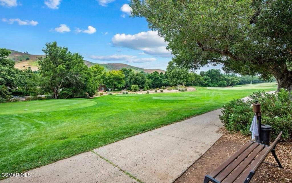 Fabulous custom, single-story home located on the 6th tee of the North Ranch Golf Course. The home features dark wide-plank wood flooring with substantial 6'' moldings, creating a Hamptons-inspired theme that blends East Coast style with Southern California living. The kitchen is equipped with rich brown Caesarstone, a large island with decorator pendant lighting, custom furniture-finish cabinetry, a Wolf range, a Sub-Zero fridge, and an original Shaws farm sink. An adjoining family room creates a popular open-concept layout. Both rooms overlook a backyard that includes lush landscaping, a pool, a patio, and golf course views. Additional highlights include: Dining room and adjoined den/study with lavish custom built-in cabinetry. Ensuite bathrooms for every bedroom. A large utility room with French doors and extensive storage.Exquisite details such as three fireplaces, widened hallways, and raised door frames proportioned to the soaring ceilings. High-end finishes including 1 3/4'' solid doors, wainscoting, elaborate millwork, a Sub-Zero wine fridge, a steam shower in the master bath, and custom closet details. Located on a quiet cul-de-sac, this home offers unsurpassed quality and finish. While the photos are lovely, they truly cannot capture the full charm of this property.