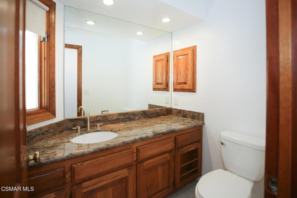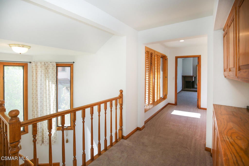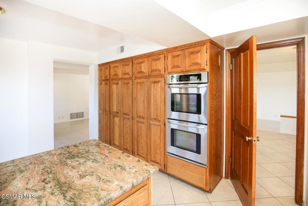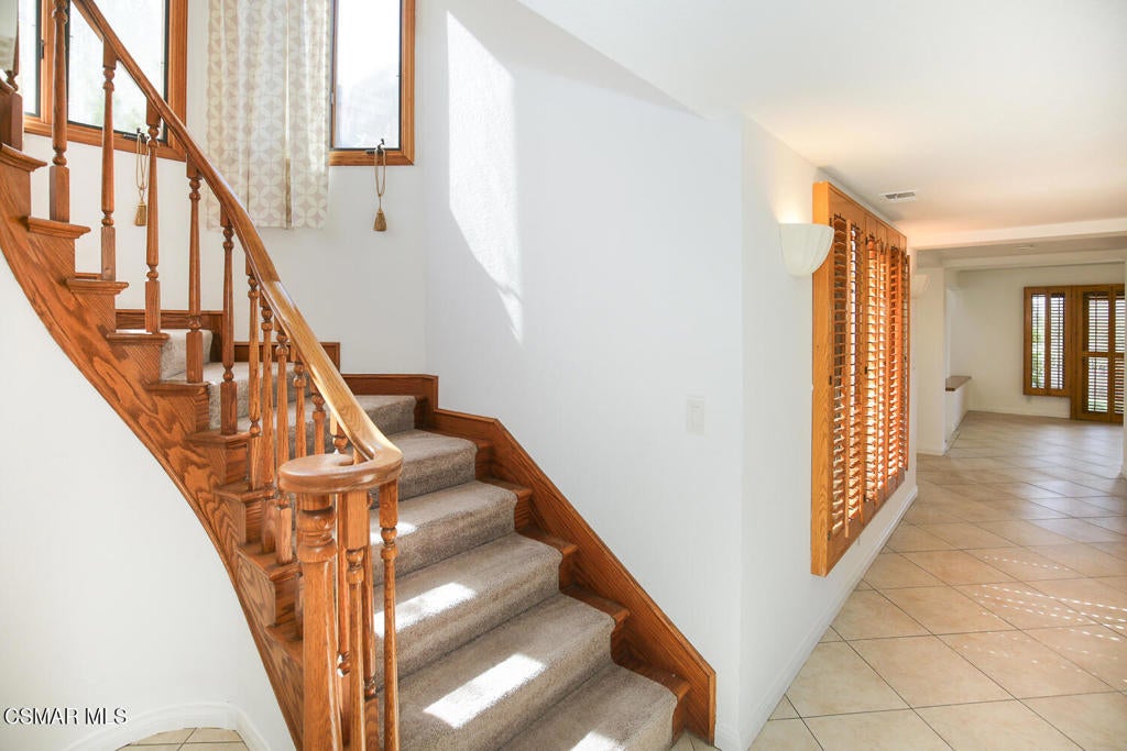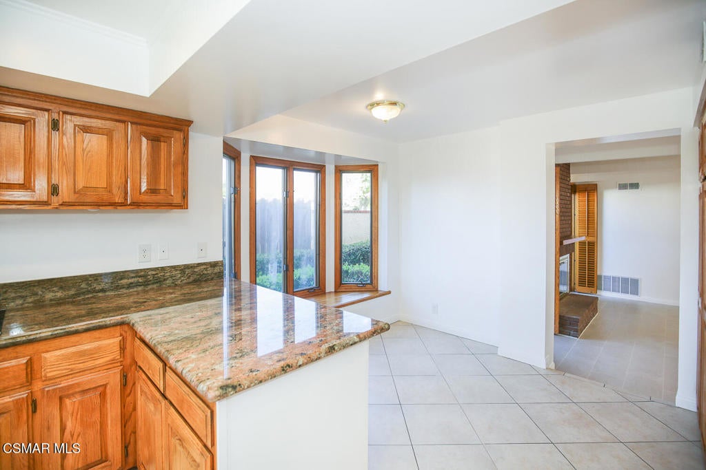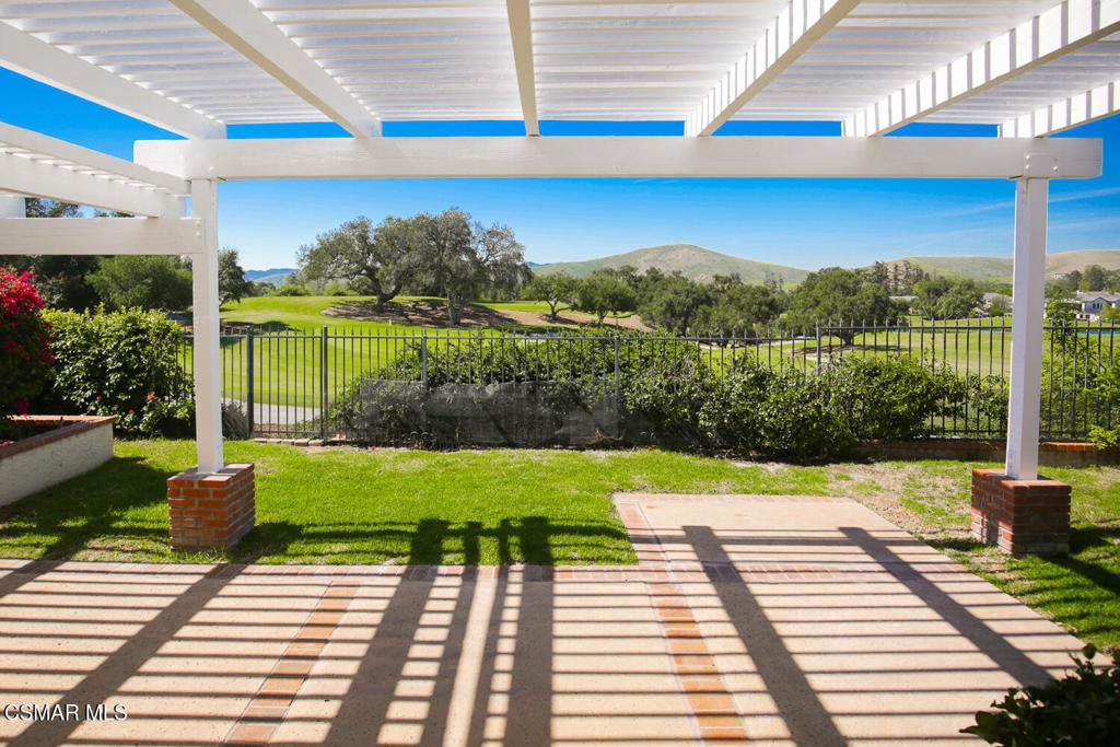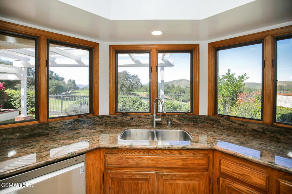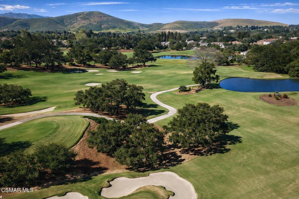 Unobstructed Views of Golf Course and Hills of North Ranch Country Club. This unique home with formal living room has high ceiling, French doors, and opens to formal dining room with serene views of Golf Course. Spacious kitchen with Granite Counter tops, plenty of counter space and a roomy breakfast area with huge bay window. Family room with wet bar and fireplace perfect for entertaining also with sliding doors open to nice patio. A winding staircase takes you to four nice sized bedrooms. Master suite with fireplace, large walking closet, step down sitting room and huge balcony to enjoy beautiful view of Golf Course. House has some window shutters. Newer Clay Tile Roof and 3 car garage door. Kitchen has a dishwasher, double oven. Close to award winning schools.