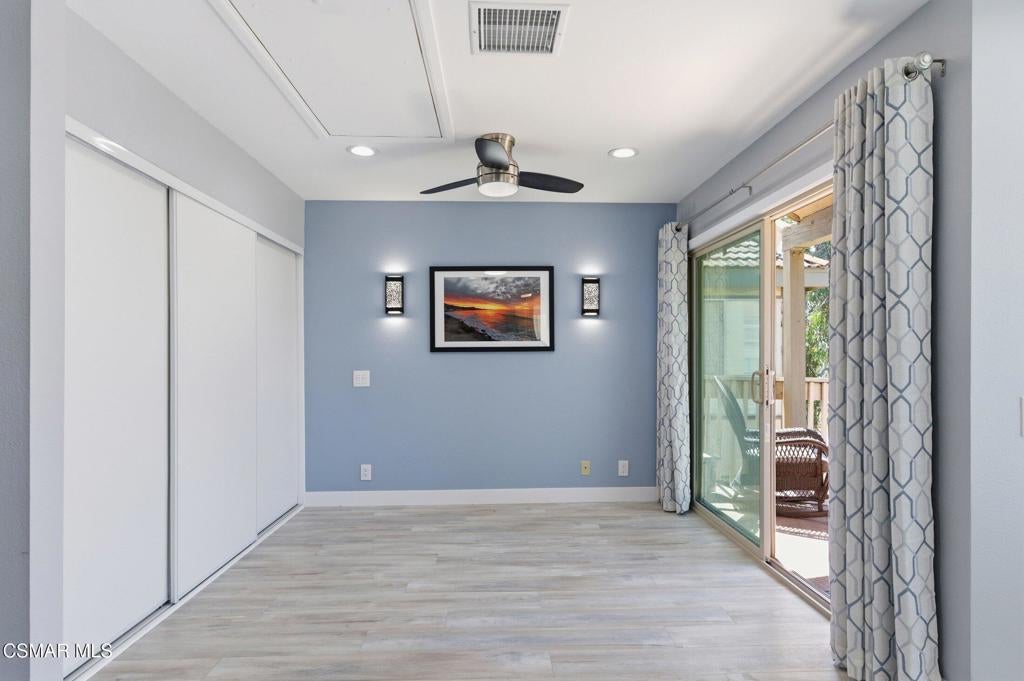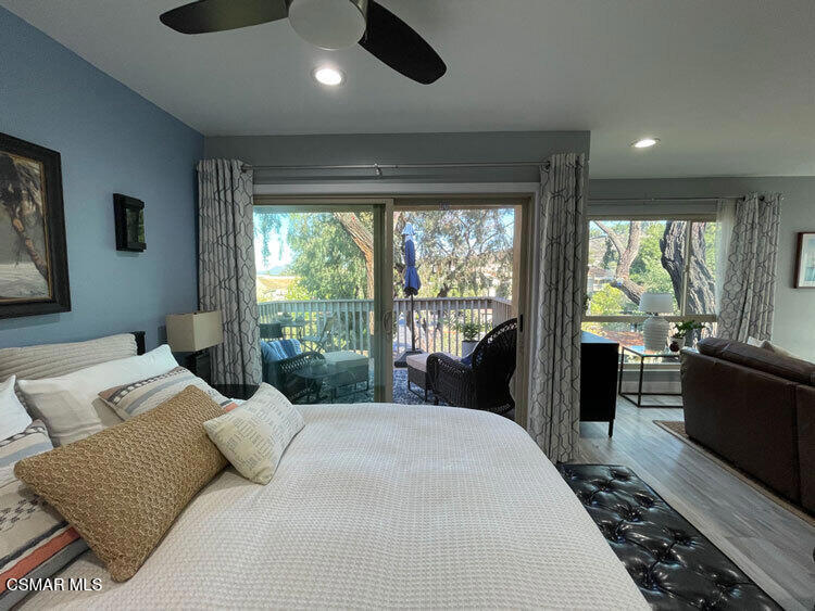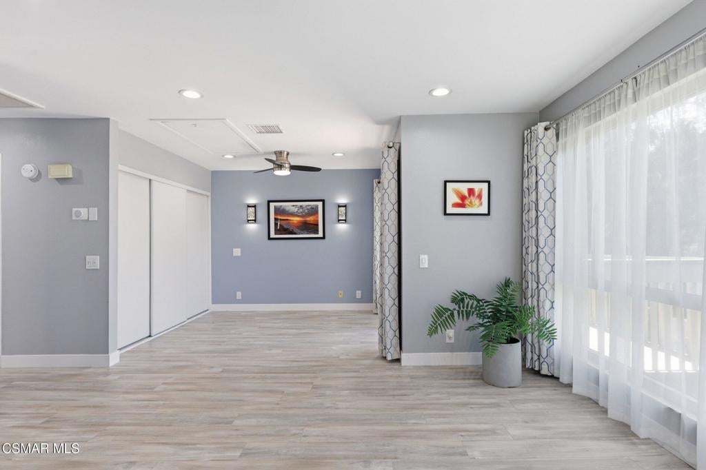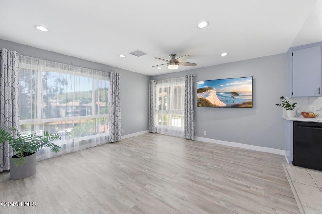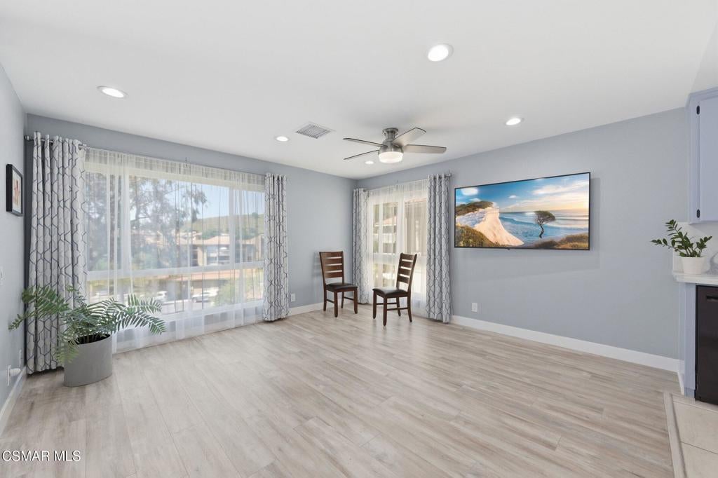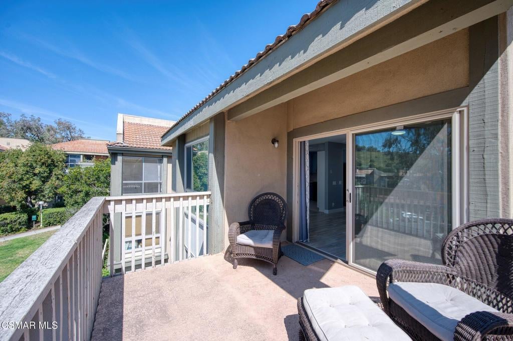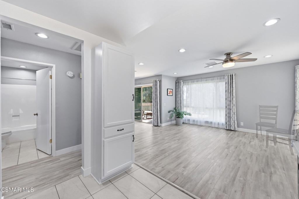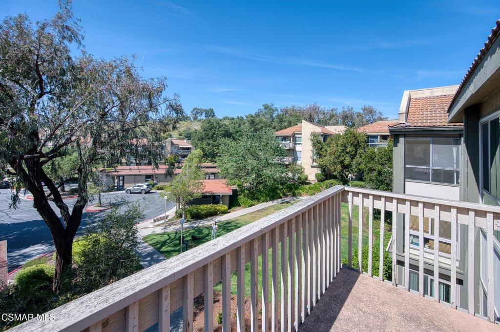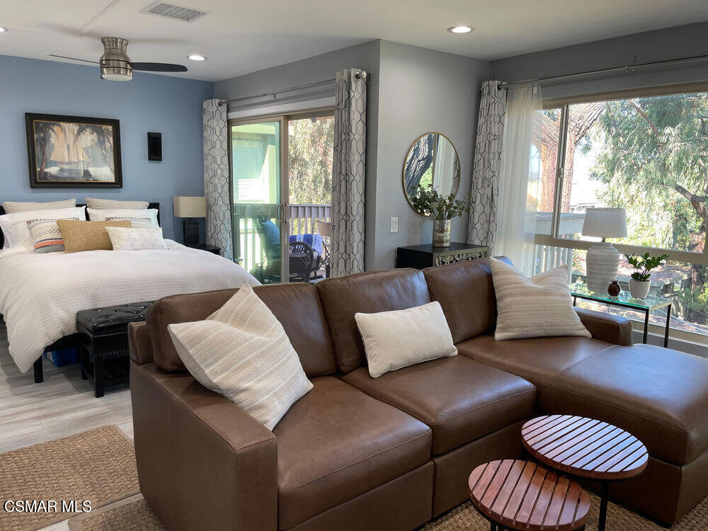 A beautiful penthouse, one of Oak Knoll Villas finest for age 55 or better, is perched on the 3rd floor with elevator access. This updated studio offers a rare sense of privacy with no adjoining walls creating a peaceful retreat that truly feels like your own sanctuary. Bathed in natural light and surrounded by treetop views and serene balcony access. The home features wide-plank luxury vinyl flooring and a fresh, modern palette throughout. The open-concept layout provides flexibility for comfortable living and effortless entertaining, while the private balcony invites you to relax and unwind in a tranquil, natural setting. The living area includes a flat-screen TV, and the thoughtfully updated kitchen has quartz countertops, light cabinetry, and upgraded appliances, including a refrigerator. The remodeled bathroom, newer HVAC system, ceiling fans, recessed lighting and updated windows and sliding doors ensure both style and comfort. Set within a vibrant 55+ community, residents enjoy an array of resort-style amenities including a pool and spa, clubhouse, fitness center, game room, billiards, library and business center. One covered parking space is available with storage too. Ideally located near premier shopping, dining, scenic botanical gardens, and miles of hiking trails--with convenient freeway access--this home offers the perfect blend of tranquility and an active, connected lifestyle in the heart of Thousand Oaks. Owner Prefers No Pets. Applicants must use RentSpree.