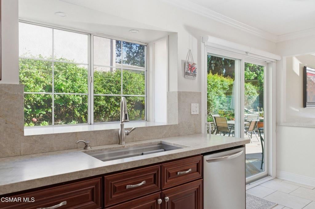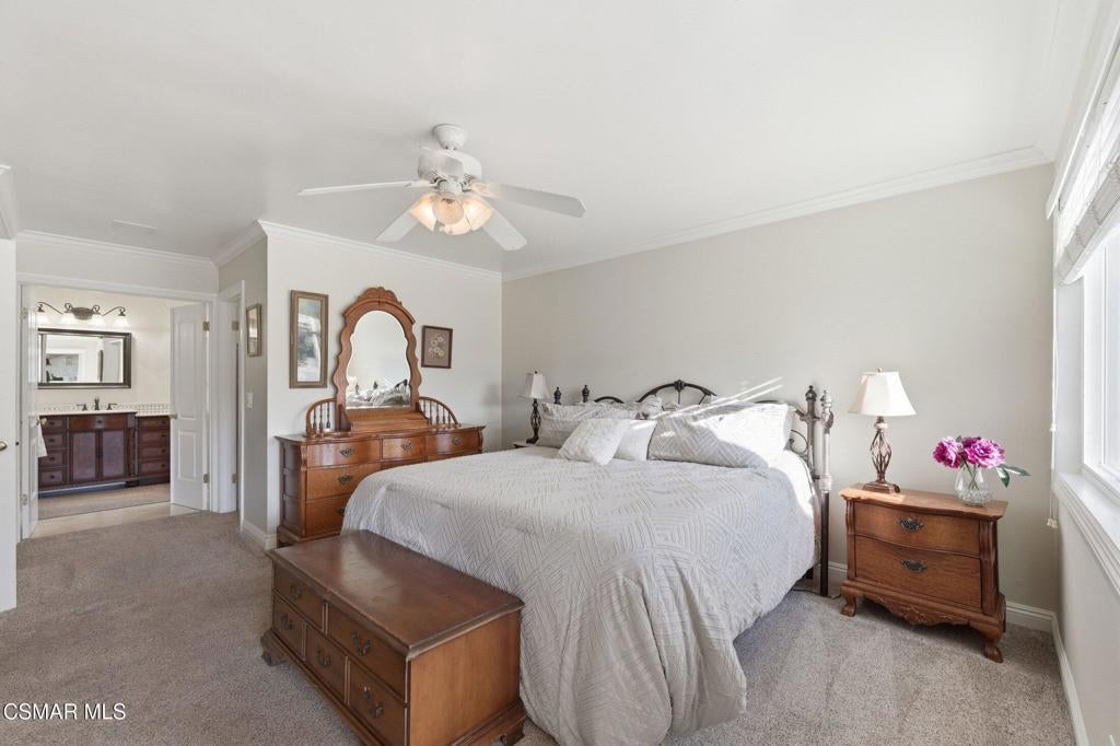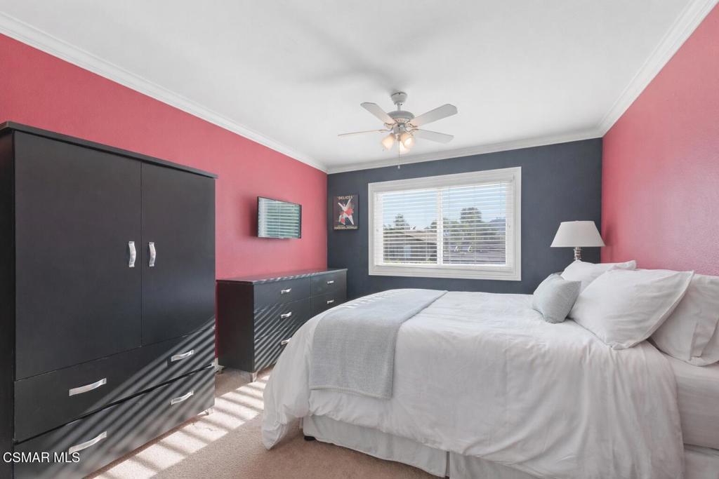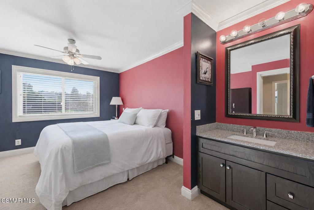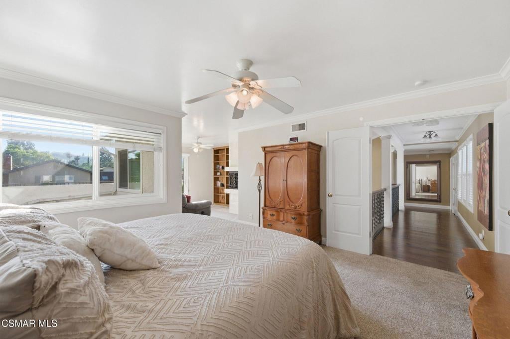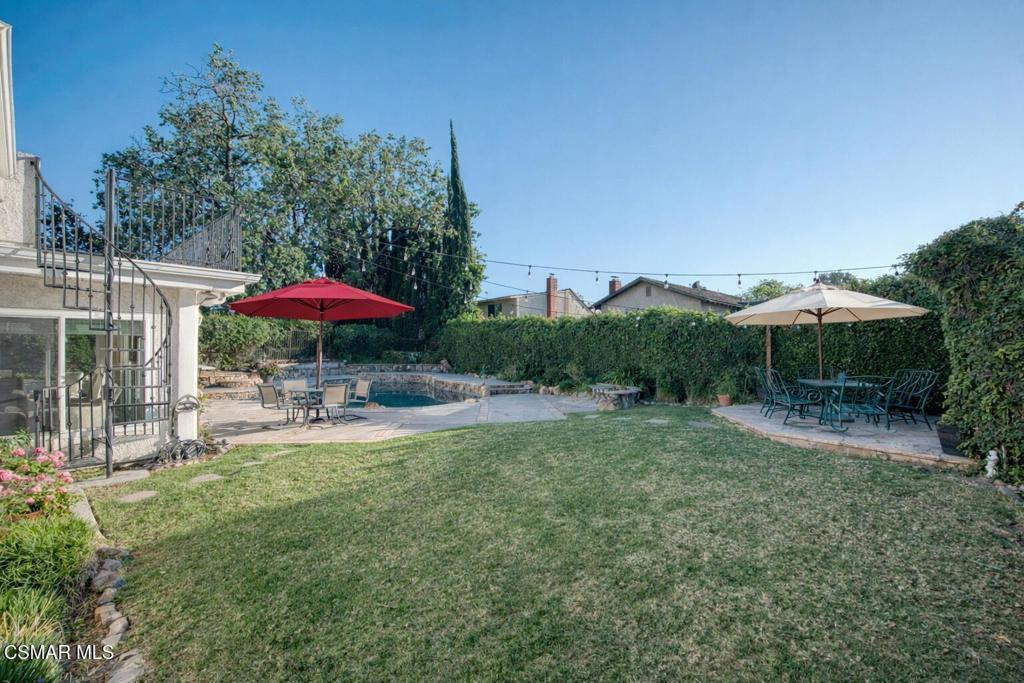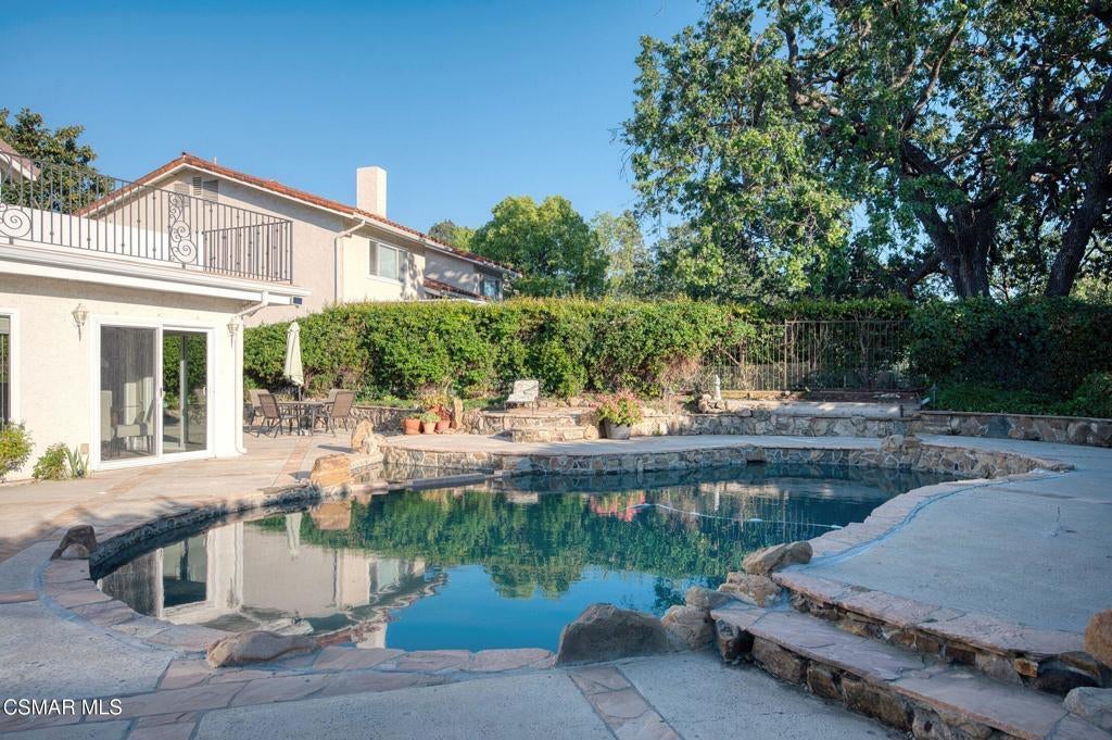 Rarely does a home like this come to market in the highly sought-after Village Homes community of Westlake Village.This exceptional five-bedroom, approximately 3,200 sq. ft. residence offers one of the most desirable and functional floor plans in the neighborhood--featuring two spacious bedrooms on the main level, ideal for guests, a private office, or a dedicated fitness space.From the moment you enter, you're greeted by soaring ceilings and a reimagined, one-of-a-kind staircase--an architectural statement you simply won't find anywhere else in the community. The home has been thoughtfully designed for both everyday living and elevated entertaining, highlighted by a stunning chef's kitchen with custom cabinetry that seamlessly opens to an expansive great room filled with natural light.A large multipurpose room--currently styled as a billiards and gathering space--adds incredible versatility, perfect for entertaining or relaxing with family and friends.Upstairs, the primary suite is nothing short of spectacular. This oversized retreat features dual walk-in closets, a gorgeous sitting room with its own fireplace, and double doors that lead to an expansive private deck. From here, take in breathtaking mountain views overlooking a rare, seemingly endless backyard--an offering that is virtually unheard of in Village Homes.The outdoor experience is equally impressive. Designed for both grand entertaining and intimate evenings, the backyard showcases a sparkling pool and spa, multiple lounge and dining areas, ambient twinkling lights, and an exceptional sense of privacy--creating a true resort-style atmosphere under the stars.Completing the property is a gigantic three-car garage, beautifully maintained low-maintenance landscaping, and stunning curb appeal that makes a lasting first impression.All of this is just minutes from the very best of Westlake Village, including premier shopping, dining, and recreation, as well as The Lake. The home is also located within a top-rated school district, with the brand-new Oaks Christian Elementary campus set to open in September 2026.If you've been waiting for something truly special... this is it.