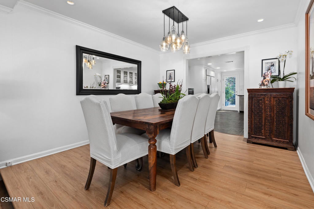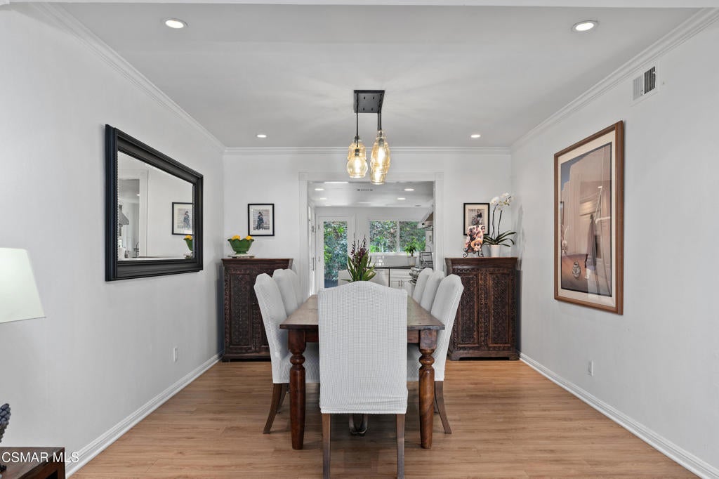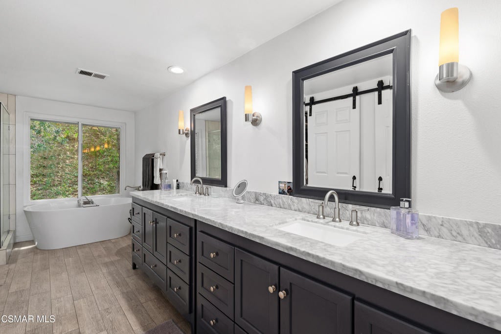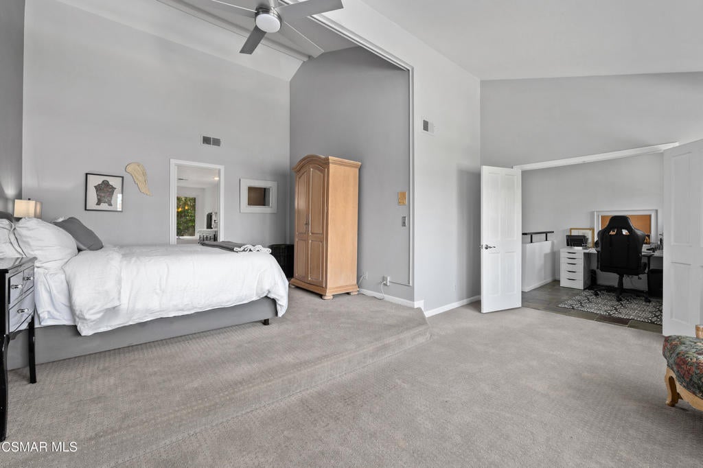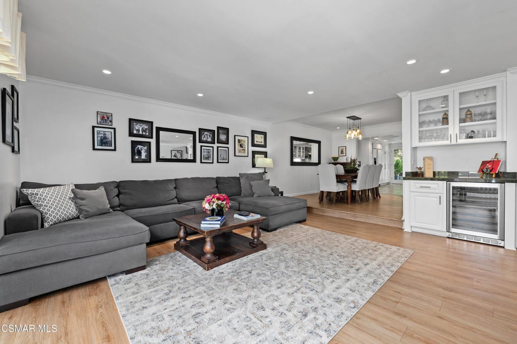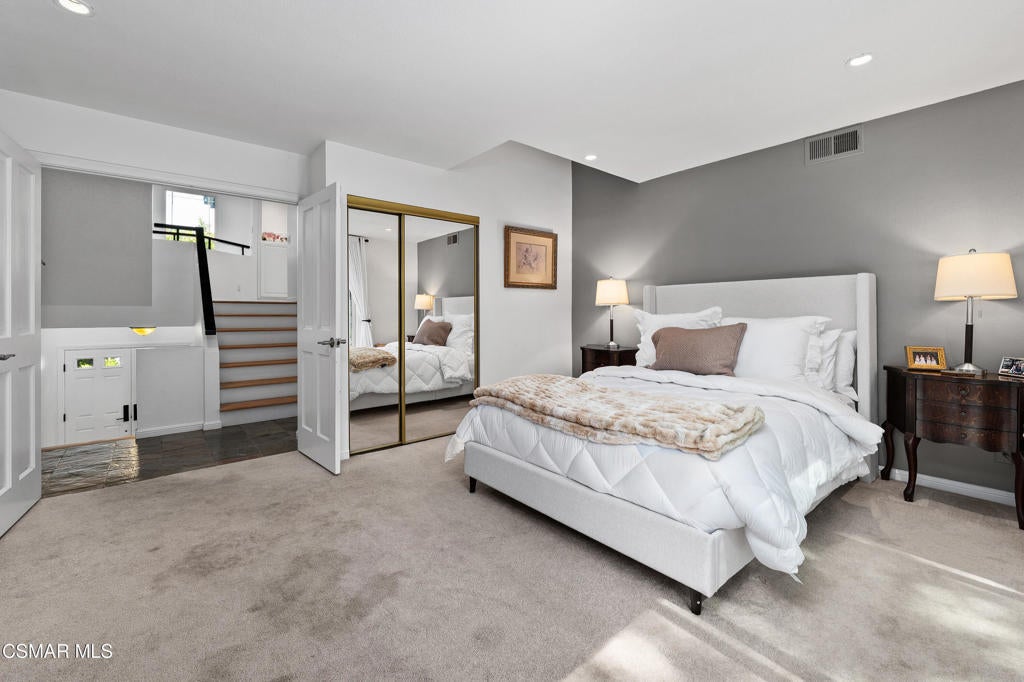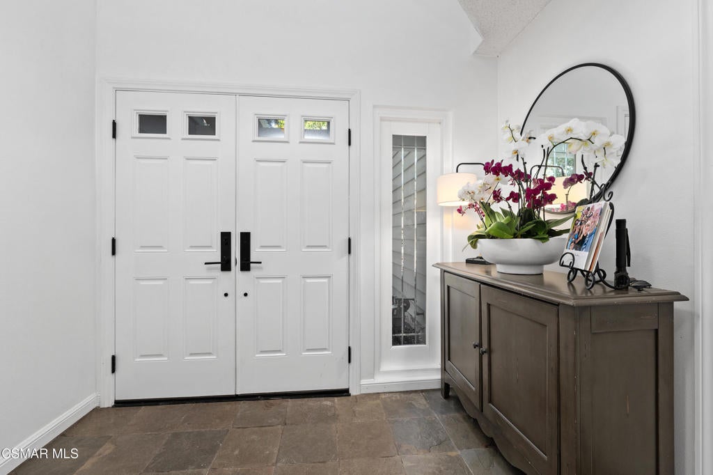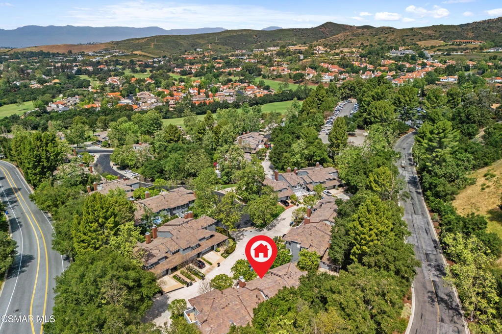 Welcome to this stunning, updated North Ranch townhome, ideally situated in a serene and highly desirable location. A beautifully landscaped front yard introduces an inviting double-door entry to the foyer, ideally situated with seamless access to the garage. Just up a short flight of stairs, you'll find a spacious bedroom or office retreat featuring sliding glass doors that open to a peaceful patio surrounded by mature trees--offering exceptional privacy and tranquility. An adjacent, tastefully remodeled bathroom makes this space perfect for guests or multi-generational living. The main living area showcases an open-concept floor plan designed for both comfort and entertaining. The expansive living room features a cozy fireplace, built-in wet bar and seamless access to a private balcony--ideal for hosting gatherings, enjoying sunset views, or savoring a quiet morning coffee. The adjoining dining area is generously sized and conveniently located next to the kitchen, making entertaining effortless. The remodeled chef's kitchen is both stylish and functional, complete with slate flooring, granite countertops, stainless steel appliances, soft-close cabinetry and a breakfast nook. A direct access door leads outdoors, creating a seamless indoor-outdoor living experience. The oversized primary suite is a true sanctuary, featuring a large sitting area with breathtaking views. The luxurious en-suite bathroom offers an large walk-in shower, soaking tub, dual vanities with marble countertops, and two separate walk-in closets with designer barn doors. Additional highlights include a light-filled loft, a spacious secondary bedroom, and another beautifully updated bathroom. Step outside to a peaceful, multi-level backyard designed for relaxation and entertaining, complete with lush greenery and added privacy. This exceptional home also includes upgraded windows, recessed lighting throughout, an attached two-car garage with built-in cabinetry and a dedicated laundry room. The community offers private roads, six spas, and beautifully maintained grounds, all just moments from North Ranch Country Club. With convenient access to shopping, dining, hiking trails, and major freeways, this home truly has it all.