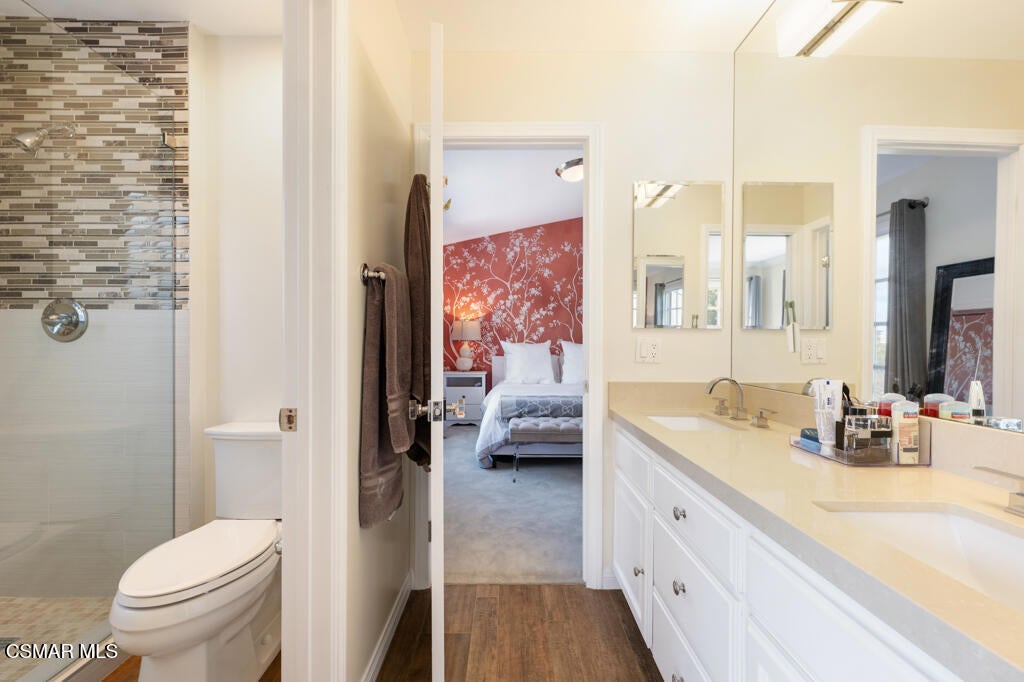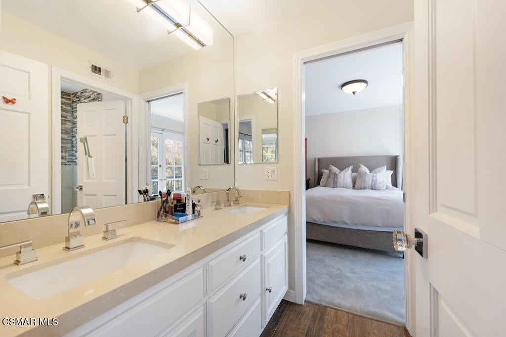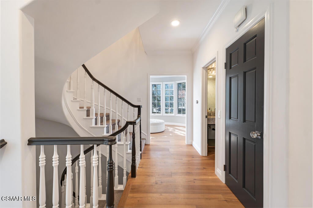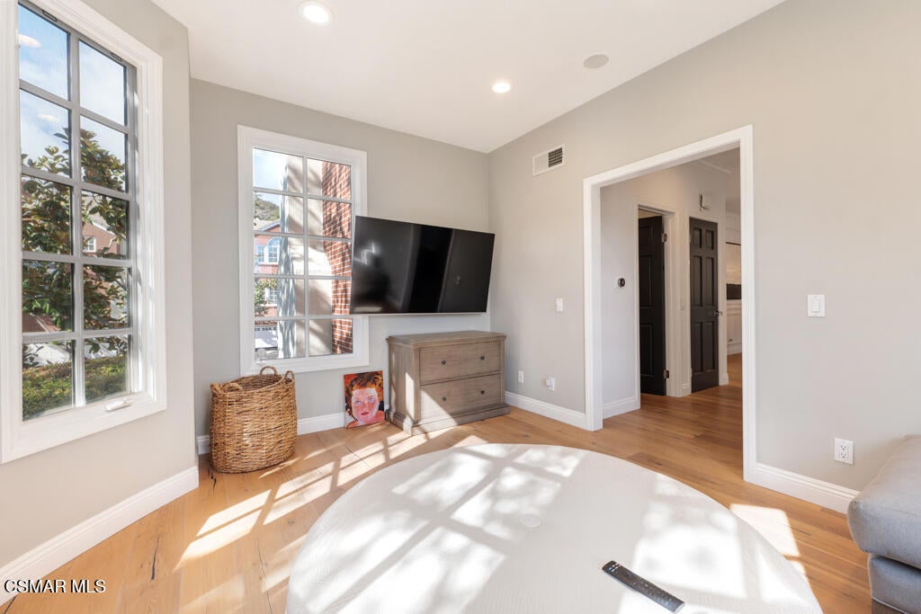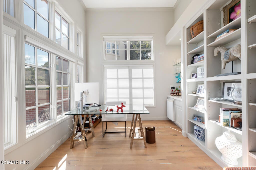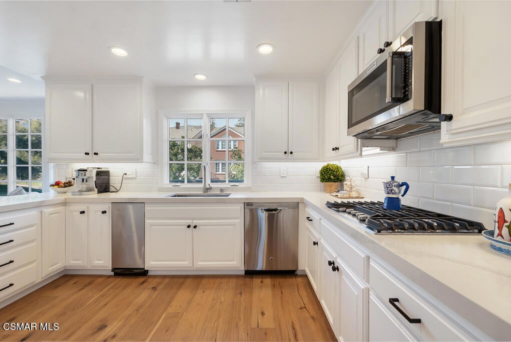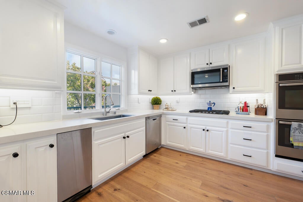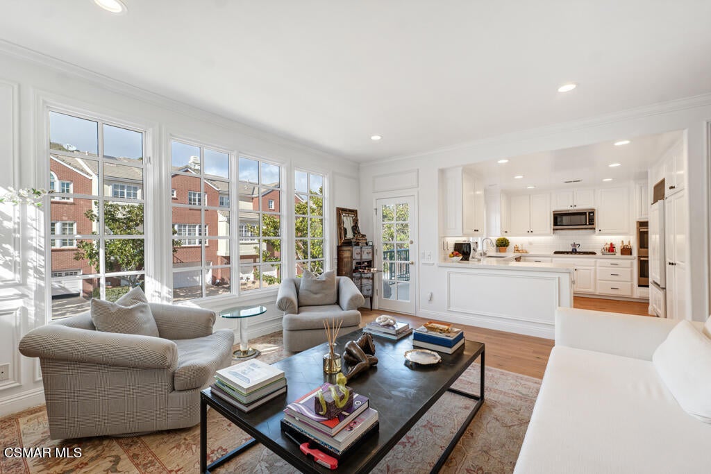 Fully Furnished at $16,995 and available June 1st. Pristine and fully renovated Trentwood townhouse inside the exclusive guard-gated community of Lake Sherwood. Situated on the coveted view side of the street, this home offers breathtaking panoramic views of the club, lake, and surrounding mountains.Please notice every detail, featuring French Oak wood flooring throughout and a sleek, all-white kitchen equipped with top-of-the-line stainless steel appliances. Stylish new lighting, modern LED fixtures, and designer finishes enhance the home's contemporary appeal. The bathrooms have been completely remodeled with the latest high-end styles.The spacious and well-designed floor plan includes four bedrooms, an office, a den, and a luxurious master retreat with a private sitting area. Three full baths provide ample space and convenience. The three-car garage, each with its own separate door, ensures easy access--no tandem parking here! Feels like a brand-new home!