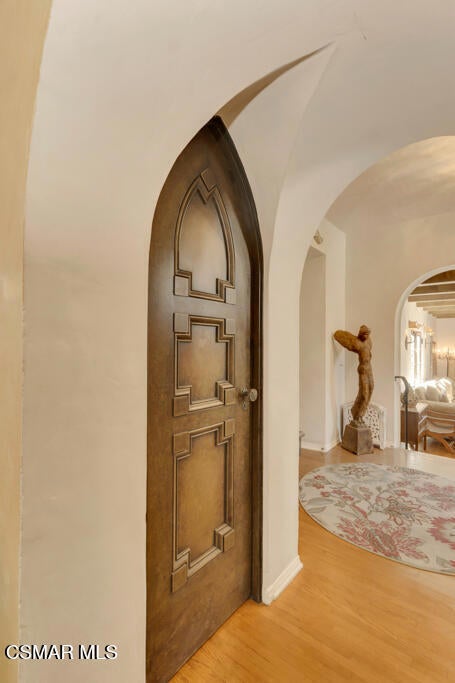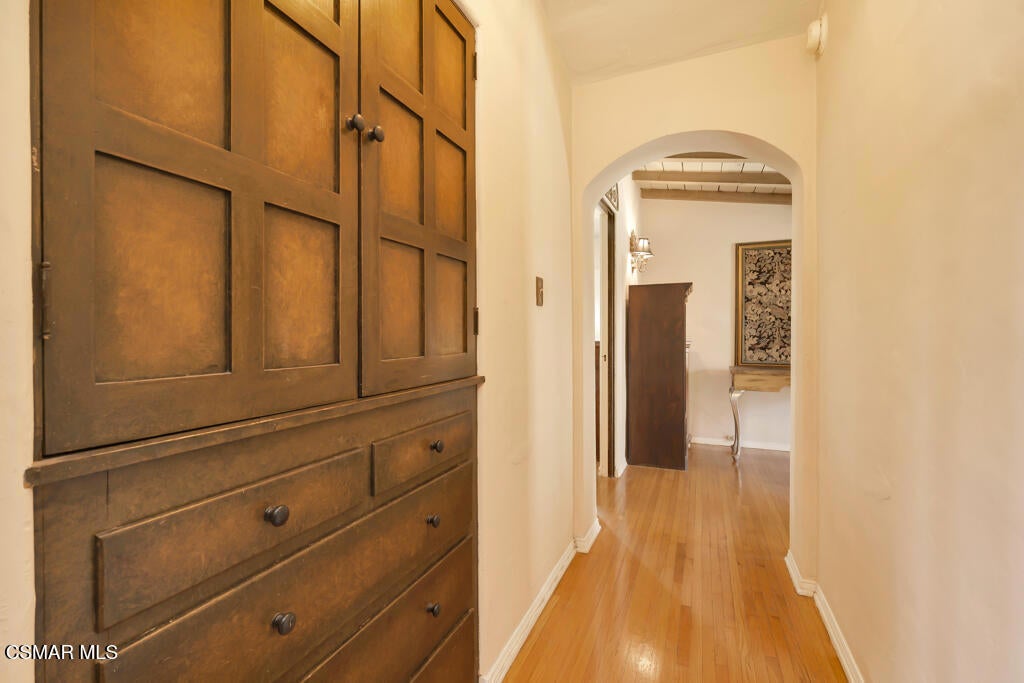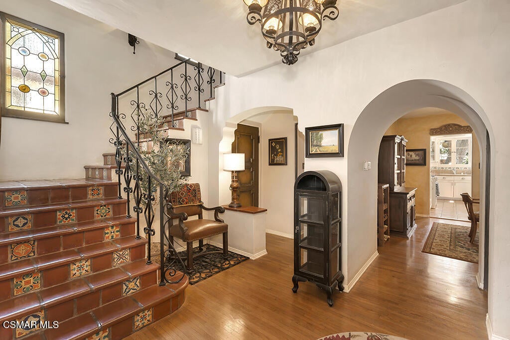 STUNNING 1930 SPANISH REVIVAL! Rumored to be designed by the acclaimed Architect, Wallace Neff, and located in the coveted, HISTORIC ROSSMOYNE neighborhood is this GORGEOUS piece of California history. Owner has lovingly maintained the artistic integrity of this MAGICAL PROPERTY. Nestled amidst lush greenery, and drought tolerant landscaping in both front and back yards, this two-story vintage GEM welcomes with a dramatic bougainvillea covered Porte-Cochere, a charming courtyard and quaint Romeo and Juliet balconies. Enter this very livable 2,522 square foot home to discover gleaming, original hardwood floors, exposed wood beamed ceilings, Malibu Tile staircases with hand forge iron banisters, custom stained glass, cathedral windows and spectacular inlaid doors throughout. The IMPRESSIVE and EXPANSIVE step-down Living Room is highlighted with original peg and groove wood floors, a dramatic fireplace, beamed ceiling, and French doors accessing the picturesque courtyard. The upgraded Kitchen has beautiful garden views and is adorned with hand painted Portofino tile, a vintage O'Keefe & Merritt stove, loads of cabinets all open to the special, sunny eat-in breakfast nook. There is also a convenient Laundry Room/Pantry/Mud Room with direct access to the TRANQUIL backyard. The large formal Dining Room wrapped in a wall of windows is perfect for entertaining. Completing the first floor is a Bedroom/Home Office along with a full downstairs guest Bathroom. The dramatic tile stairway leads to three additional very spacious bedrooms with two full bathrooms. The GORGEOUS primary bedroom has multiple windows offering tree top sunset views, a walk-in closet + dressing area, a private romantic balcony and features an original tile en-suite bathroom with both a tub and shower. The sizable secondary bedrooms have dedicated dressing rooms + closets sharing an authentic tiled bathroom rich in period detail and a dramatic balcony. The multi-leveled terraced BACKYARD OASIS is a secluded sanctuary with ample room for a pool and the perfect spot for both relaxation + entertaining. Additional amenities include a large two-car detached garage with original farmhouse style wood doors, a walk down California Basement for extra storage needs, upgraded plumbing, sewer line, dual zone A/C + heating utilizing original floor vents, hot water recirculation system, and a newer water heater. Conveniently located close to Glendale's best schools, parks, specialty markets and The Americana at Brand. This is a MUST SEE property where Old Hollywood glamour meets Glendale ~ a RARE OPPORTUNITY to own a piece of California's grand architectural history!!