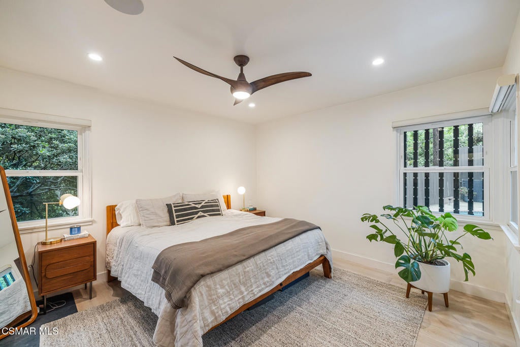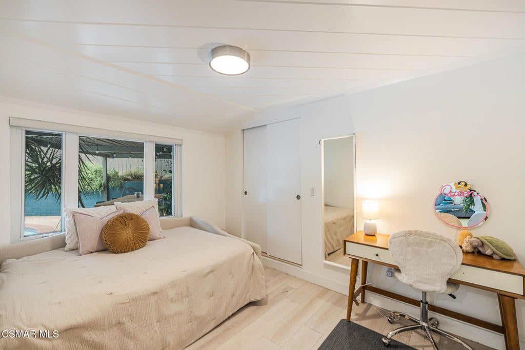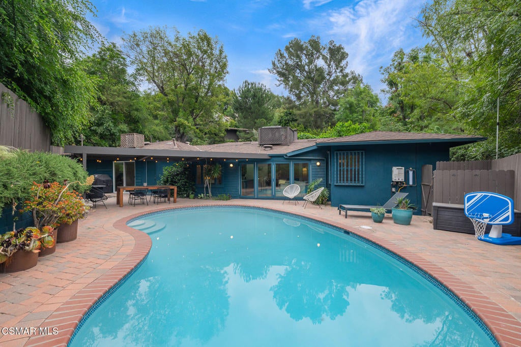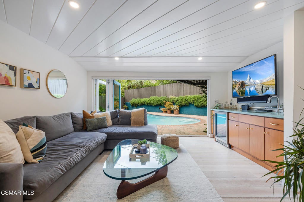 Thoughtfully enhanced and full of character, this inviting 4-bedroom, 2.5 bathroom, single-story Mid-Century residence blends timeless design with elevated modern touches. Tucked away on a peaceful, tree-lined street within the highly regarded South Pasadena school district, the setting offers a sense of calm and quiet retreat.Every space reflects intentional design and cohesive style, creating an atmosphere that feels both refined and welcoming. Rich European Oak flooring runs throughout, while expansive windows invite in soft, natural brightness from morning to evening.The main living area showcases a striking white brick fireplace, a distinctive original room divider, and designer wall coverings that serve as a true focal point. The adjacent dining space flows seamlessly into a one-of-a-kind kitchen featuring custom-crafted wood cabinetry, sleek quartz surfaces, a decorative Moroccan-inspired backsplash, stainless steel appliances, and a separate laundry area with added storage and backyard access.Down the hall, a generously sized secondary bedroom offers excellent closet space, accompanied by a stylish full bath with eye-catching tilework. The primary suite provides a comfortable retreat with abundant storage and a beautifully designed en suite bath complete with dual vanities and a spacious walk-in shower accented by rich tile finishes.An additional bedroom just off the main living space is filled with charm, featuring wood-paneled walls and a tranquil backyard view. The expansive family room is perfect for relaxing or entertaining, highlighted by a sophisticated wet bar and dramatic floor-to-ceiling accordion doors that open completely to the outdoor space.The converted garage has been transformed into a versatile bonus living area, complete with French doors that open to the private backyard--ideal for a home office, guest retreat, or creative space. It also includes a beautifully designed powder bath featuring stunning wallpaper.Designed for seamless indoor-outdoor enjoyment, the backyard is a private haven featuring a resurfaced sparkling swimming pool, curated greenery, multiple seating areas, a pergola-covered dining space, fire pit, and a grassy area--ideal for both gatherings and quiet moments at home. This one-of-a-kind home is not to be missed. Come see for yourself.