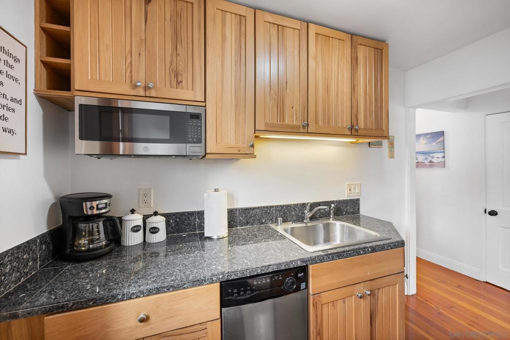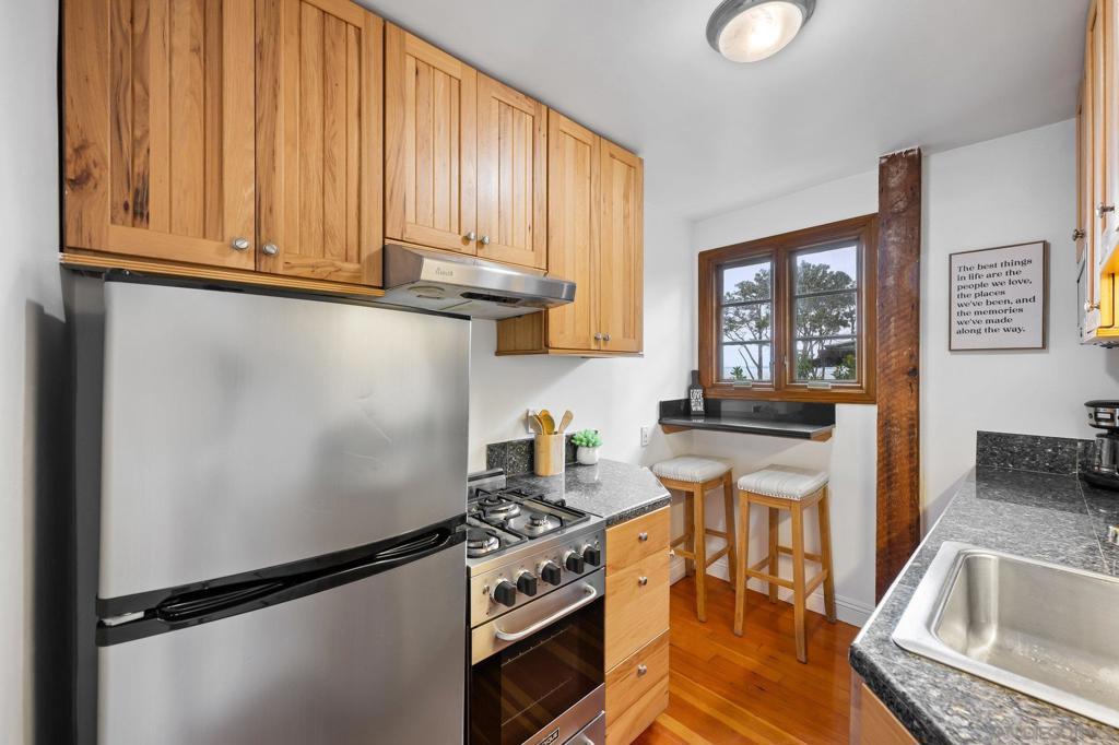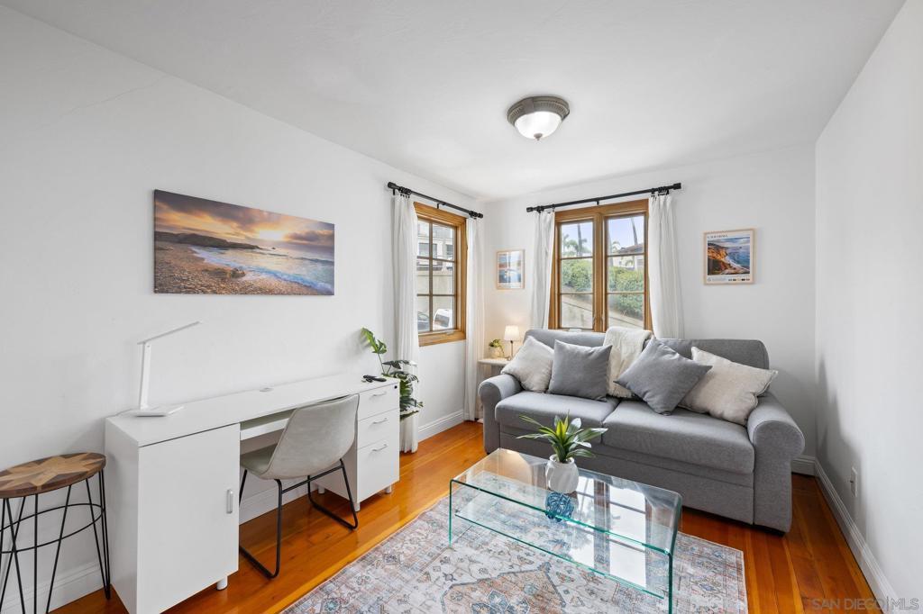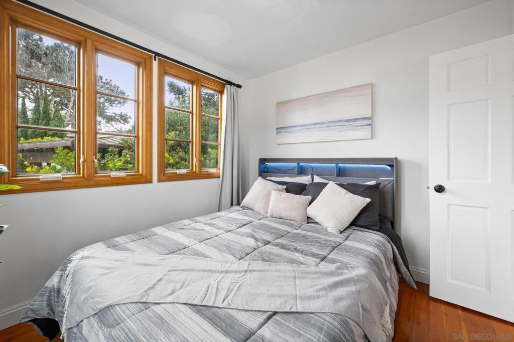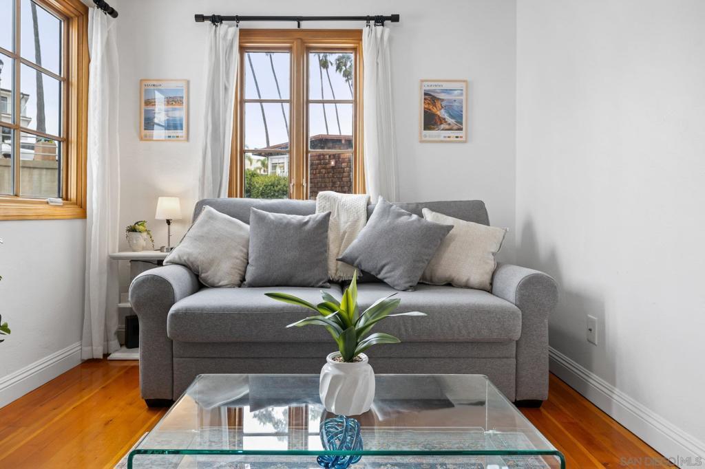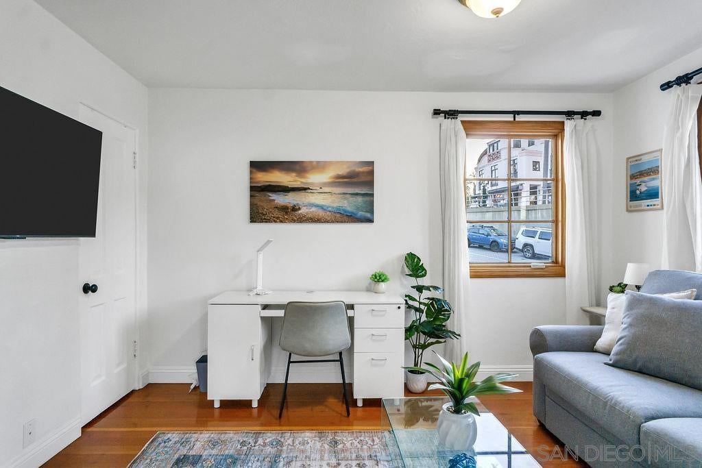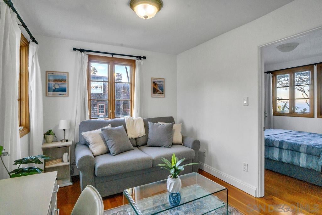 "weekly/monthly" furnished rental! This is a Charming and unique one bedroom apt in a 5-unit building in La Jolla with access to the Village & Cove right out your front door! Everything you need for 1 or 2 people - comfortable bed, desk, TV, couch, hardwood floors, kitchen, clean and functional bathroom with windows everywhere to take in that ocean breeze. Walk to La Jolla Village shops, restaurants and galleries. Explore the Cove, nearby trails and Children’s pool, just a short walk away. This is a unique and historic property with lots of charm! You will climb 2 small sets of stairs to reach the lower-level unit. The entrance is at the side of the property, you’ll enter through a gate and walk up some stairs to reach the front door. The apt has a small living room with a couch, TV, desk and coffee table. The bedroom has a queen-size bed with windows facing the street and ocean. The kitchen and bathroom and both clean and functional with all the basics you need. At the end of the hall is the entrance to the cellar which has a coin operated washer and dryer. There is currently no parking spot available, but there is limited street parking as well as a parking garage across the street from the property. Everything is cozy and comfortable; you should have everything you need to relax and enjoy your stay after a long day exploring the village and cove.