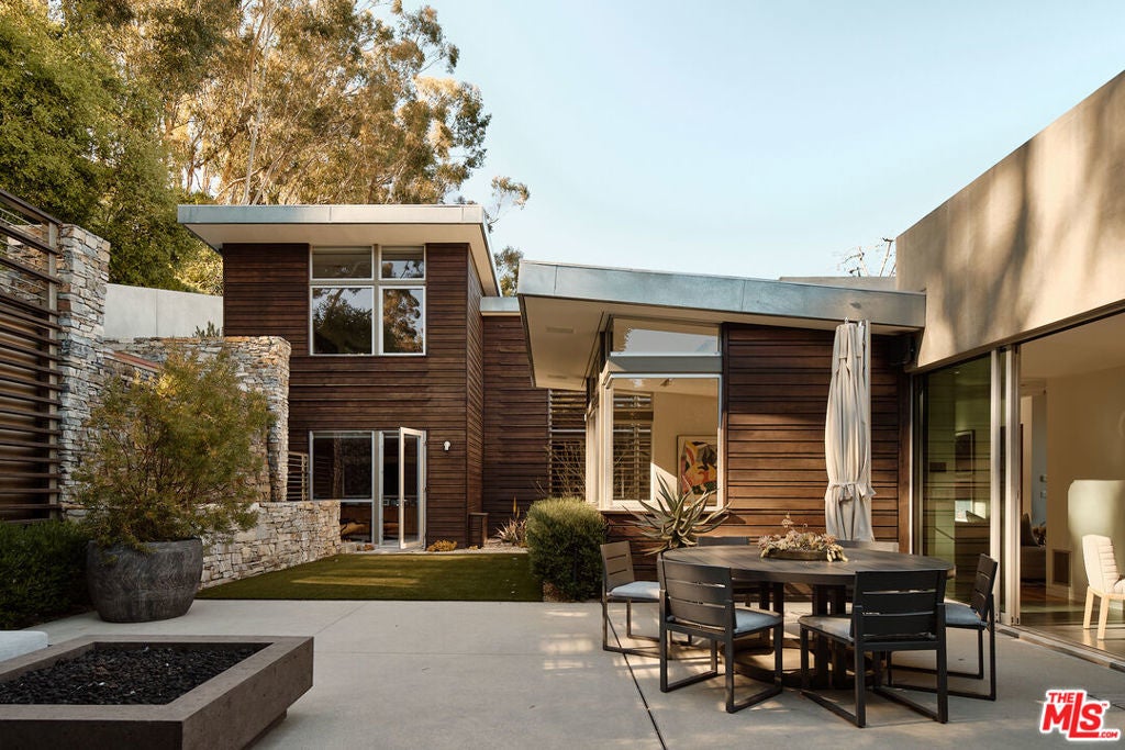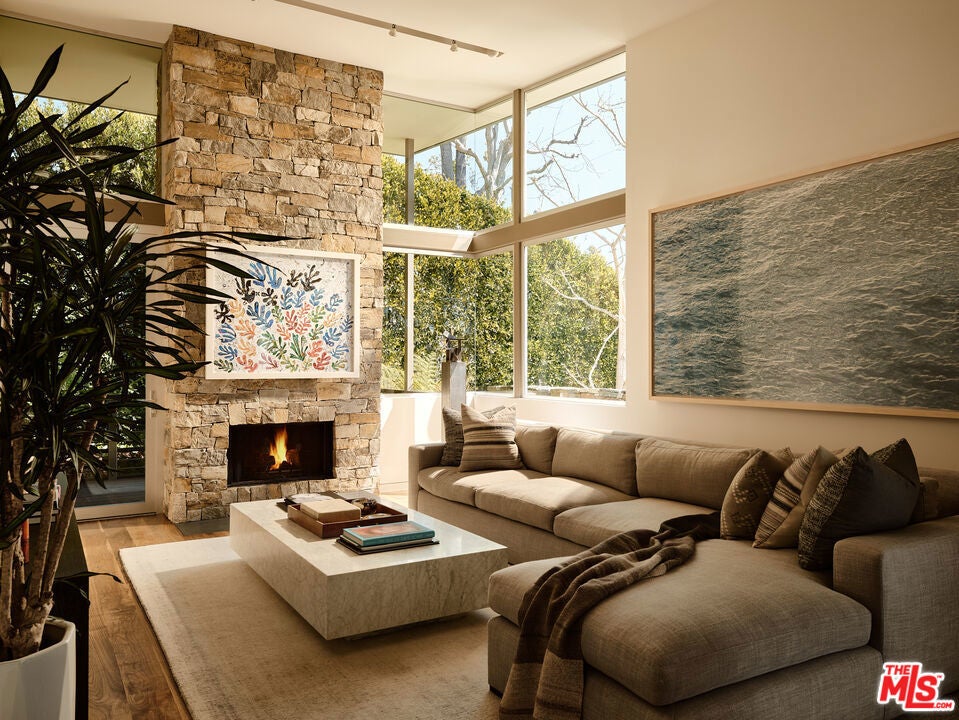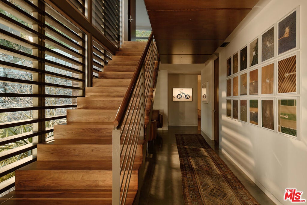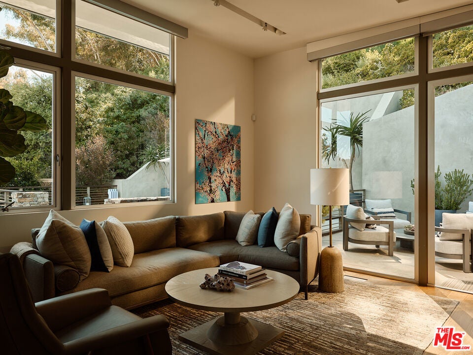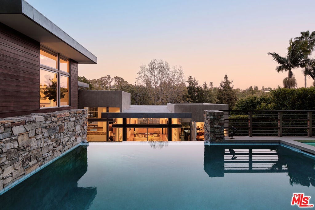 Nestled in the sought-after enclave of Rustic Canyon, this architectural gem was artfully crafted by acclaimed architect Michael Kovac. The home embodies completely custom, timeless design ensuring quality in every corner. Step inside to discover a formal yet relaxed living room effortlessly flowing to an additional open-concept living and dining space. Artistically framed floor-to-ceiling windows flood the rooms with natural light complimenting the warmth and richness of the hardwood accents while allowing the polished cement floors, and Boffi kitchen with Gaggenau appliances, to add a touch of modern sophistication. Ascend the exquisitely designed staircase to reveal a luxurious primary suite welcoming a sitting room, steam shower, office loft and private terrace. Envisioned for relaxation and entertaining, your outdoor oasis awaits featuring a marvelous infinity pool + spa, waterfall and picturesque treetop views. Four additional bedrooms, six bathrooms and a vast three-car garage complete the home. Don't miss this opportunity to call this Rustic Canyon gem home! * Home is 5,566 SF on public records