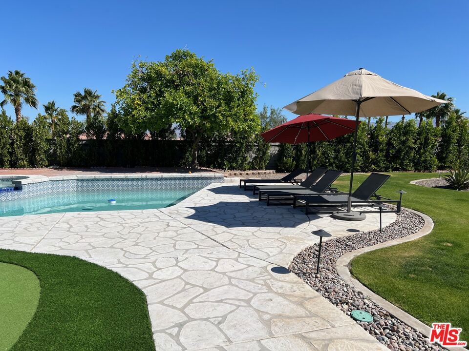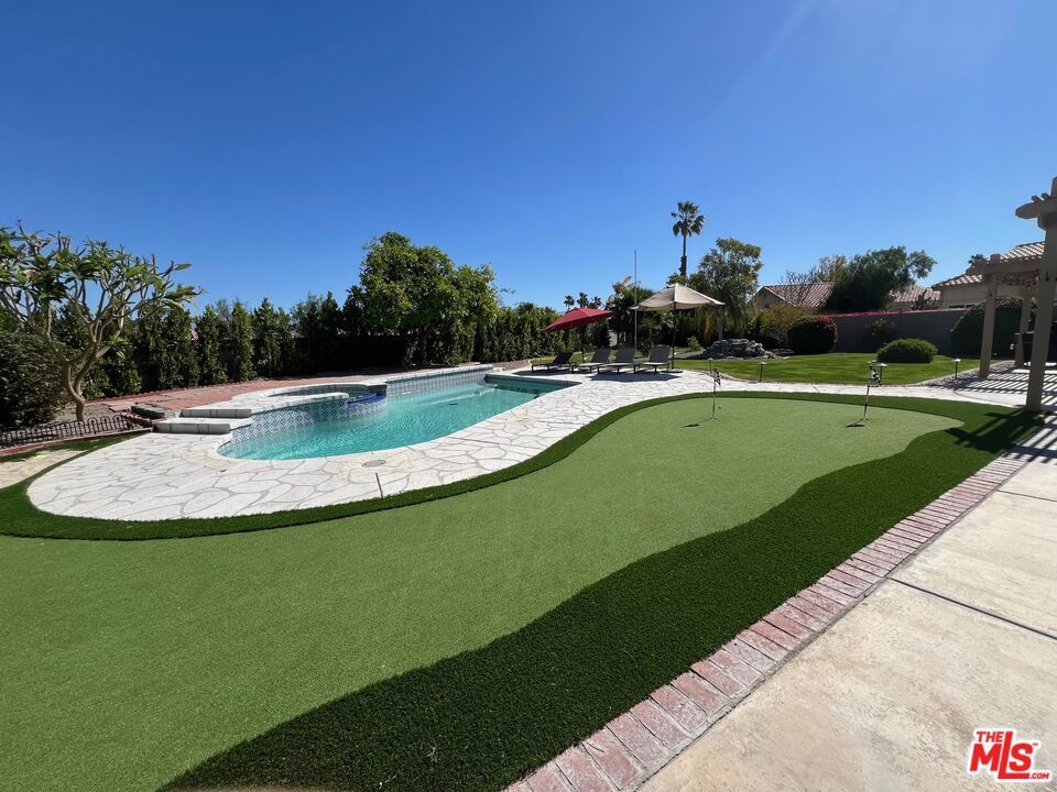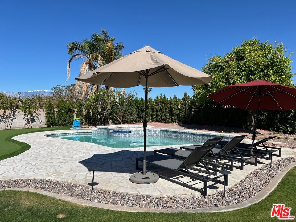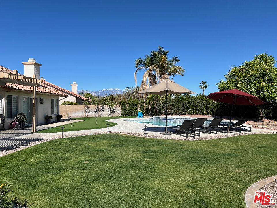 For Lease, minimum 6 months to a year at a time. A great home with more than a quarter of an acre in the city limits. Fully furnished 3 bedrooms plus a den/office which can also be used as a guest room with a trundle bed; triple car garage, huge lot, pool and spa. Large Oasis style backyard with a large putting green. Unique opportunity to move into a home that looks and feels brand new in an established neighborhood. New floor tiles throughout which look like wood but are ceramic, keep it cooler during the summer. New kitchen and bathrooms with quartz countertops with the latest in stainless steel appliances. Wet bar, security system, custom window treatments, new tankless water heater, formal dining room and a kitchen with a custom-made table booth which seats 10 people. Master bedroom suite with master bathroom, separate deep tub and shower. 2 more bedrooms with a guest bathroom with double vanity. Centrally located about 20 minutes to the yearly Coachella Music Festival, 20 minutes to Palm Springs and close to Palm Desert. Easy access to nearby 10 freeway. Deposits vary depending on the duration of the lease.