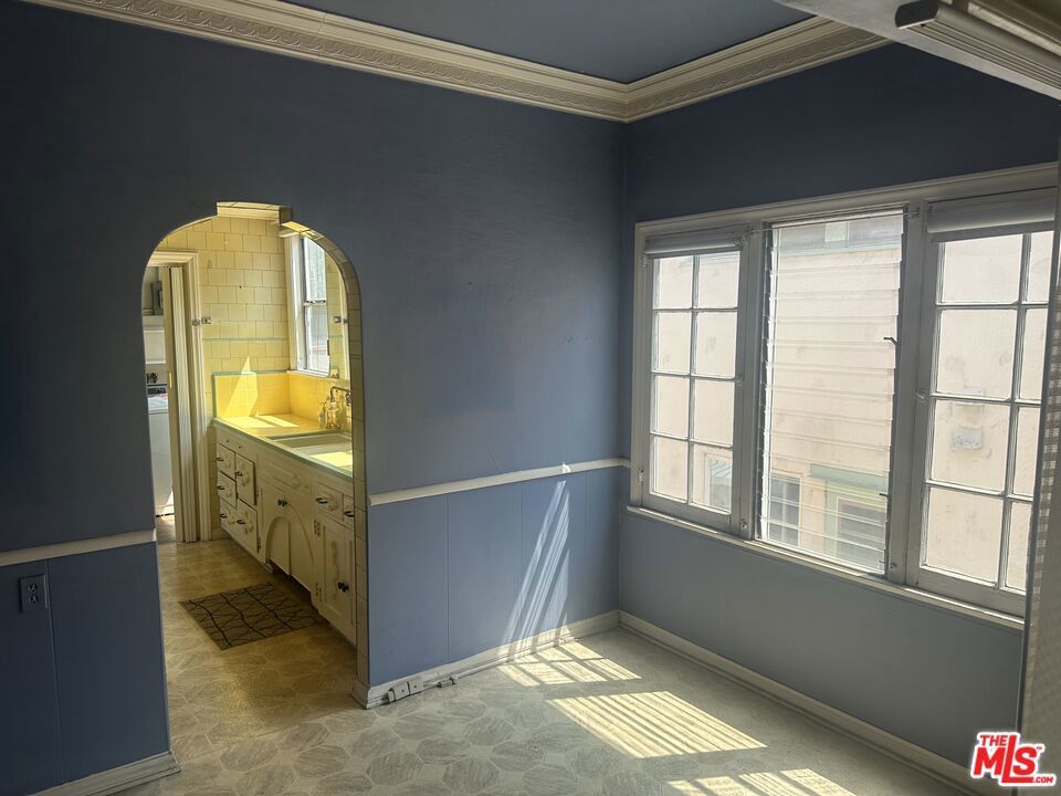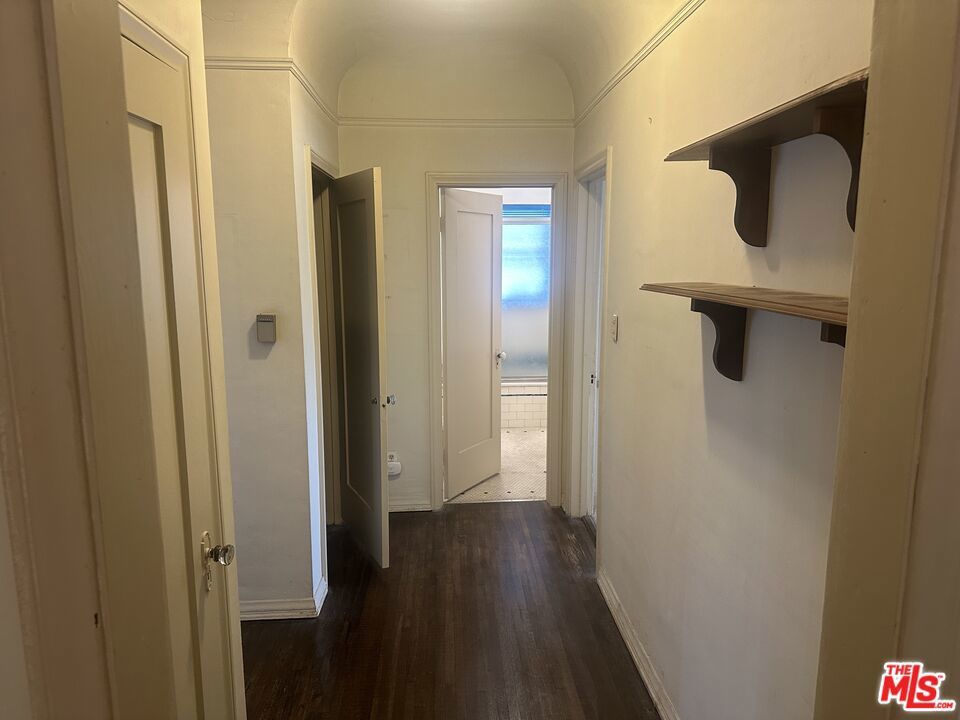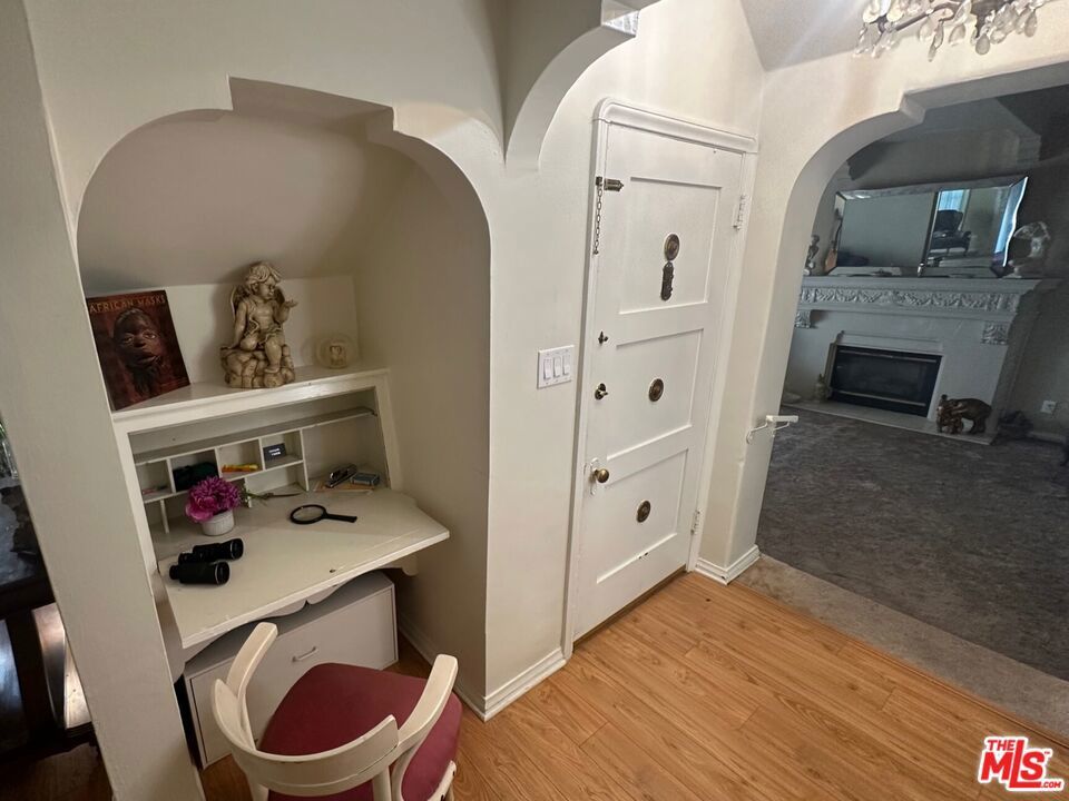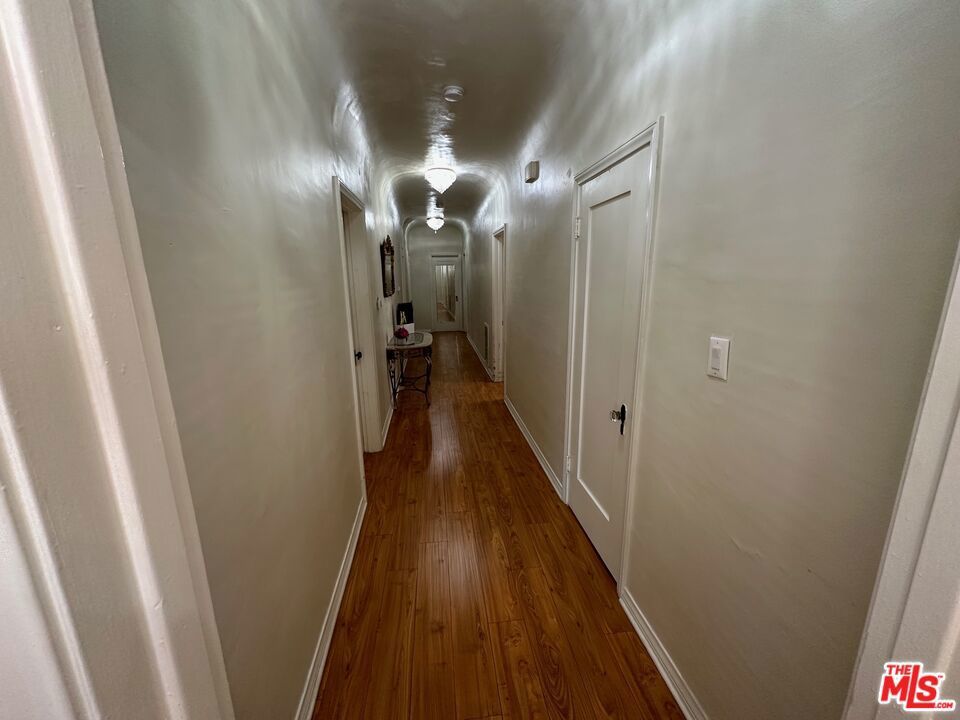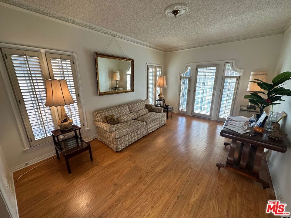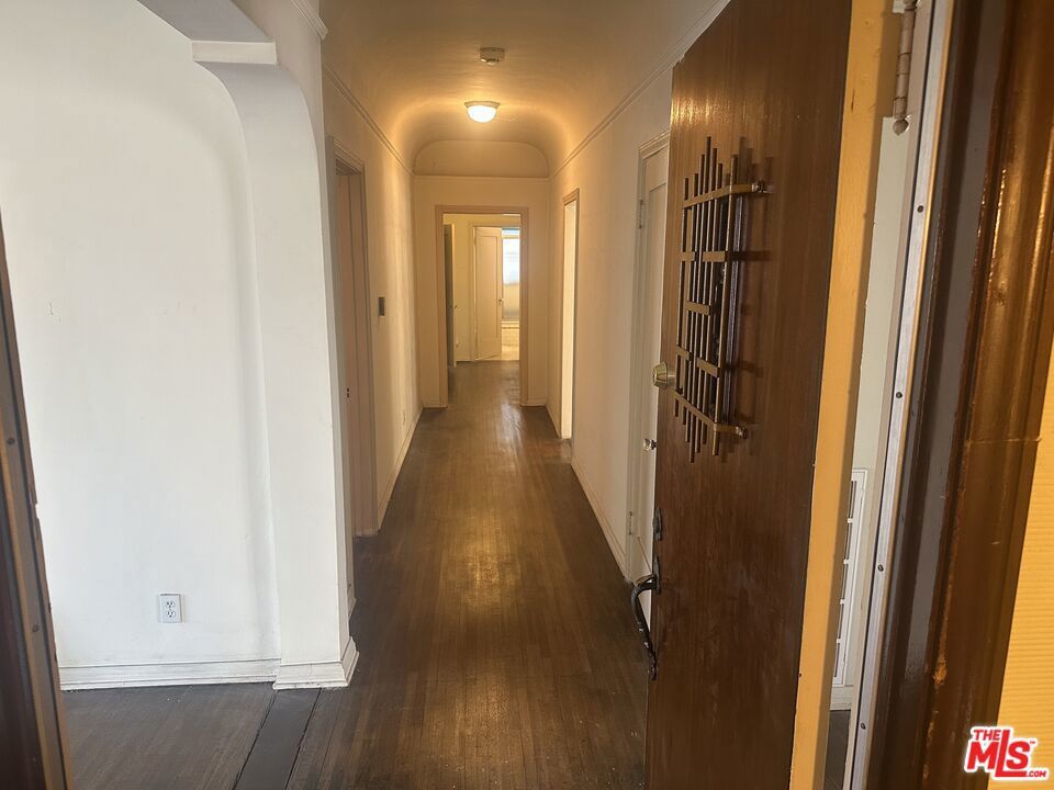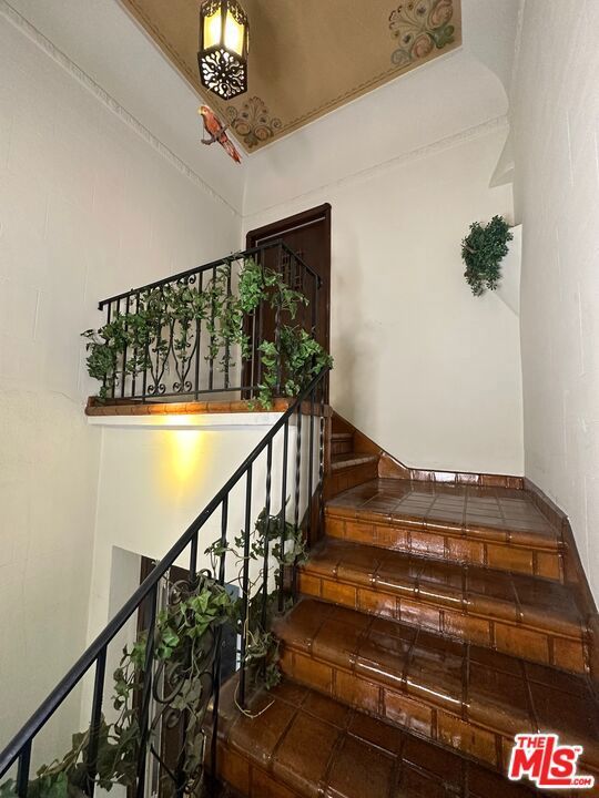 This HPOZ stacked duplex is a part of the rich history established by Los Angeles' 1st Registered Female Architect, Edith Northman. Its arched doorways, windows, coved ceilings, alcoves, and built-ins exemplify the charm of Miracle Mile in 1928. Upon foyer entry you're met with marvelous stained glass windows and a spiral mosaic tile staircase that leads to the upper unit. Both units feature 3 bedrooms and 2 baths with Art Deco throughout, including ornate plaster work, plantation shutters, and pristine wedding cake design. The downstairs unit brings the party with its large scale sunken living room that's primed for entertaining and gathering. Its floor to ceiling window gives a panoramic view of the hills, and a great decorative detail fireplace offers a place to showcase treasures and conversation starters. The upstairs unit features a balcony that's ready whenever you need a view of the neighborhood and some fresh air. The property features an extended driveway that leads to a patio to keep the party going, and garage spaces for 4 cars and more. Seize the opportunity to capture this Gem!
