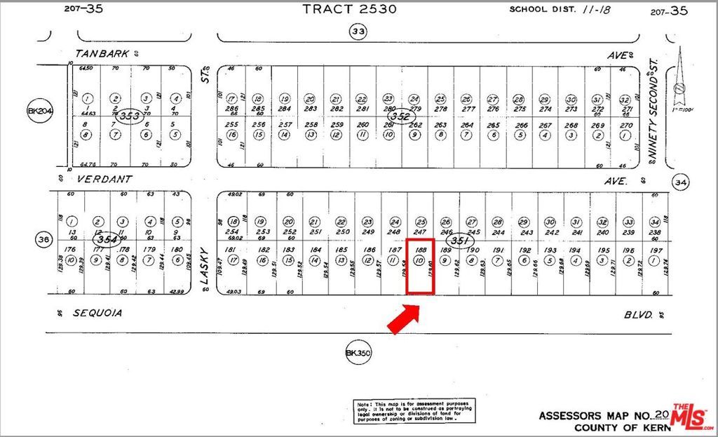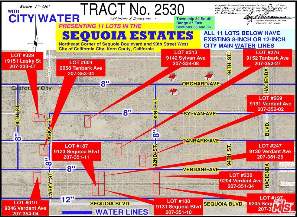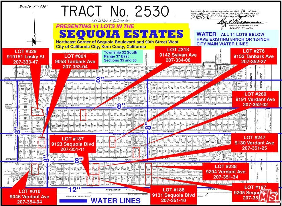 This is Lot Number 188, Tract 2530, Sequoia Estates, in California City with 12-INCH City Main Water. Total of 11 Single Family LOTS Available. Can Buy or Lease with Option to Purchase From 1 to All 11 Lots. Build Your Dream Home. Ideal for Builders, Developers, and First-Time Homeowners. Near Schools, Houses of Worship, Stores, Freeway. Zone: R-1, Size: 7,775 Square Feet, 60 x 130, Flat, APN: 207-351-10, Coordinates: 35.097040, -117.965125.