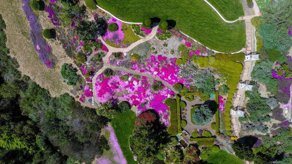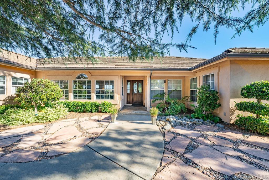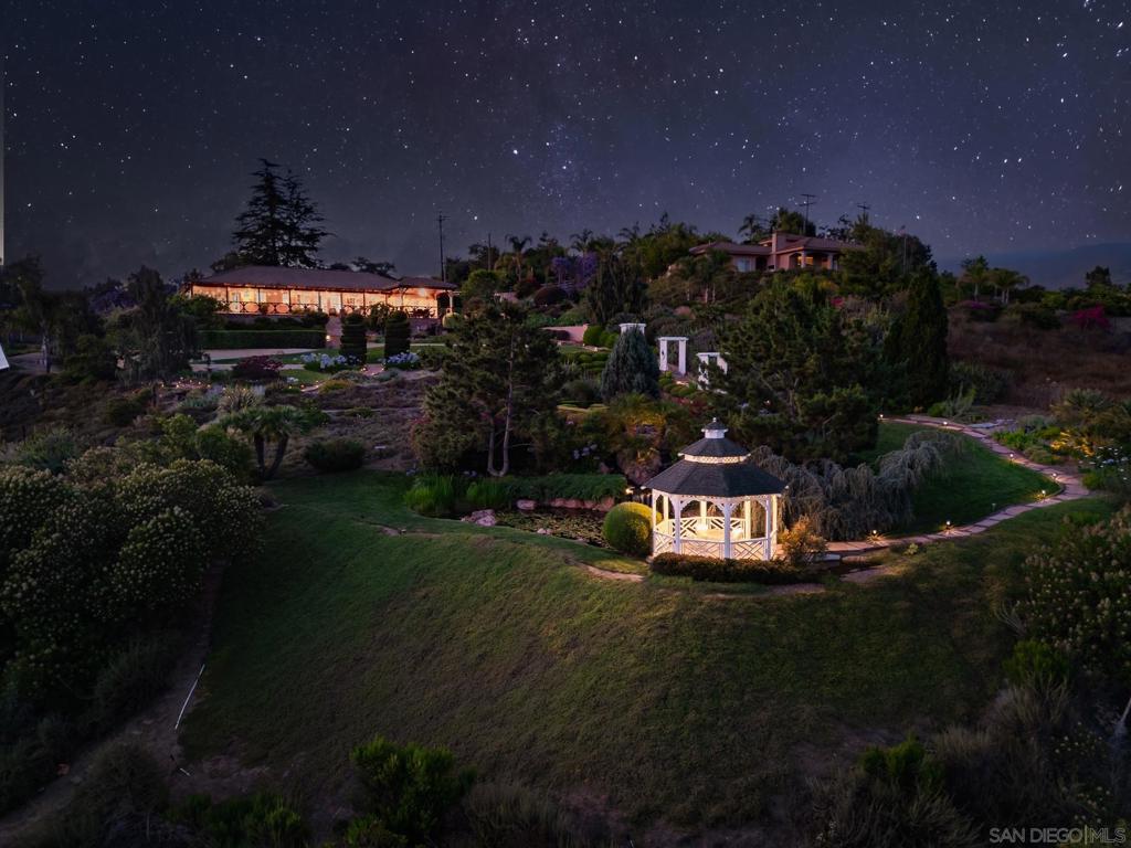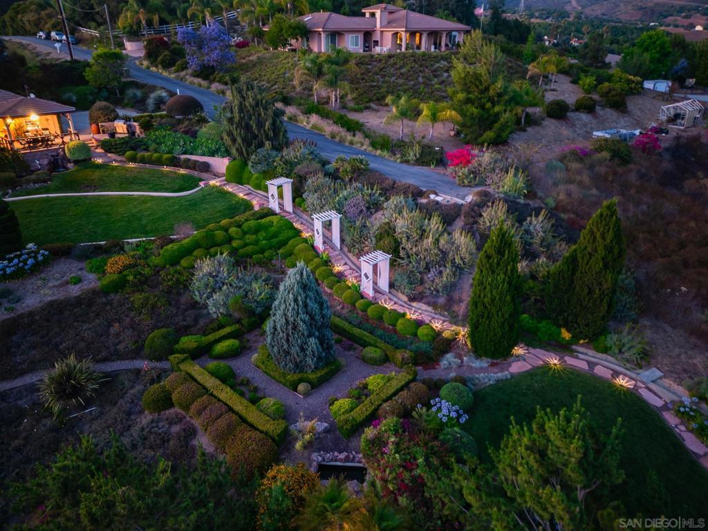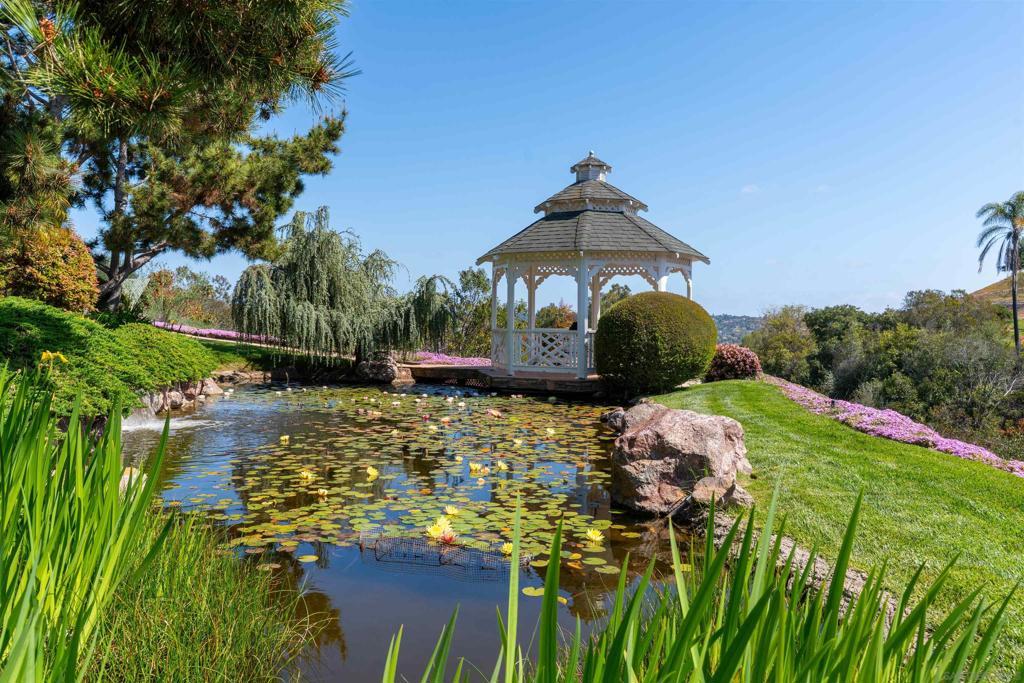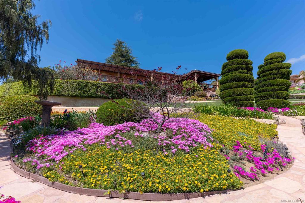 Welcome to this exceptional 3-bedroom, 2-bathroom estate boasting 2,659 SqFt of luxurious living space and 2.57 acres of usable land. This open-concept home is filled with natural light and features soaring 12-foot cathedral ceilings in the great room, which is perfect for entertaining with two sitting areas and a dining area. The kitchen is a chef’s delight, equipped with a gas burner stove, stainless steel appliances, trash compactor, and a reverse osmosis drinking water system. Enjoy meals in the eat-in kitchen area or step out onto the exterior deck through the convenient kitchen door. The primary ensuite is a true retreat, featuring a dual sink vanity, spacious walk-in closet, walk-in shower, privacy toilet room, large linen closet, and a Nutone built-in ironing center with an automatic timer. A private entrance leads to the expansive 60-foot deck, perfect for morning coffee or evening relaxation. The 2-car garage has been thoughtfully converted into a 525 sq ft finished office with a private entrance. This versatile space includes 2 built-in cherry wood desks and cabinets, 5 phone lines, a coffee bar, and more, making it ideal for a home office, art studio, recreation room, exercise room, optional bedroom, or granny flat. The professionally designed gardens, developed by award-winning Landscape Locators Unlimited, create a private retreat. The 2.57-acre estate offers unobstructed 180-degree views to the south overlooking the Santa Margarita River preserve and to the north toward the historic Rock Mountain. This entertainer’s paradise includes a front patio for relaxing, a large custom-built rear deck with patio covers that spans the entire back of the home. The exterior showcases pristine landscaping with over one hundred varieties of exotic plants and trees, stunning arbors lining the gravel and stone pathway, a gazebo overlooking the 10,000 gallon koi pond with hundreds of koi fish and breathtaking waterfalls. As you enjoy the expansive view from the back deck, watch spectacular sunrises over the snow-covered Palomar Mountain range and the fog-kissed river valley in the morning. Perfect as a potential wedding venue or private events venue, this serene escape in nature is conveniently located near downtown Fallbrook, Temecula wineries, shops, restaurants, commuting corridors, and more that North County San Diego has to offer. Additional features of this property include an automated irrigation system, including irrigated raised vegetable beds, a storage shed, a ground-mounted 44-panel solar system, a Ring camera and spotlight-enabled security system accessible from your smartphone. The home also boasts a built-in Vacuflow whole home vacuum, an entertainment wall with an integrated sound system that allows you to control volume from each room, the garage, or the deck. Don’t miss this opportunity to own a master-gardener’s dream home and private sanctuary!