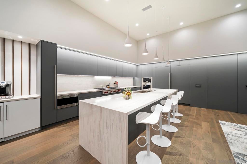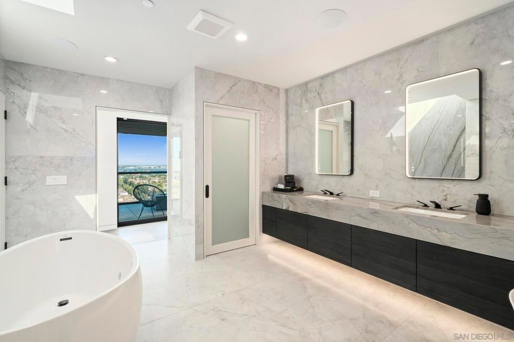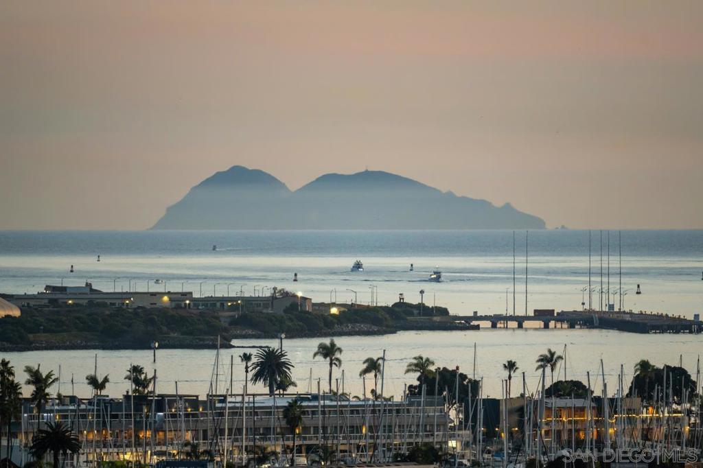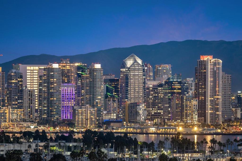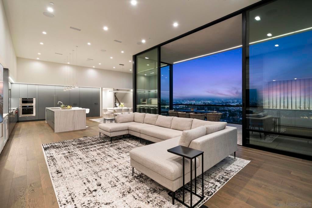 Introducing this one of a kind striking California modern masterpiece envisioned by local architect Daniel Geiger, AIA. This extraordinary residence blends architectural artistry with everyday livability, offering an unmatched fusion of luxury, function, and effortless entertainment. Crafted with low-maintenance, modern materials, the home's bold exterior pairs crisp white plaster with walnut-toned accents, exposed structural steel, and expansive glass walls. The result is a visually dynamic façade that frames a curated journey through panoramic views of the San Diego skyline—an immersive architectural experience as much as a home. Step inside from the third-floor foyer and be instantly captivated by sweeping bay vistas and an abundance of natural light, softly diffused by a louvered canopy above the primary suite's balcony. The primary retreat is nothing short of a sanctuary: a private haven with commanding views of the downtown skyline and bay, and a cantilevered terrace complete with a fire pit—perfect for serene evenings under the stars. The spa-inspired primary bath is a luxurious escape, featuring heated floors, a steam-equipped shower, a sculptural freestanding tub with uninterrupted views, and a spacious custom walk-in closet. Movement through the home is guided by a show-stopping stairwell with waterfall-edge treads and a sleek mixed-metal handrail. A thoughtfully integrated finely appointed elevator adds both refinement and convenience, effortlessly connecting all levels. On the main floor, a dramatic open-plan living area takes center stage. Towering 13-foot Fleetwood sliding glass doors open wide to a vast cantilevered terrace, dissolving the boundary between indoor and outdoor living. Here, enjoy unobstructed, jaw-dropping views of downtown San Diego, the bay, Coronado, and even Mexico on the horizon. The chef’s kitchen is equipped with top-tier appliances and thoughtful design details: custom cabinetry, a 6-burner Wolf rangetop with griddle, panelized Miele dishwasher, Sub-Zero side-by-side fridge and freezer, and a discreet walk-in pantry. Nearby outdoor spaces feature a built-in BBQ station nestled against a dramatic wood grain board-formed concrete wall and a buffet-sized natural quartzite serving counter perfect for outdoor entertaining. The home features four spacious bedrooms, a media room, a family room, a living room, and three and a half impeccably appointed bathrooms—each crafted with its own character, blending elevated design with warm functionality. This is more than a residence—it's a living work of art, designed for those who appreciate bold architecture, sophisticated luxury, and unforgettable views. Welcome to your front-row seat to San Diego’s skyline.