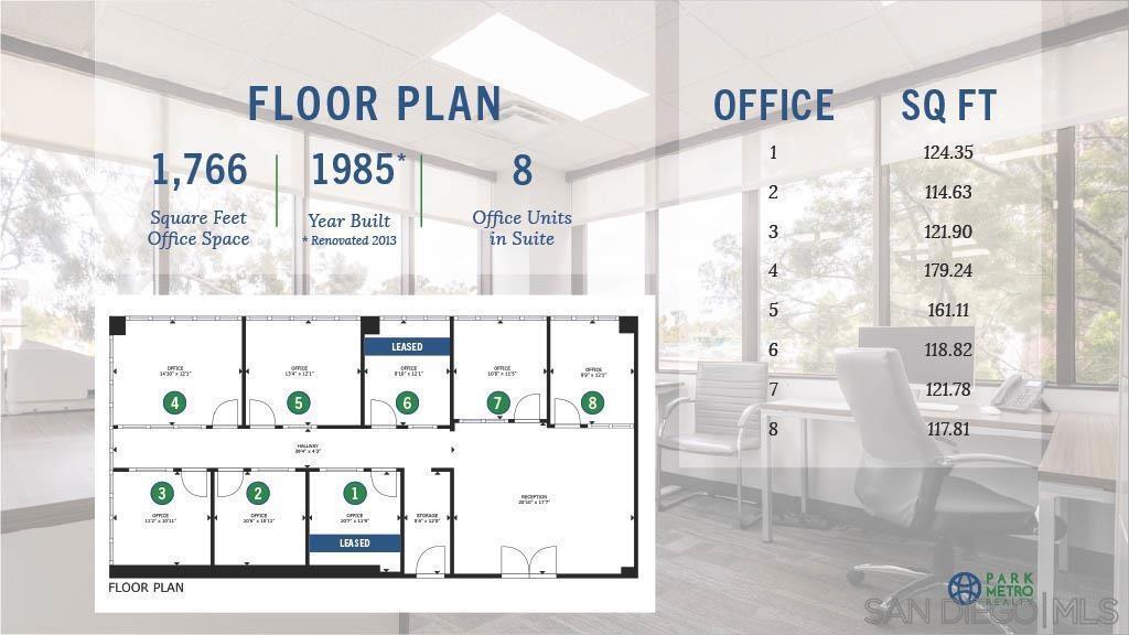Discover an exceptional office rental opportunity in the heart of Downtown San Diego! INDIVIDUAL, PRIVATE PROFESSIONAL OFFICES FOR RENT within a fully functioning and all inclusive office suite. This 1,700-sqft suite offers 8 individual offices, each for rent separately, with a professional and fully equipped environment ideal for businesses seeking a prestigious address with convenience and comfort. Amenities included in rent: Front desk receptionist to greet visitors and accept packages during specific hours, high-speed internet broadband, gas and electricity utilities, business mailing address, nightly janitorial service, access to community lunchroom, professional scanning and printing equipment (limited monthly photocopies), and document shredding services. This office is ideal for any professional services, legal teams, startups, or any businesses seeking a modern, move-in-ready space in a central and vibrant location downtown. Schedule a tour today and secure your spot in one of San Diego’s most sought-after commercial hubs! Suite 325-2 is an interior office sized 10' x 11' for an approximately 113-square foot, locked off, private room that only you can access or use. It also includes access to the remaining 700+ square feet of community, reception, and printing space within the shared suite area. along with access to all building amenities. The only item not included in rent is optional parking, which costs $180/month/space in a secured, non-reserved garage attached to the building. Exceptional Office Space in the Heart of Downtown San Diego – 1,700 Sq. Ft. total space, 8 individual offices | Individual Offices for Rent in a Suite! Position your business for success with a beautifully maintained and fully functional office suite located in the vibrant core of Downtown San Diego's Cortez Hill. Designed for productivity, professionalism, and comfort, this space is ideal for companies looking to establish themselves in a prestigious and well-connected business district. The suite features eight private, individual offices available and a welcoming front desk/reception area, creating an ideal layout for teams of professionals, legal practices, startups, and client-facing businesses. Whether you're expanding or seeking a high-quality satellite location, this suite offers all the essentials for a seamless move-in experience. Included Amenities: Front reception desk attendant Internet, gas, and electricity utilities included—fewer bills to manage Mailing address for business use, adding credibility to your operations Nightly janitorial service for a consistently clean and professional space Modern lunchroom that’s pristine, inviting, and perfect for breaks or informal team gatherings Access to scanning equipment Limited monthly photocopies to support daily operations Secure document shredding services for confidential disposal Parking for an additional $180 per month per space Select offices feature stunning views of Downtown San Diego and the southern tip of Balboa Park, creating an inspiring workspace for you and your team. Whether you're meeting with clients, collaborating with colleagues, or focusing on solo work, this office offers the infrastructure and environment to support your growth. Don’t miss the opportunity to work in one of San Diego’s most sought-after commercial hubs. Schedule your tour today and take the next step for your business.