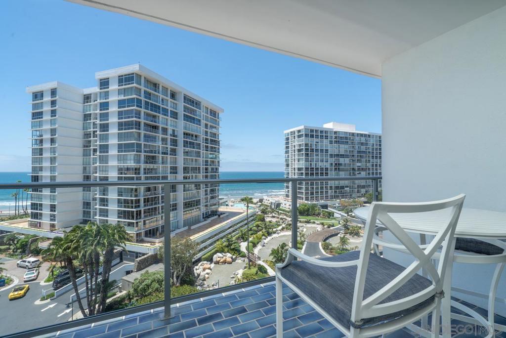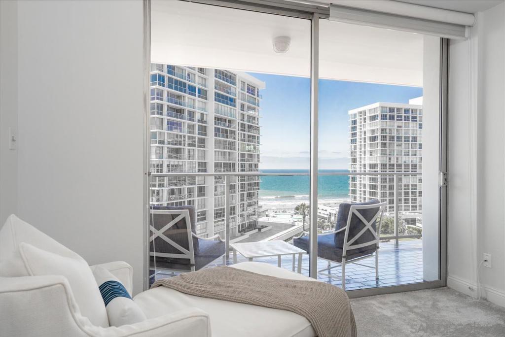 Come to our beach retreat and enjoy the sights and sounds of the Pacific Ocean at the highly desirable Coronado Shores. THis one bedroom, one bath unit is light and bright with a balcony overlooking the ocean. The living room offers muted greys, sand and whites much like driftwood. Get comfortable on the luxurious couch while watching a large flat screen TV and listening to the crashing waves. White tile floors in the living areas and comfy carpet in the primary bedroom which has a king bed and chaise lounge for reading and relaxing. Updated kitchen with quartz countertops and washed grey oak cabinets.