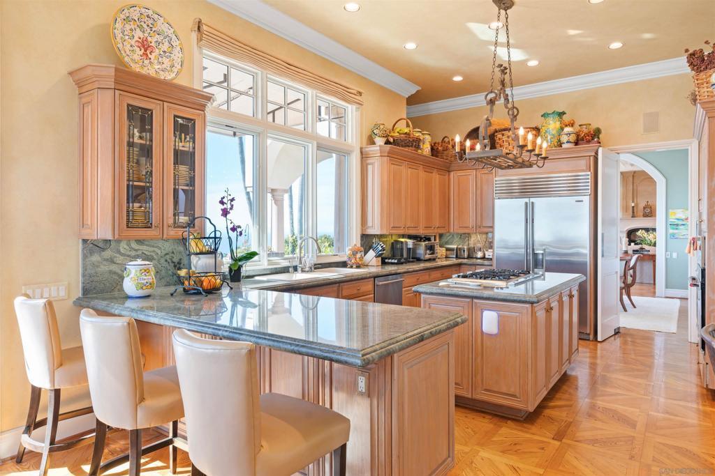 Jetliner 270 degree views that encompass the Pacific Ocean, La Jolla Country Club, Catalina Island and beyond are showcased by this extraordinary Mediterranean Villa. Nestled at the end of a long private driveway on a quiet serene street, this exquisite fully-furnished home boasts privacy and a seamless indoor-outdoor flow. Enter through grand double doors into the foyer, complete with soaring ceilings and picturesque ocean views. The formal living room boasts coffered ceilings, a cozy fireplace, a wet bar and French doors that open to the expansive terrace- the ideal place to entertain on all scales. Awash with natural light throughout, the home offers additional highlights including a formal dining room, cozy family room with vaulted beamed ceilings, and gourmet chef's kitchen featuring top-of-the-line appliances, sleek cabinetry, breakfast area and a spacious island - perfect for culinary enthusiasts. The primary suite rivals the finest resorts, and features a variety of sitting areas, statement fireplace and French doors that open to a private balcony with breathtaking ocean views. Relax and unwind in the dual spa-like en-suite bathrooms, complete with a sumptuous jetted tub, custom walk-in closets, bespoke shoe-room and two home offices - outfitted with sensational wainscoting and custom built-ins. Five additional secondary bedroom suites offer the ultimate privacy for guests.