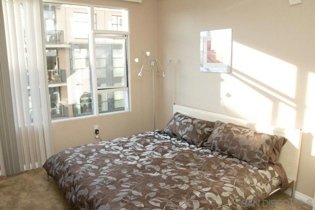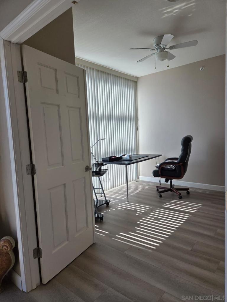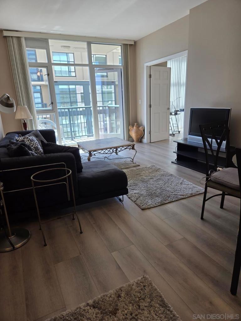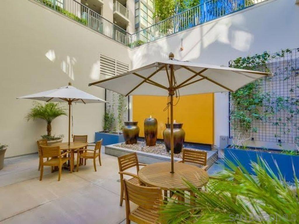 BRAND NEW HARDWOOD FLOORING JUST INSTALLED IN LIVINGROOM, BEDROOM AND LARGE DEN! Beautifully furnished, one bedroom plus spacious Den/office! Open kitchen concept with Stainless steel appliances and granite countertops. Trellis complex located in the heart of downtown San Diego Gaslamp, Convention Center, Petco Park, the Trolley, fine dining and shops all with in one block of the condo. West facing views are spectacular during the day and night. Secure entry, gated parking space. Courtyard views, security entries for garage and building. Complex offer fitness center, patio furniture and BBQ grills in courtyard area.
