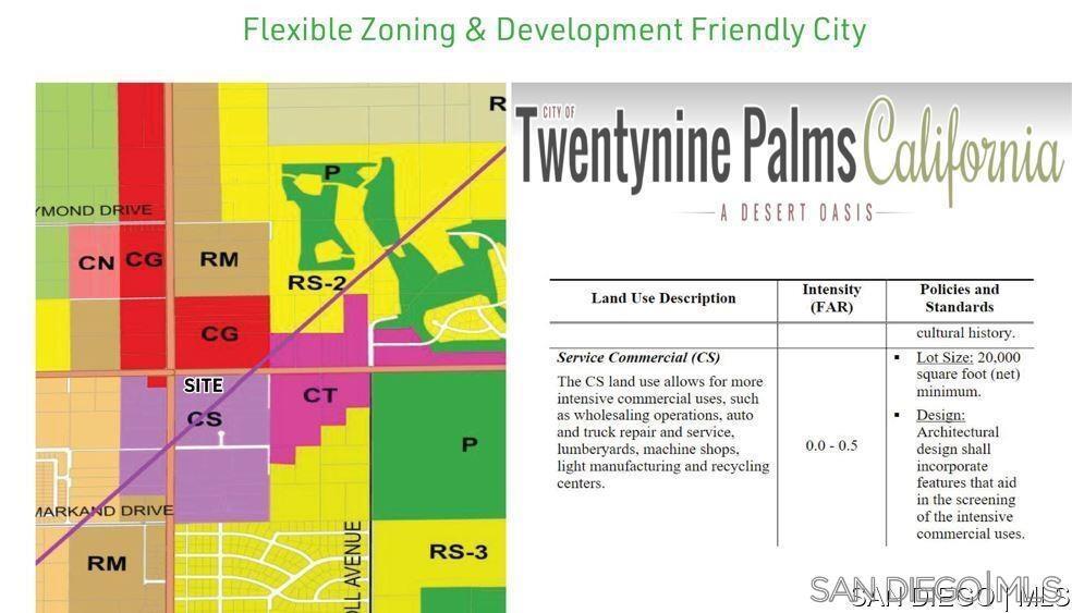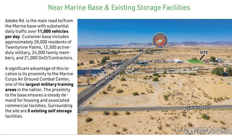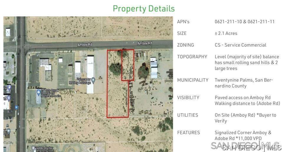 TWO PARCELS CONSISTING OF 2.1 GROSS ACRES WITH ABILITY TO ASSEMBLE THE 4.7 ACRE SOUTHERN CONTIGUOUS PARCEL FOR 6.8 ACRES TOTAL WATER, ELECTRIC, PHONE, GAS IN STREET 2 MILES FROM 29 PALMS HWY THE MAIN THOROUGHFARE 3 MILES FROM USMC BASE ENTRANCE *11,000 VPD ON (ADOBE RD) FLEXIBLE CS ZONING (SELF STORAGE, TRUCKING, INDUSTRIAL) 217 FEET OF FRONTAGE ON AMBOY RD SIGNALIZED INTERSECTION
