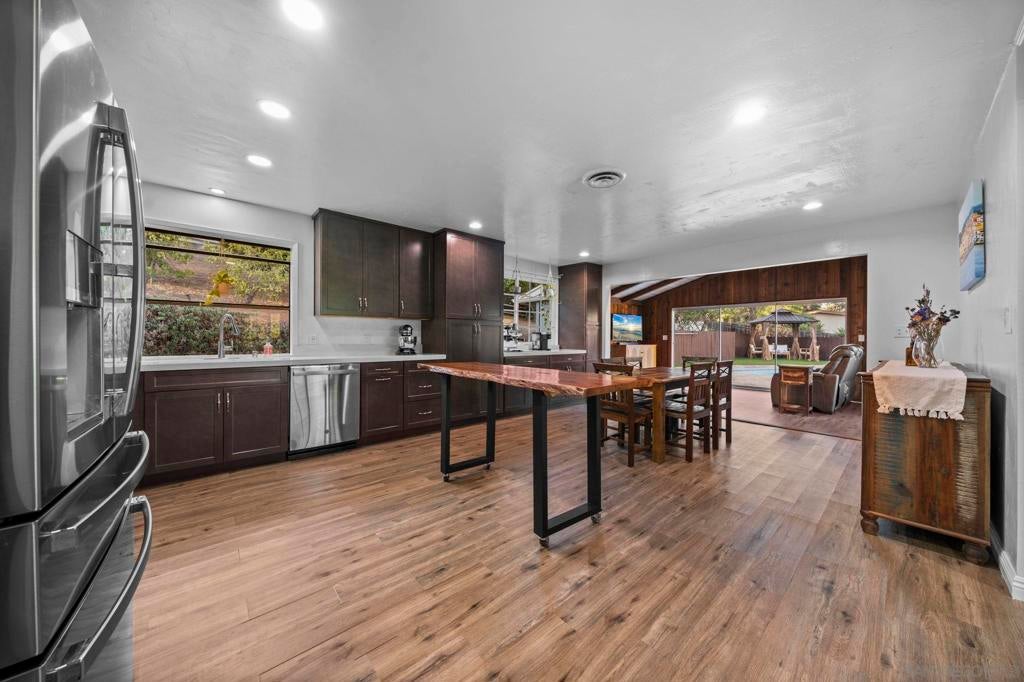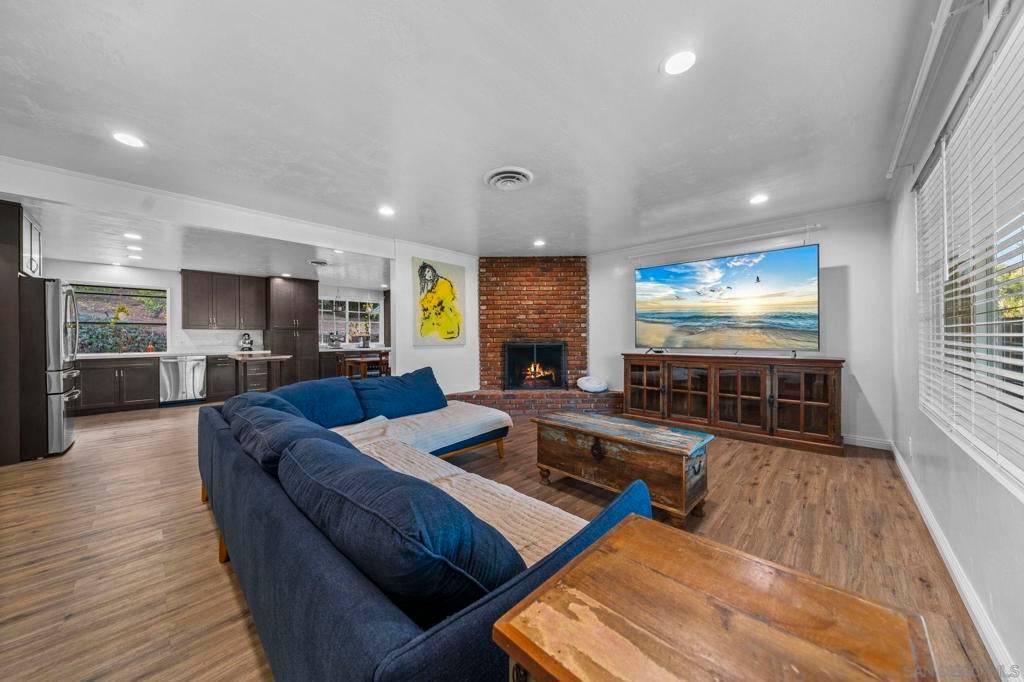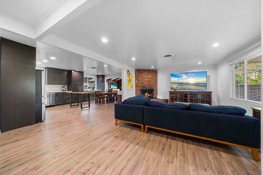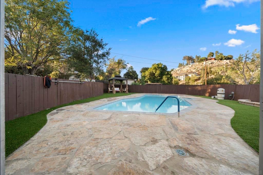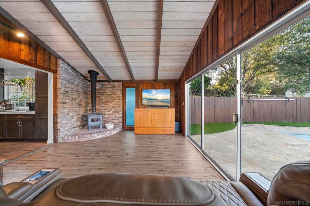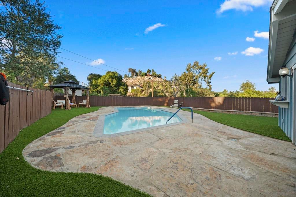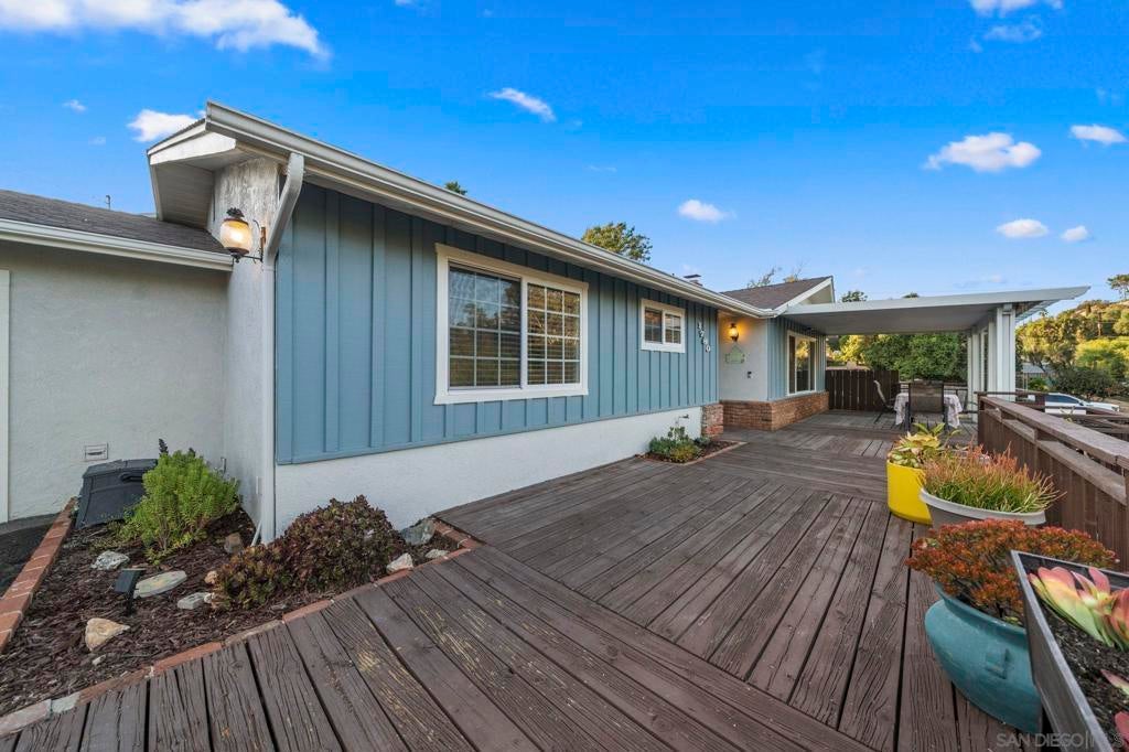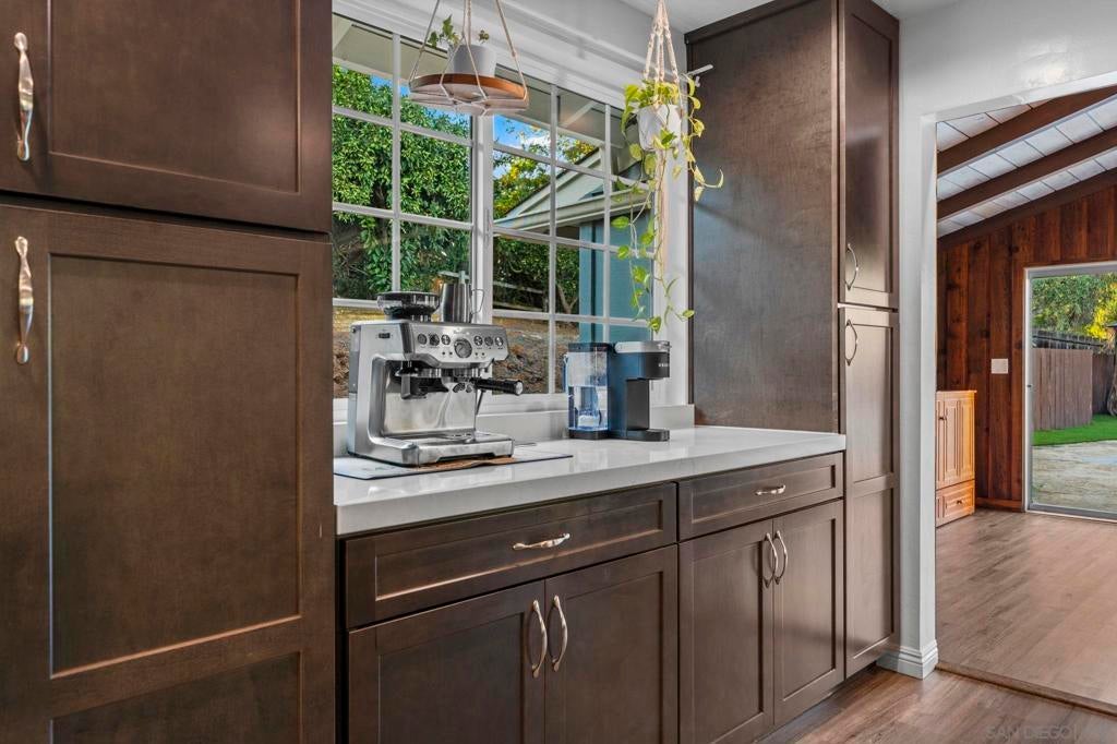 This beautifully updated single-level home in the desirable Rancho San Diego area of El Cajon offers a RARE FIVE-CAR garage setup, perfect for car enthusiasts or those in need of ample storage and workspace. It includes an attached 2-car garage and a custom-built 3-car garage with high ceilings that can accommodate tandem parking for certain vehicles. The garage also features a tankless water heater, adding to the home’s modern conveniences. The home offers 3 bedrooms, 2 bathrooms, and 1,866 square feet of living space on a peaceful hillside lot. The home sits on a usable half-acre and features a resurfaced pool with a new pump in a private, fenced-in area with synthetic turf—ideal for relaxing or entertaining, with direct access from the home. Inside, the kitchen has been fully remodeled with soft-close custom cabinetry, stainless steel appliances, a built-in wine fridge, and a coffee bar. There are two separate living areas, each with its own fireplace, creating flexible and comfortable spaces. Additional updates include high-end dual-pane windows, a newer HVAC system, and a FULLY PAID 20-PANEL SOLAR SYTEM for energy efficiency. The exterior has been treated with a $30,000 “Cool Wall” energy-efficient paint system. There’s also a private driveway, RV parking, and three additional storage sheds. The property includes mature fruit trees and plenty of open space, offering peace and quiet in a highly sought-after neighborhood. Laundry hookups are available both inside the home and in the garage.
