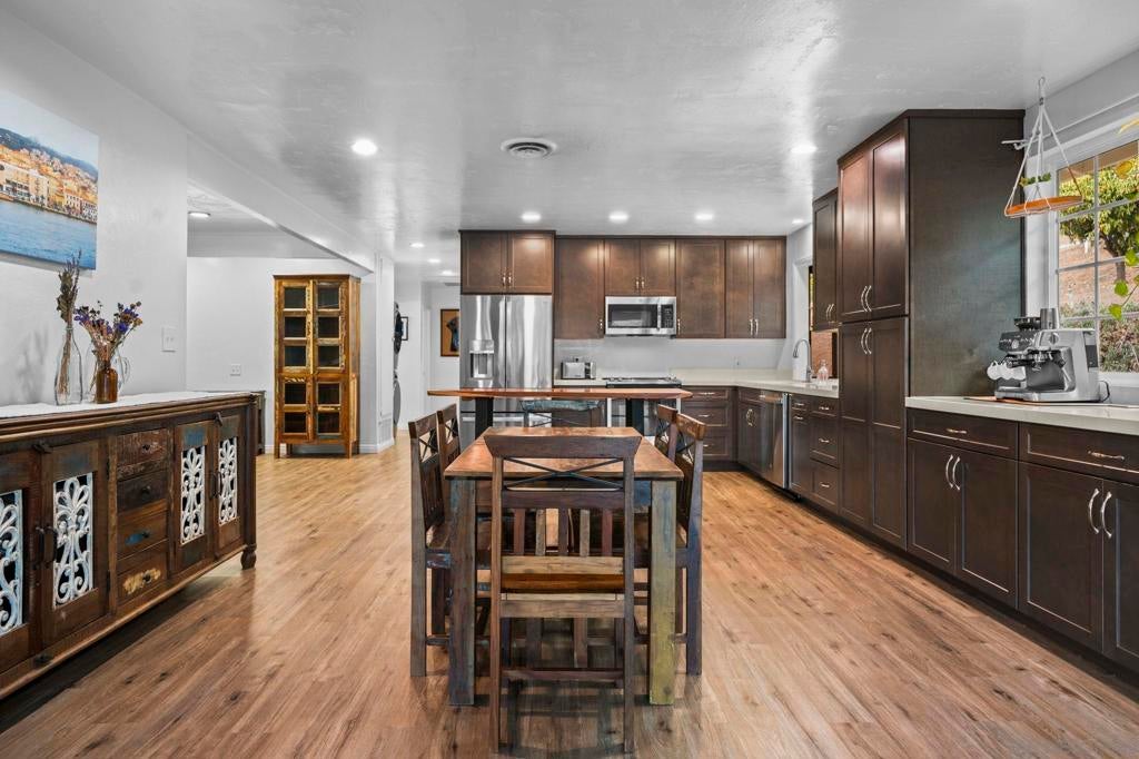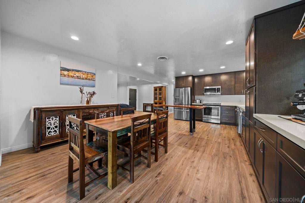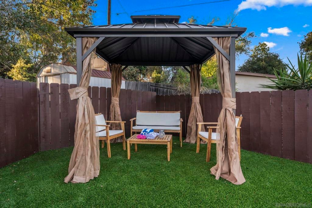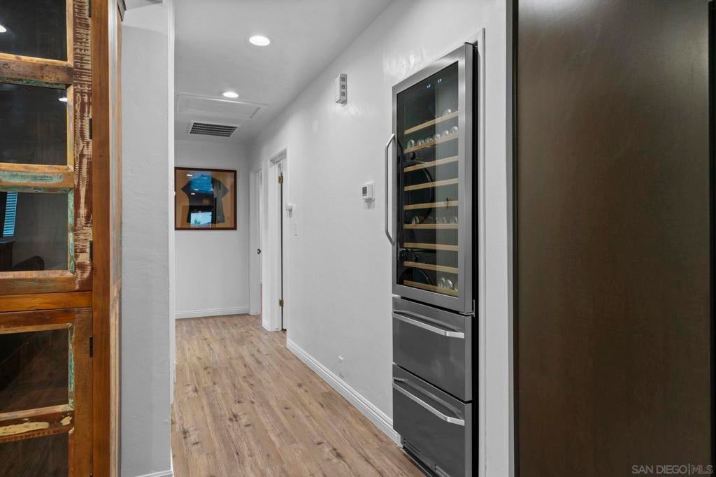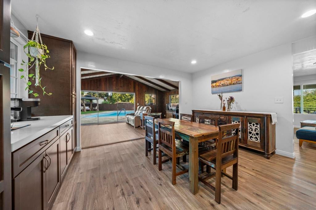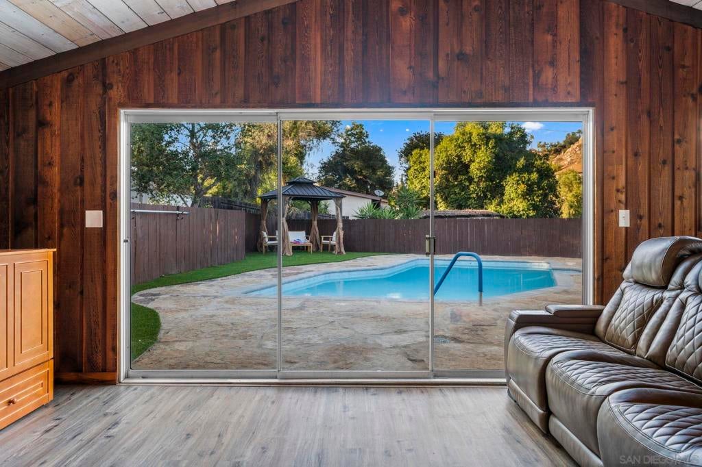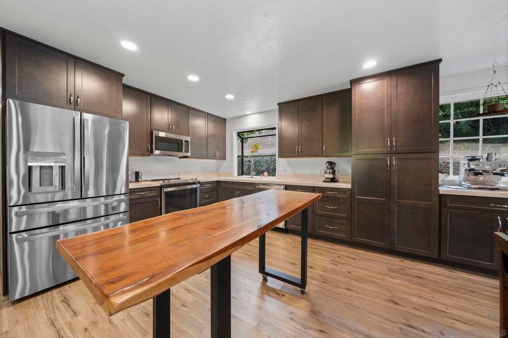 This beautifully updated single-level home in the desirable Rancho San Diego area of El Cajon offers a RARE FIVE-CAR garage setup, perfect for car enthusiasts or those in need of ample storage and workspace. It includes an attached 2-car garage and a custom-built 3-car garage with high ceilings that can accommodate tandem parking for certain vehicles. The garage also features a tankless water heater, adding to the home’s modern conveniences. The home offers 3 bedrooms, 2 bathrooms, and 1,866 square feet of living space on a peaceful hillside lot. The home sits on a usable half-acre and features a resurfaced pool with a new pump in a private, fenced-in area with synthetic turf—ideal for relaxing or entertaining, with direct access from the home. Inside, the kitchen has been fully remodeled with soft-close custom cabinetry, stainless steel appliances, a built-in wine fridge, and a coffee bar. There are two separate living areas, each with its own fireplace, creating flexible and comfortable spaces. Additional updates include high-end dual-pane windows, a newer HVAC system, and a FULLY PAID 20-PANEL SOLAR SYTEM for energy efficiency. The exterior has been treated with a $30,000 “Cool Wall” energy-efficient paint system. There’s also a private driveway, RV parking, and three additional storage sheds. The property includes mature fruit trees and plenty of open space, offering peace and quiet in a highly sought-after neighborhood. Laundry hookups are available both inside the home and in the garage.