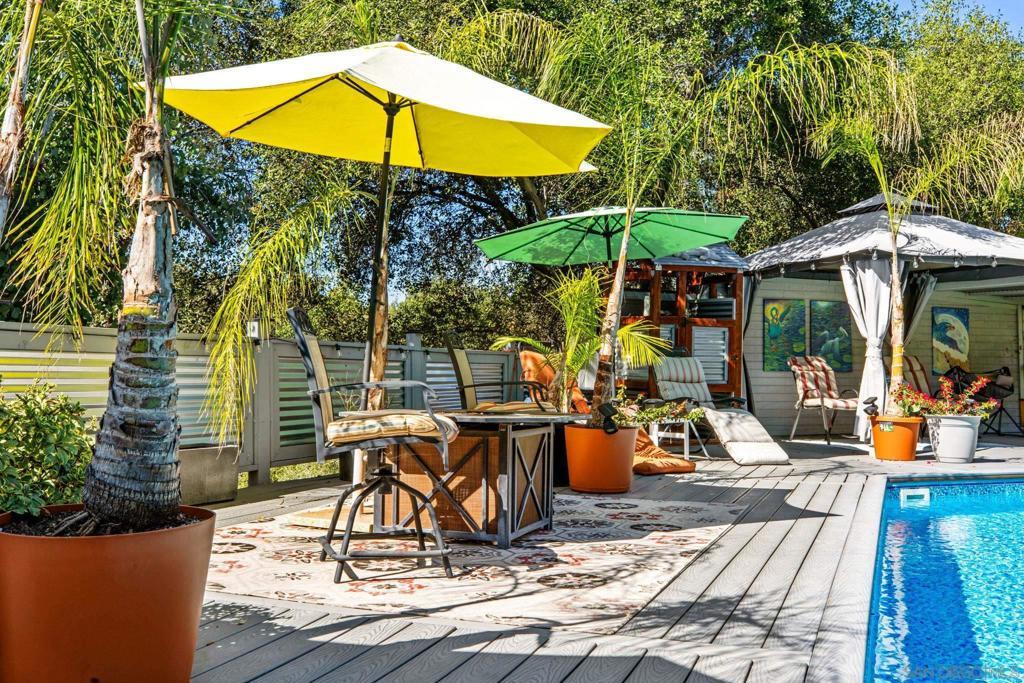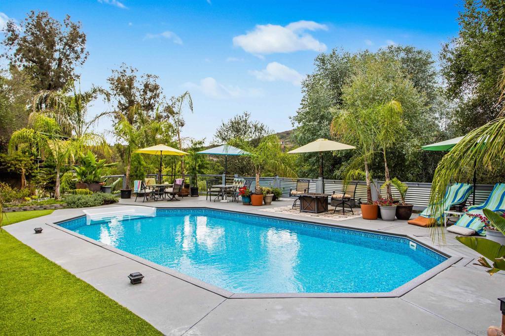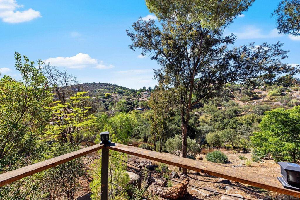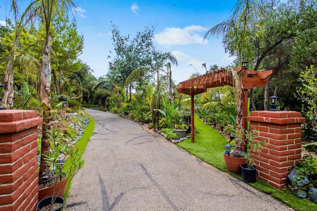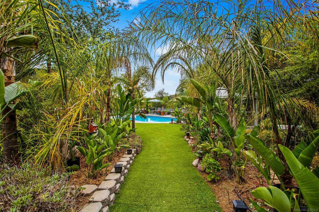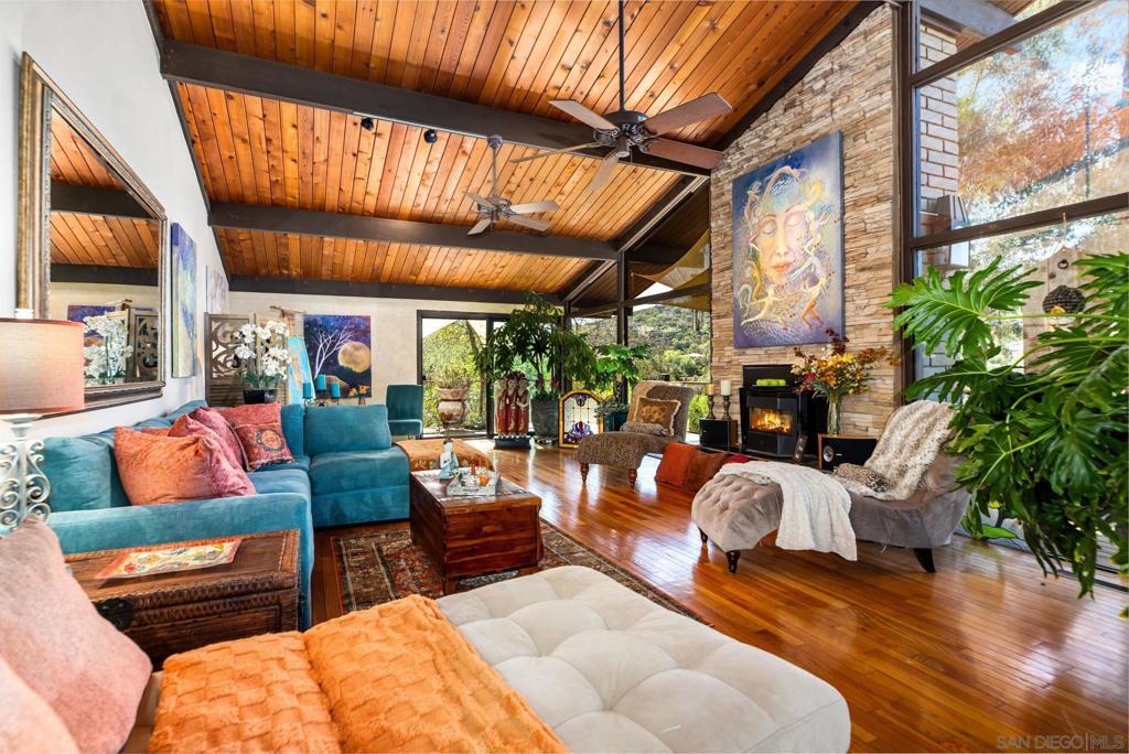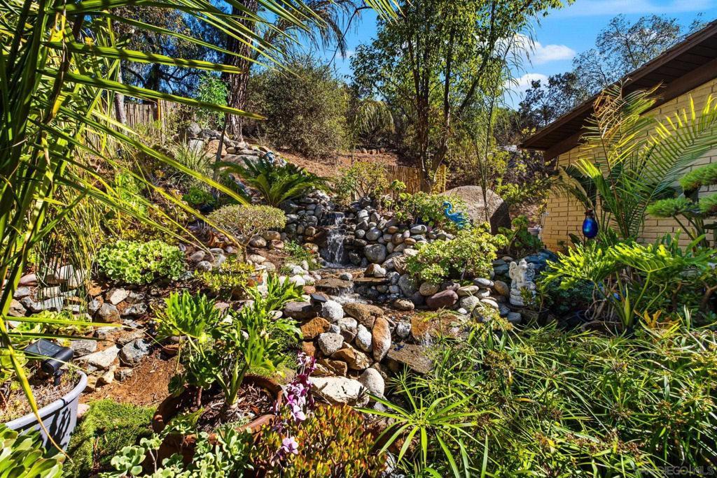 It’s as unique as you are—your own private, tropical retreat nestled in the foothills with stunning views of hawks circling the treetops. It’s calm, quiet, and tucked away from it all in Palo Verde Ranch—yet you're just minutes from stores and restaurants. This jaw-dropping custom home is a rare, one-of-a-kind find. An artful 25 foot high waterfall cascades down as you approach the front door and flows under a bridge—each time you walk across it, you slow down and breathe a little deeper. The spectacular soaring glass foyer welcomes you in. Floor to ceiling windows flood the sprawling living/dining area with natural light, and the warm honey-toned high vaulted ceilings give a golden glow. A dramatic 20 foot high stacked stone fireplace anchors the space. The updated open-concept kitchen and den—with its stacked stone wall, fireplace, and granite hearth exude comfort and ease. Real hardwood floors, custom details, and thoughtful design give this home its uncommon blend of elegance, warmth, and character. All three bedrooms boast the rich, honey-colored vaulted wood ceilings. The serene primary has a spacious walk in closet and a high deck with views. There are two and a half bathrooms, plus a bonus space—ideal for a home office, guest area, or creative studio. All rooms except one connect to the outdoors through large sliders, and each of four decks offers a different view of the trees, boulders, and mountains. A breezy 27x27 covered deck adds even more outdoor living space for dining, entertaining, and spectacular sunsets. You also get owned solar, zoned AC plus a bedroom unit, a two-car garage with half bath and laundry, two carports, a 16x12 detached workshop, and ample parking space. The sparkling salt water pool with its giant Trex deck, gazebo, and carefree turf is perfect for relaxing. With 107 queen palms waving gracefully in the near-constant gentle breeze, 40 giant bird of paradise, and multi-colored flowers, visitors ask if this is a resort. The landscaping conserves water, doesn’t require mowing, blends with nature, and is lit with solar lights. Massage your worries and aches away in the chlorine-free 30-jet hot tub, visited by hummingbirds, owls, and doves. Equestrians and hikers appreciate the miles of trails right out the door. The barn can be used for horses or storage. Walk one block to a gorgeous lake, tennis/pickleball courts, a horse arena, and picnic pavilion set amongst picturesque ancient oaks, giant boulders, and trails with views of the Cuyamaca Mountains beyond. As part of the Palo Verde Ranch community, you also enjoy a clubhouse, gym, another park with a larger lake, sand beach, and lush lawn, a boat dock (electric boats only,) fishing, huge picnic pavilion, fun events, and more. This kind of property rarely comes along—peaceful, private, and unique character, all in a well-established, friendly community with top-notch amenities yet unbelievably low dues. If you’ve been looking for a home that feels like being on year-round holiday, this might be the one.