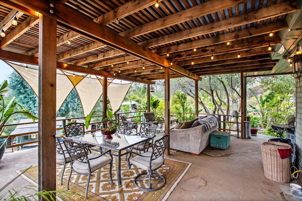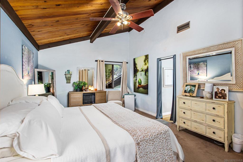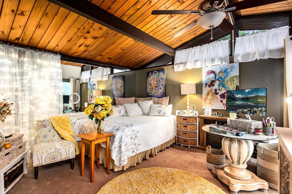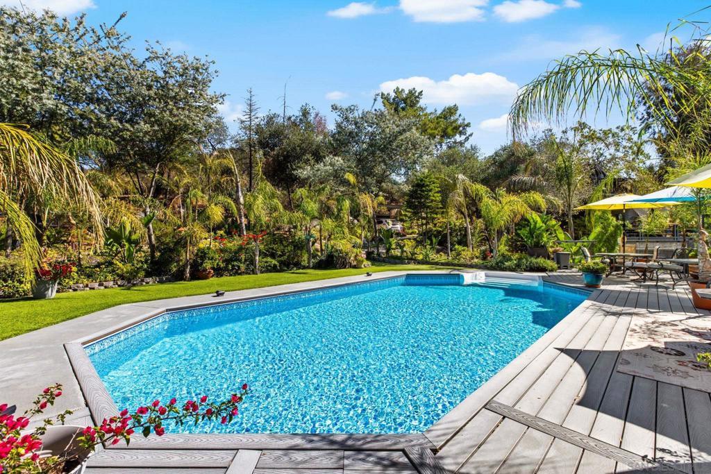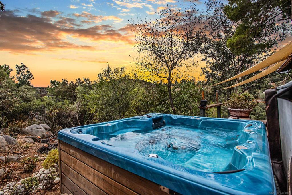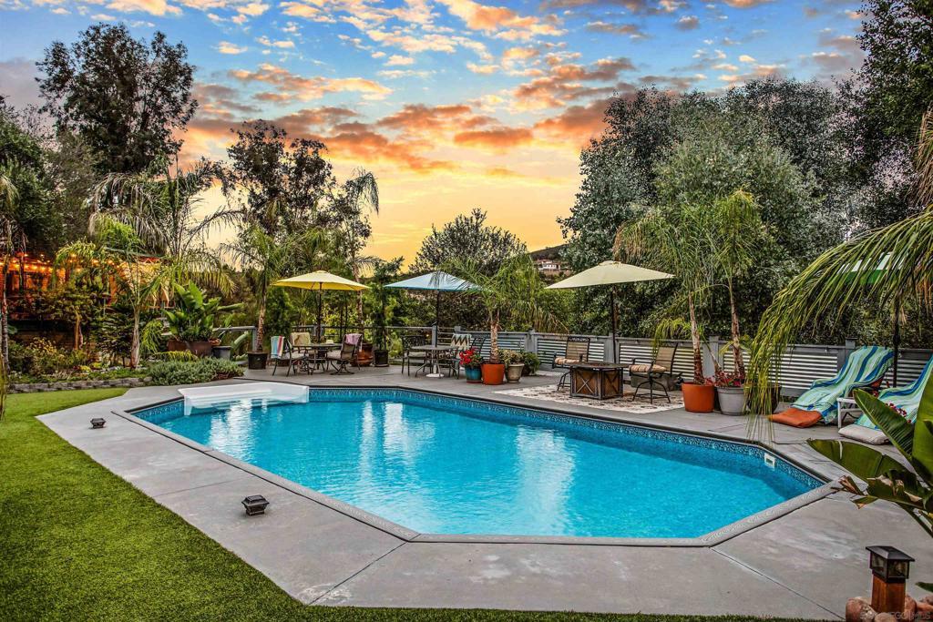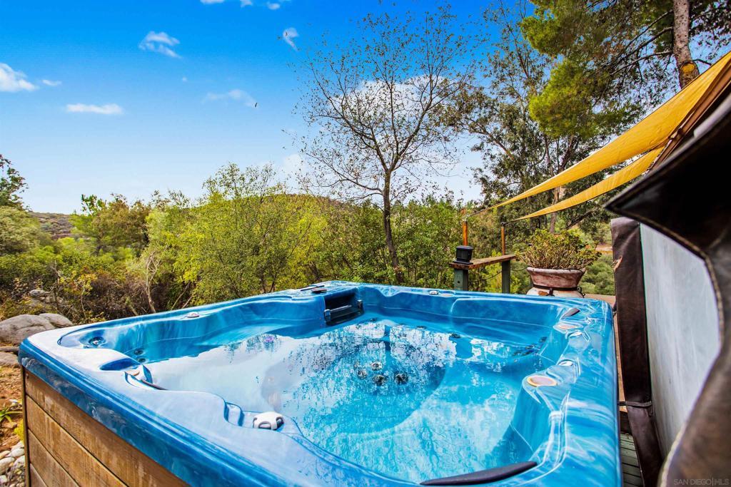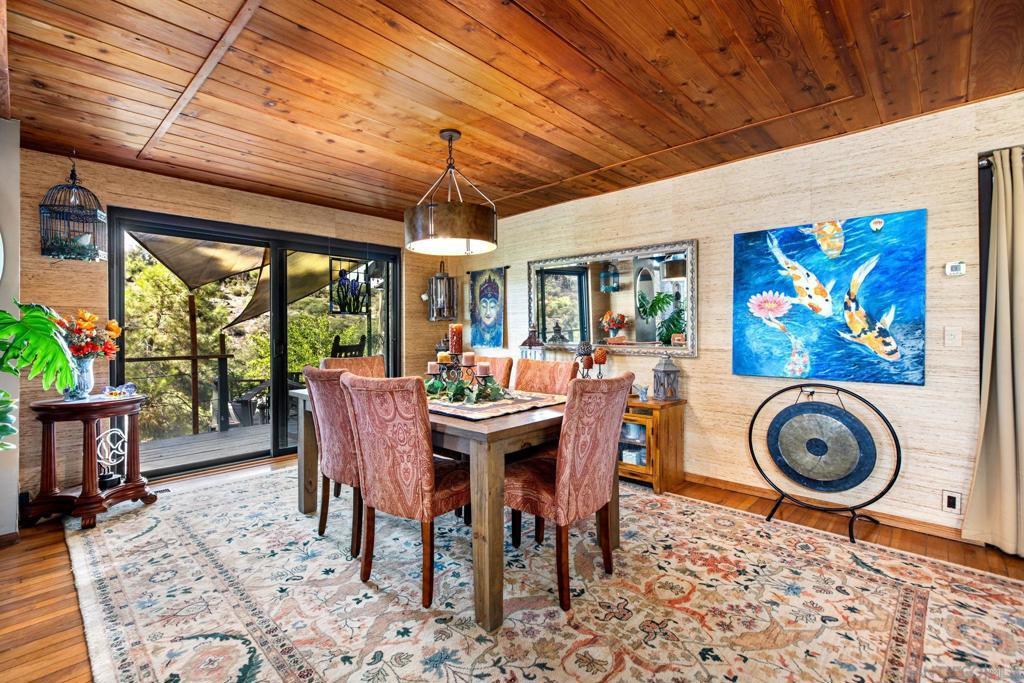 It’s as unique as you are—your own private, tropical retreat nestled in the foothills with stunning views of hawks circling the treetops. It’s calm, quiet, and tucked away from it all in Palo Verde Ranch—yet you're just minutes from stores and restaurants. This jaw-dropping custom home is a rare, one-of-a-kind find. An artful 25 foot high waterfall cascades down as you approach the front door and flows under a bridge—each time you walk across it, you slow down and breathe a little deeper. The spectacular soaring glass foyer welcomes you in. Floor to ceiling windows flood the sprawling living/dining area with natural light, and the warm honey-toned high vaulted ceilings give a golden glow. A dramatic 20 foot high stacked stone fireplace anchors the space. The updated open-concept kitchen and den—with its stacked stone wall, fireplace, and granite hearth exude comfort and ease. Real hardwood floors, custom details, and thoughtful design give this home its uncommon blend of elegance, warmth, and character. All three bedrooms boast the rich, honey-colored vaulted wood ceilings. The serene primary has a spacious walk in closet and a high deck with views. There are two and a half bathrooms, plus a bonus space—ideal for a home office, guest area, or creative studio. All rooms except one connect to the outdoors through large sliders, and each of four decks offers a different view of the trees, boulders, and mountains. A breezy 27x27 covered deck adds even more outdoor living space for dining, entertaining, and spectacular sunsets. You also get owned solar, zoned AC plus a bedroom unit, a two-car garage with half bath and laundry, two carports, a 16x12 detached workshop, and ample parking space. The sparkling salt water pool with its giant Trex deck, gazebo, and carefree turf is perfect for relaxing. With 107 queen palms waving gracefully in the near-constant gentle breeze, 40 giant bird of paradise, and multi-colored flowers, visitors ask if this is a resort. The landscaping conserves water, doesn’t require mowing, blends with nature, and is lit with solar lights. Massage your worries and aches away in the chlorine-free 30-jet hot tub, visited by hummingbirds, owls, and doves. Equestrians and hikers appreciate the miles of trails right out the door. The barn can be used for horses or storage. Walk one block to a gorgeous lake, tennis/pickleball courts, a horse arena, and picnic pavilion set amongst picturesque ancient oaks, giant boulders, and trails with views of the Cuyamaca Mountains beyond. As part of the Palo Verde Ranch community, you also enjoy a clubhouse, gym, another park with a larger lake, sand beach, and lush lawn, a boat dock (electric boats only,) fishing, huge picnic pavilion, fun events, and more. This kind of property rarely comes along—peaceful, private, and unique character, all in a well-established, friendly community with top-notch amenities yet unbelievably low dues. If you’ve been looking for a home that feels like being on year-round holiday, this might be the one.
