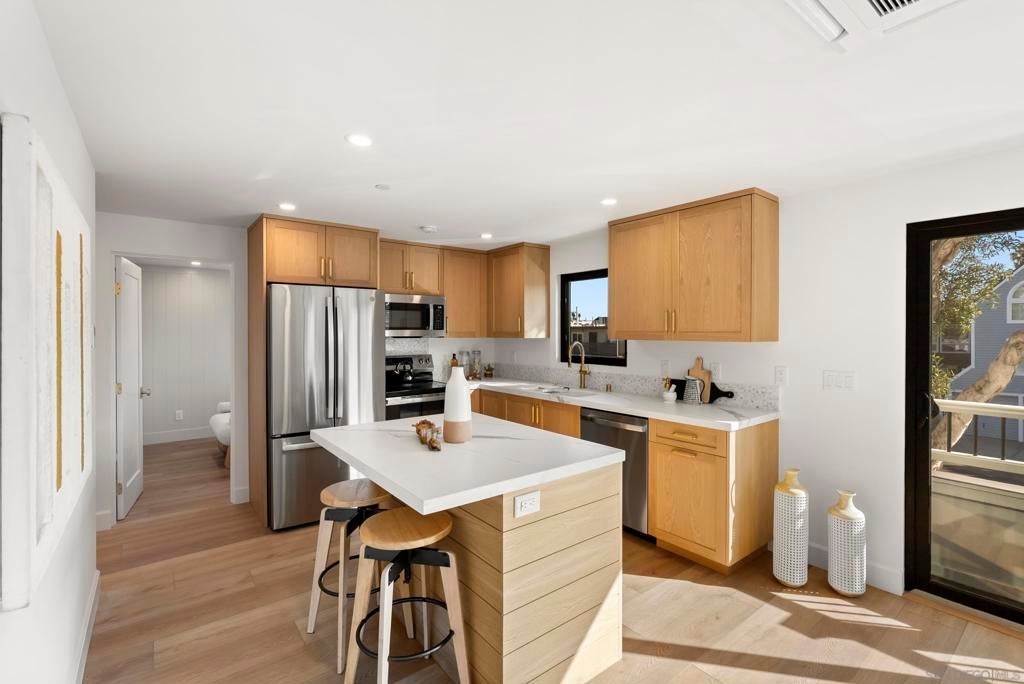 Introducing the Fantasket 3 Townhomes, a sleek and modern coastal Cape Cod–style new construction development featuring three luxury residences on the ocean side of Mission Beach. This is an exclusive opportunity, with the next door home already pending! Built by a highly reputable local builder and backed by a full builder warranty, this 4-bedroom, 4-bath home spans three thoughtfully designed levels and offers the ultimate in low-maintenance, luxury beach living. The first floor features a versatile bedroom or ideal home office with direct front patio access, a full bath, laundry closet, and a direct-access tandem two-car garage. On the second floor, enjoy an open-concept living space with a balcony, a modern kitchen with stainless steel appliances, a dining area, and a bedroom and a full bath. The third floor showcases a primary suite with a spa-inspired bathroom and private balcony, along with another spacious ensuite bedroom that also enjoys its own balcony. A private rooftop deck crowns the home, offering 360° panoramic views of Mission Beach, the Pacific Ocean, and Mission Bay—ideal for entertaining or sunset relaxation. Additional highlights include Atlantis waterproof luxury vinyl plank flooring, designer finishes, wainscoting accents, central heating and A/C splits, and in-unit laundry. Just steps from the sand and walking distance to Belmont Park, Bonita Cove, Fit Athletic Club, The Plunge, and popular dining destinations, this townhome is perfectly suited for full-time coastal living, a vacation retreat, or a premium investment property.