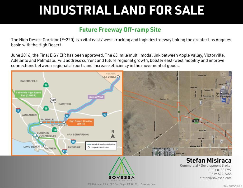 Vacant industrial land that lies within the North Apple Valley Industrial Specific Plan, an area where many developers and land investors have acquired hundreds of acres in anticipation of future growth. The Specific Plan includes 6,221 acres of designated land to facilitate industrial and commercial development for the city. Existing development includes Walmart' s 1.3 Million square foot Distribution Center, and Big Lots 1.4 Million square foot Distribution Facility with an estimated 400-500 new jobs and Ameritex Manufacturing Plant with an estimated 150 new jobs. Over 6.7 Million SF of industrial buildings in various stages of entitlement nearby