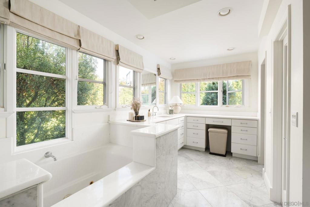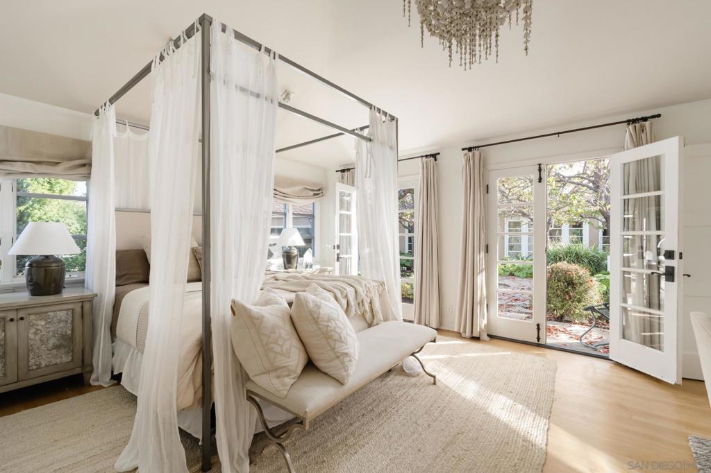 Ideally located on one of the most sought-after streets in the renowned Rancho Santa Fe Covenant, with views of beautiful sunsets and the golf course, is this enchanting single-level home seamlessly combines charm, sophistication, and functionality. Your private oasis awaits with an expansive backyard that borders acres of open space, impeccably groomed trails, and just a short walk to the Rancho Santa Fe Village, the acclaimed Roger Rowe Elementary and Middle schools and the Rancho Santa Fe Golf and Tennis clubs. You will immediately fall in love with the beauty of the lush landscape and the inviting private courtyard entry. The home boasts a freshly remodeled kitchen, and exquisite reclaimed maple floors throughout. It has a sun-drenched great room, and a gourmet eat-in kitchen, that seamlessly open onto the pool and entertaining areas with westerly views and gentle ocean breezes. The interior design includes 5 bedrooms, 4.5 baths and floor-to-ceiling windows and French doors that seamlessly caters to the indoor/outdoor living you can enjoy year-round in San Diego.