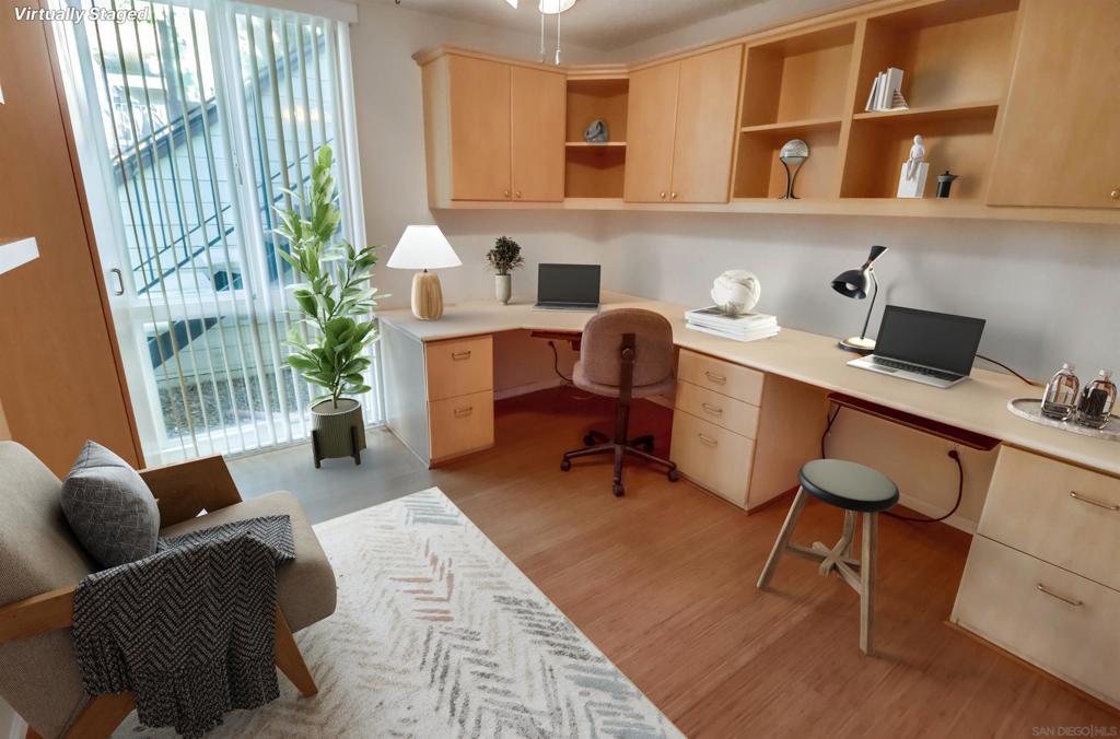 Step into this bright and inviting first-level unit, featuring hard surface flooring and tasteful upgrades throughout. Floor-to-ceiling windows fill each room with natural light, while ceiling fans provide year-round comfort. The upgraded kitchen includes matching white appliances, a built-in microwave, and plenty of cabinet space. The living area offers custom built-in cabinetry for stylish and functional storage. Enjoy a spacious primary bedroom complete with a well-organized walk-in closet and en suite bathroom. The secondary bedroom is thoughtfully designed with a full wall of office cabinetry and dual desks — perfect for working or studying from home. Additional highlights include an in-unit laundry room, a relaxing front patio, and an assigned gated parking space. The centrally located community offers great amenities, including a sparkling pool and spa. In the heart of Serra Mesa, this move-in-ready home combines comfort, convenience, and style — a must-see property you’ll love to call your own!