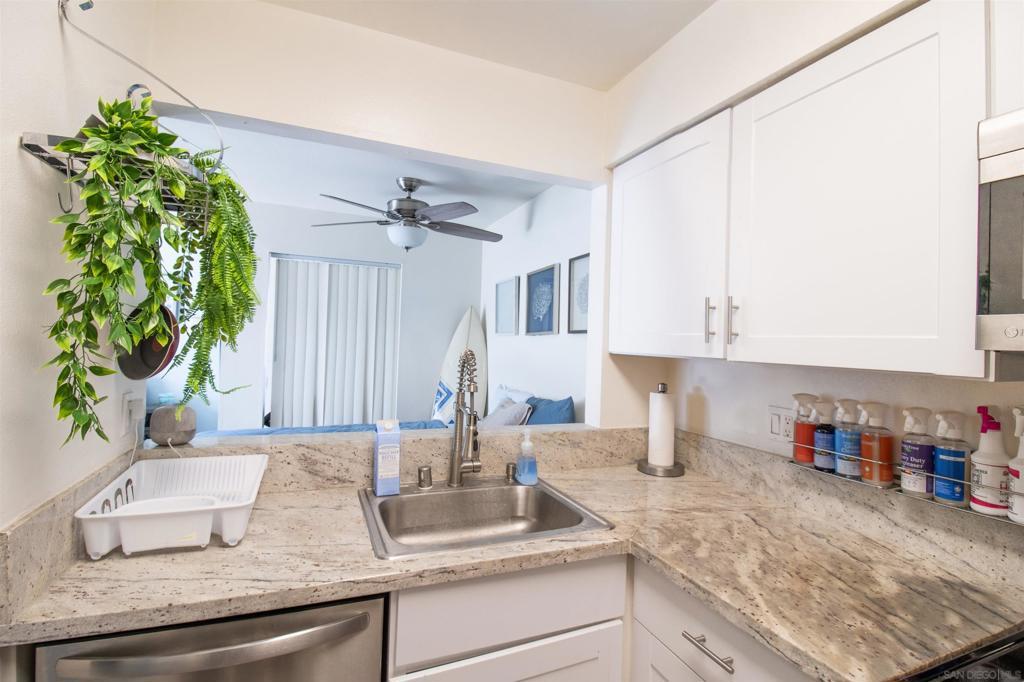 Beautiful studio condo in the heart of Mission Valley San Diego, in a gated community. Fully renovated, featuring an open concept kitchen with stainless appliances, large closet, full tub/shower, and large balcony over looking lush grounds and fountain. Deeded with 1 parking space, community has a lovely pool and spa and near shopping, highways, and more. Close to mall and public transportation.