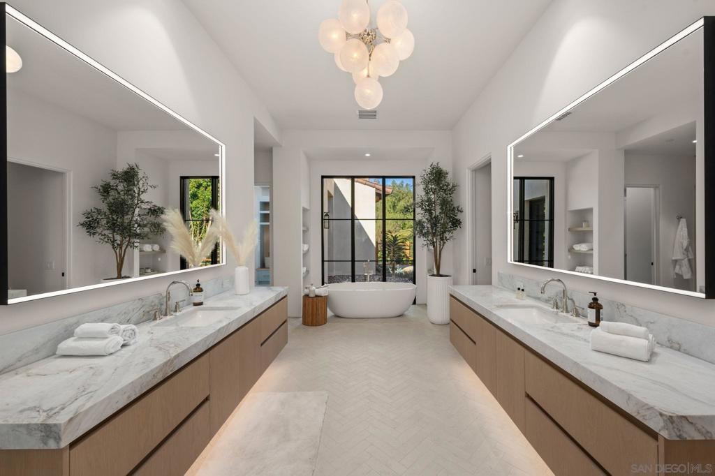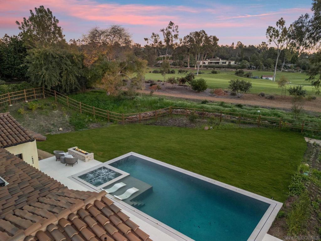 Brand-New, Custom Construction by master builder Greg Agee. 6323 Mimulus in Rancho Santa Fe Covenant will capture you immediately and is positioned on one of the most desirable streets. Set on a beautiful & usable lot with wide fairway views, direct access to the Covenant's 60 miles of walking/running trails with mature oak plus sycamore trees. Inside, European white oak floors and abundant natural light create a calm, refined atmosphere, while Sonos surround sound with invisible speakers add to the ambience. Custom detailing such as museum lighting with invisible trims in primary entrance spaces, accent lighting by top designers Kelly Wearstler and Aerin Lauder are displayed in the great room, kitchen, and bedroom suites. Fireside great room designed with dramatic wood beams open through expansive sliding doors to an outdoor living area complete with skylights, fireplace and flush mount ceiling heaters blending seamlessly with the wet-edge saltwater pool/spa, outdoor firepit and lush turf area designed for lounging overlooking the golf course. The designer kitchen offeres a wall of sleek walnut cabinetry, slab poplar white Quartzite, Subzero refrigerator, Wolf appliances including steamer & 48" full gas range plus back kitchen/pantry. The sumptuous primary suite offers a tranquil retreat with Steam shower with skylight, Infrared Sauna, custom LED mirrors, and a private patio with hook up for Cold Plunge. Additional amenities include 4K home Movie Theater, game room with wet bar, gym, owned Solar, Race fuber internet, 4-car and private motor gated entry.
