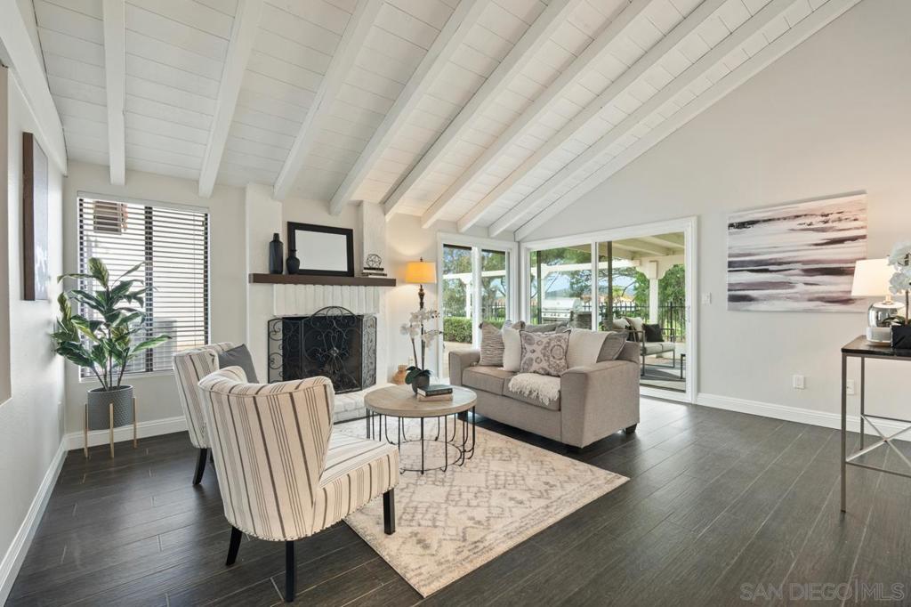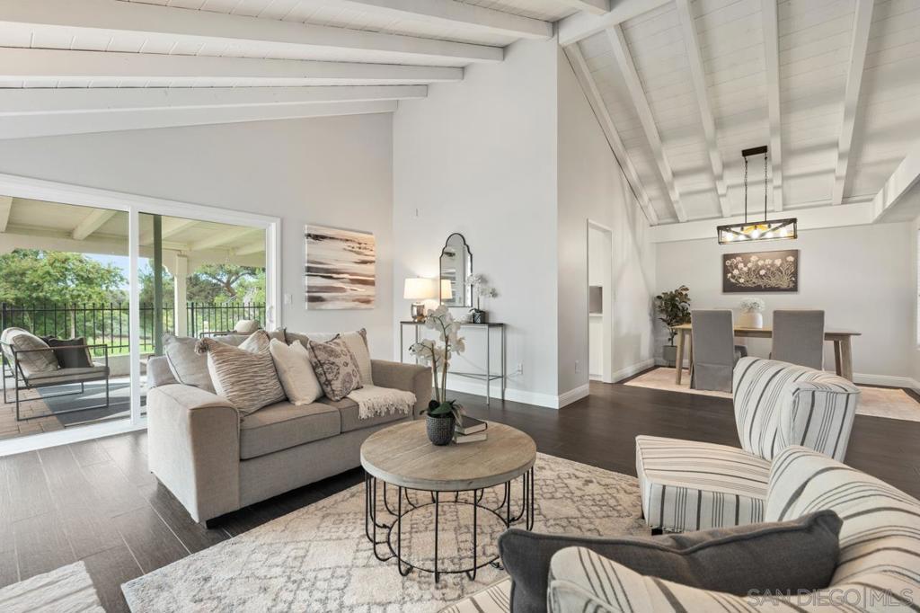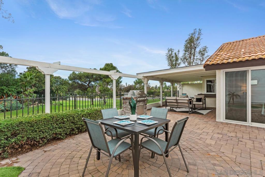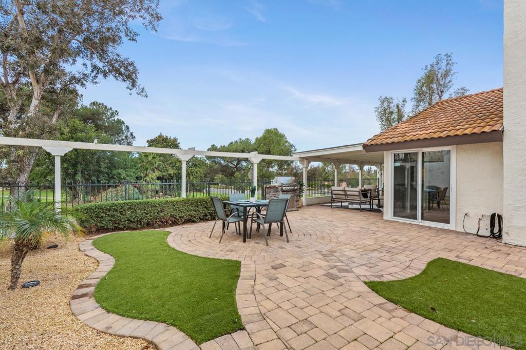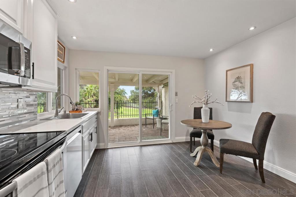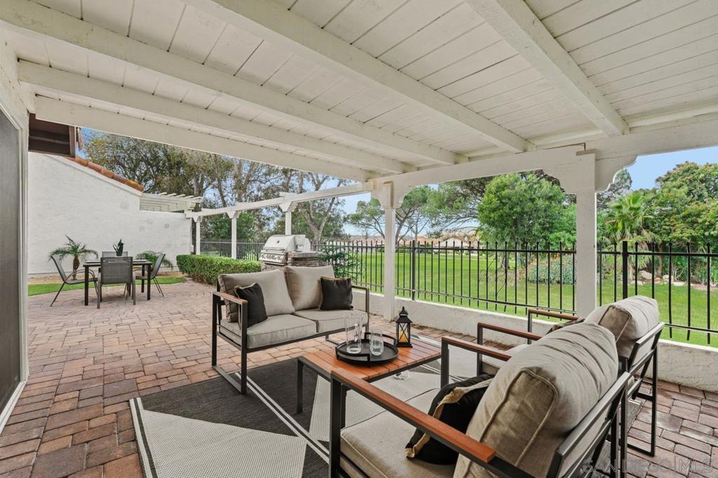 Enjoy stunning golf course views in this beautifully upgraded single story home in the desirable 55+ community of Oaks North. The spacious partially covered patio features beautiful pavers and artificial turf and a built-in BBQ, plenty of room to relax or entertain. Inside, the formal living room boasts vaulted beamed ceilings and a cozy wood-burning fireplace. The formal dining area is highlighted by a custom light fixture. The remodeled kitchen showcases upgraded countertops, a stylish tile backsplash, an oversized sink, stainless steel appliances (refrigerator included), and space for a breakfast table. Additional highlights include beautiful wood-look porcelain plank flooring throughout, upgraded windows and sliding doors, newer HVAC system, and French doors leading into the large primary suite. The primary bath offers dual sinks, a makeup vanity, an upgraded glass shower enclosure, and a walk-in closet. A sliding door from the primary suite provides direct access to the backyard. The home also includes an indoor laundry closet with space for a full-size washer and dryer (newer Samsung set included), spacious secondary bedrooms—one with French doors and mirrored wardrobes—and an oversized two-car garage with room for a golf cart or extra storage. The active Oaks North Community Center features a pool, spa, sauna, fitness room, art and woodworking studios, and a library. Residents can enjoy lawn bowling, pickleball, tennis, dance, travel clubs, and more. The Oaks North Golf Course offers three executive courses, and the popular Bernardo Winery—just one mile away—features live music, great dining, and charming local shops. Conveniently located near grocery stores, retail, and only 10 minutes from the I-15 for easy access to all of San Diego.