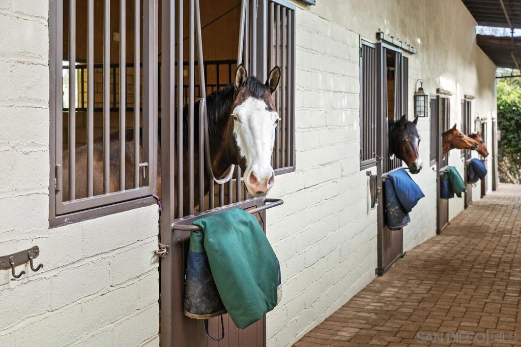 Nothing can Compare ~ Welcome to 16337 Los Arboles in Rancho Santa Fe Covenant. This Monterey Spanish-Colonial seamlessly blends historic Charm with Modern Luxury. A meandering driveway leads you up and over cascading waterfalls, past a Tennis/Sports Pavilion, Breathtaking VISTAS, unveiling immaculate mature landscaping and a true sense of arrival. The main residence, an original Lilian Rice core that was expanded later, offers effortless single-level style living with multiple guest homes, including a true Ranch-Hand Home + 2 Detached Guest Homes, and 8-stall barn with separate entrance. Designed for both grand entertaining and serene retreat, the estate boasts an expandable Equestrian Arena, a resort-style New pool, a state-of-the-art Wellness/Gym retreat, an outdoor Movie Theater, and the finest card room in San Diego. Cutting-edge Sonos surround sound and Starlink connectivity enhance the experience, while tranquil fountains elegantly grace the grounds and create an oasis reminiscent of an elaborate and private Rancho Valencia Resort. This is luxury redefined—a sanctuary of beauty, comfort, and sophistication with 10-car garage, 8+ bedrooms and over 10,000 sq. ft. of premier Southern California living. *Selling Furnished w/ Art. Some exclusions*