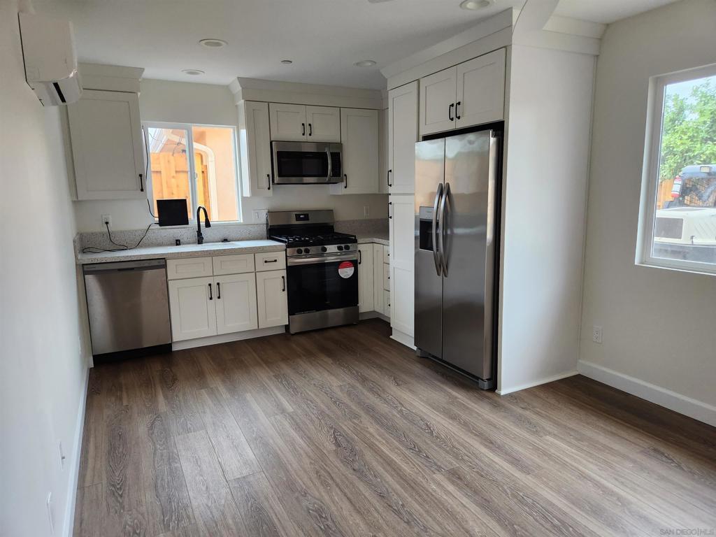 There are 3 units on the lot. This 1-story Junior ADU is behind the 2-story front house. Kitchen is equipped with stainless steel refrigerator, dishwasher, microwave, gas range/stove. Laminate flooring throughout the unit. LED lighting. HVAC, solar, fire sprinkler system, stackable washer/dryer hookups. Private yard. Parking outside the unit.