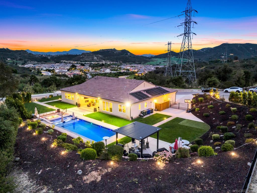 Discover refined modern living in this newer single-story smart home, beautifully positioned on 1.5 acres of tranquil, view-filled landscape. Nestled on a serene, elevated cul-de-sac, this 2020 Lennar masterpiece features nearly $300,000 in custom landscaping, creating a true resort retreat. A stunning saltwater pool and spa anchor the outdoor oasis, while a dramatic fire pit with seating for 30 sets the stage for unforgettable entertaining. With paid solar and Tesla batteries, the home produces enough energy to run the entire property and heat the pool year-round. Elevated perfectly to capture sweeping vistas, this home delivers luxury, efficiency, and serenity in one extraordinary package. See supplement for more. Crafted for those who value privacy, luxury, and effortless indoor–outdoor living, this stunning single-story residence sits on beautifully landscaped grounds designed for true resort-style enjoyment. A custom saltwater pool and spa anchor the backyard, complemented by a dramatic fire pit with built-in seating for 30, a shaded pergola lounge, and a designer mobile outdoor kitchen for seamless al fresco dining. A gated side access with steps adds convenience and flow. Inside, soaring ceilings and natural light create an inviting, modern atmosphere. The great room features disappearing glass walls that blend into a stylish California room with fireplace, outdoor TV, and motorized shades—mirrored by automated window treatments in the living area. The chef’s kitchen impresses with high-end stainless appliances, a large quartz island, custom cabinetry, and both butler’s and walk-in pantries. The dining area frames picturesque views through floor-to-ceiling windows. Four ensuite bedrooms plus a flexible bonus room offer space for an office, studio, gym, or media room. The primary suite includes elegant molding, a spa-like bath with freestanding tub, dual vanities, a frameless shower, and a generous walk-in closet. California Closet built-ins enhance the primary suite, living room, and garage. Smart-home upgrades include voice-controlled thermostat, tankless water heater, Ring doorbell, paid solar (also heating the pool), Tesla batteries, EV pre-wire, generator, self-cleaning pool robots, LED lighting, dual A/C zones, alarm system, fire sprinklers, low-energy windows, and ceiling fans in all rooms. Yard is pre-wired for additional gas/electric and includes a turf pet area. The solar/battery system produces enough energy to power the home, heat the pool, and generate credits year-round. Harmony Grove Village amenities include a resort pool, spa, clubhouse, grilling areas, multiple parks, dog park, and over two miles of scenic trails for hiking, biking, and horseback riding.