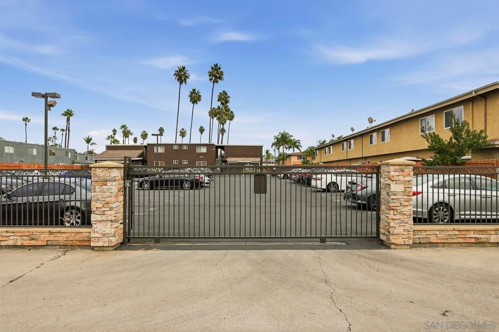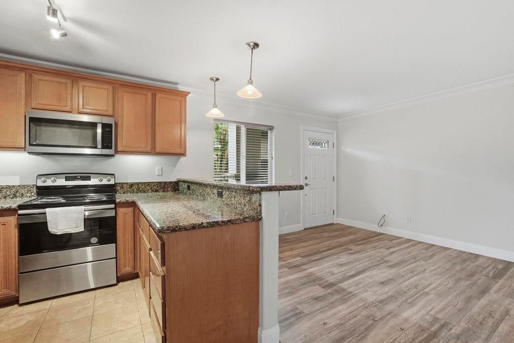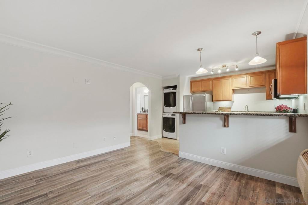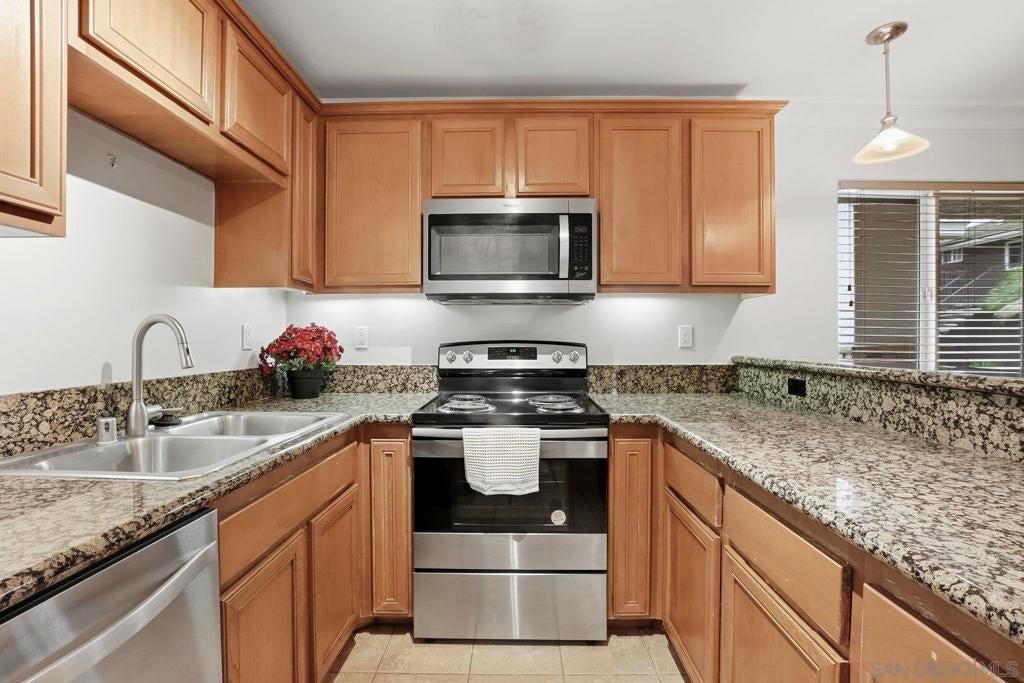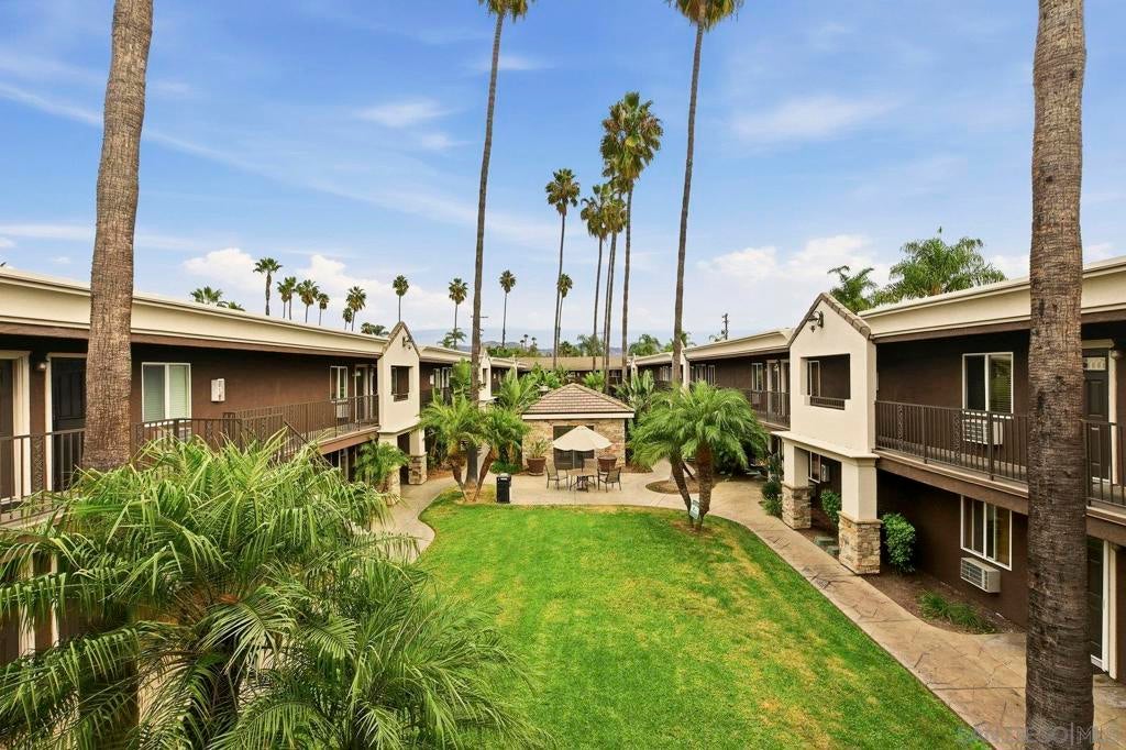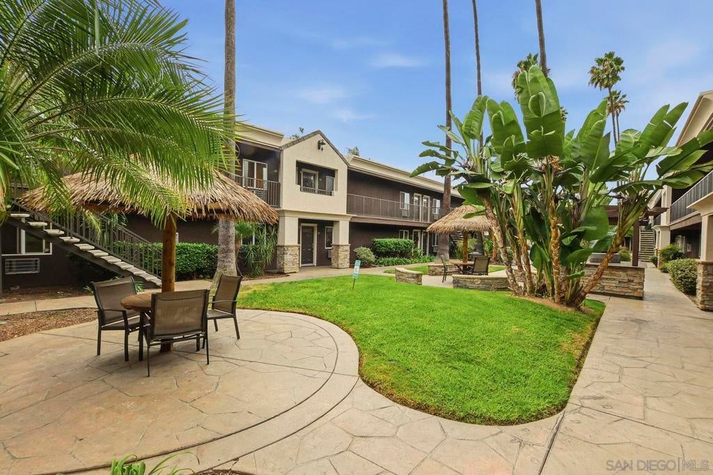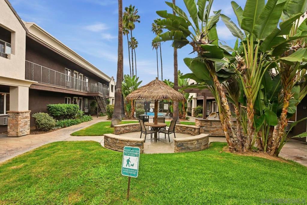 Ground-floor condo in the gated community of Villa Grigio. This 1-bedroom unit offers a practical, easy-to-maintain layout with fresh paint. The kitchen features granite counters, stainless steel appliances, plenty of cabinet space, and an eat-in counter that opens to the living area. The bedroom includes mirrored closet doors, and the full bathroom offers granite counters and a tiled tub/shower. An in-unit stacked washer and dryer add convenience. Villa Grigio offers a pool, fitness room, BBQ area, and a well-kept courtyard with multiple seating areas and lush tropical landscaping. Pet-friendly community with restrictions per CC&Rs/HOA. One assigned parking space included. Convenient central location close to shopping, restaurants, and freeway access. The complex is approved for VA and conventional financing.