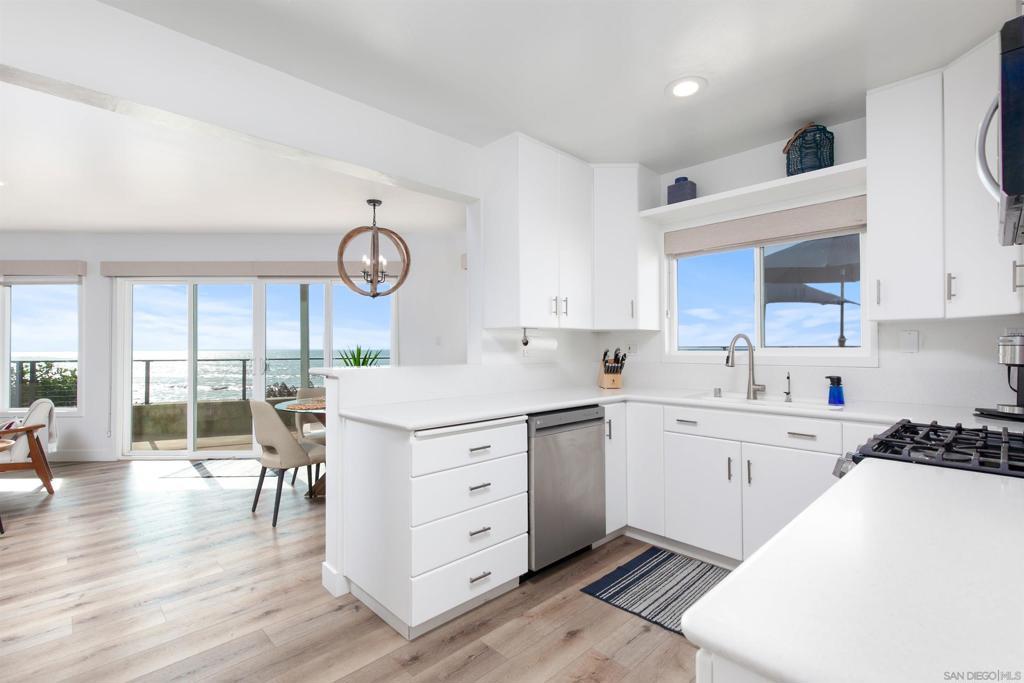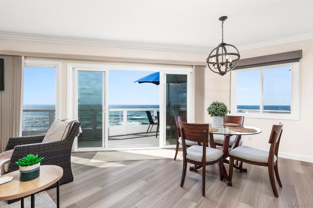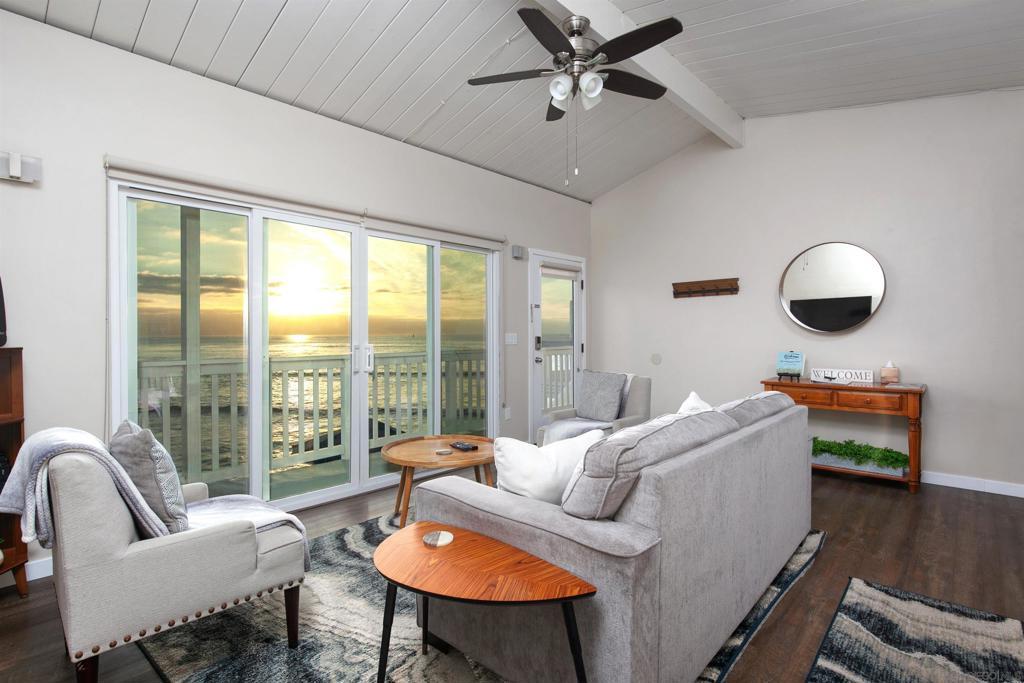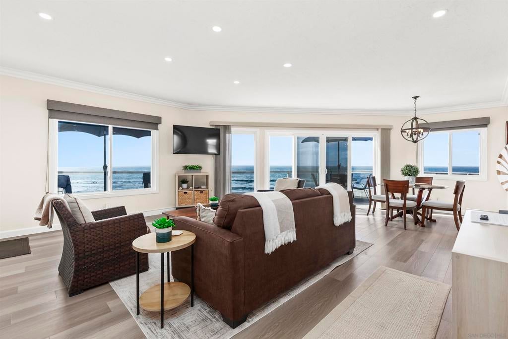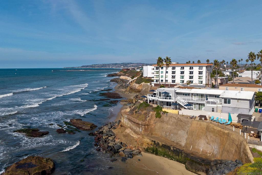 Rare true oceanfront income property in Sunset Cliffs with sweeping ~280° sit-down ocean views, exceptional privacy, and beautifully renovated, turn-key interiors. Includes four upgraded 2BR residences plus two well-finished bonus studio units, offering excellent flexibility and income potential. Renovations from 2020–2025 include quartz counters, stainless appliances, LVP flooring, updated baths, dual-pane windows, and cohesive coastal-modern finishes. Three residences perform strongly as VRBO short-term rentals, while the remaining units are month-to-month long-term rentals with significant upside. Additional highlights: rare 4-car garage, new garage doors, new staircases, and multiple ocean-facing decks/patios. The renovation included major permitted improvements, expanded living areas, and comprehensive upgrades to core systems including HVAC with central air conditioning, plumbing, and electrical, along with a newly rebuilt garage and additional finished living space above. Multiple outdoor decks were created to maximize panoramic views, including decks off the primary suite, living area, and the library/bedroom suite above the garage. The kitchen is appointed with a full Thermador suite including refrigerator/freezer columns, wine refrigerator, double ovens, and a 6-burner range with griddle and pot filler, plus a large granite waterfall island with seating for five. Decking is Trex with updated iron railings, and the patio is plumbed for gas for a future fire feature. The primary suite features Italian Carrara marble finishes, dual sinks, separate water closet, walk-in closet and additional closet storage, and the primary bath and powder room are equipped with bidets. The lower level functions as a true guest suite with a spacious family room, full kitchenette, separate entry, laundry, large closets, plus a private bedroom and full bath.