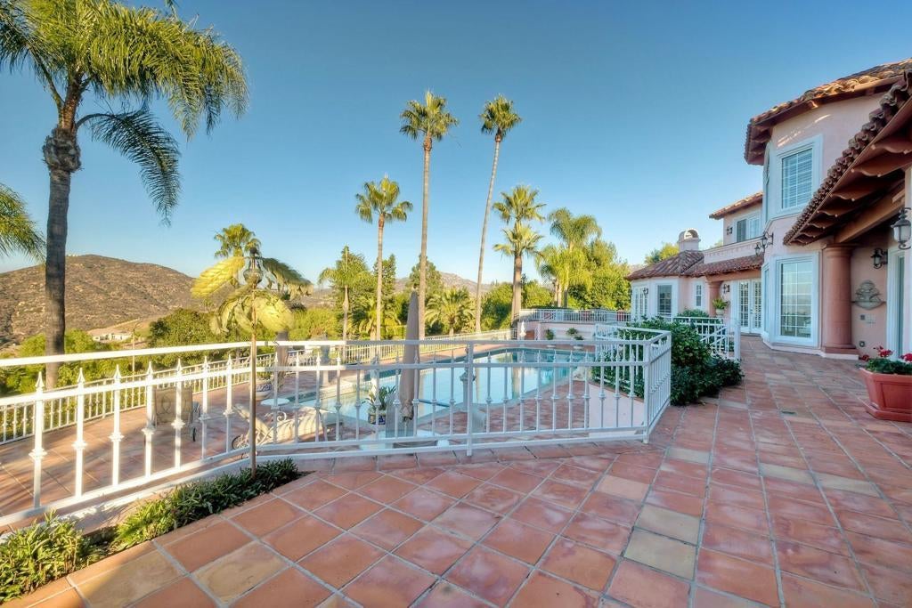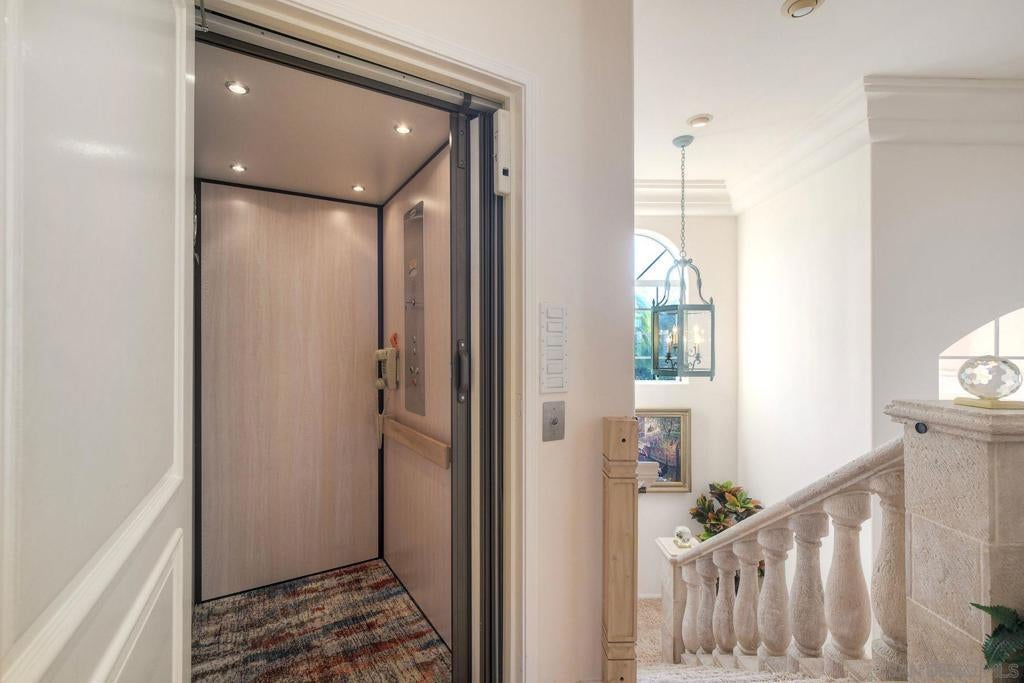 Expansive Estate in the prestigious Lomas Verdes Estates on an elevated lot, providing panoramic views of the mountains and valley. Each bedroom has an ensuite bath with the primary bedroom conveniently located on entry level. An attached ADU w/ living room, full kitchen and a bed/bath is located on the 2nd level w/ an elevator for accessibility. Gorgeous patios, pool and mature landscaping make this an entertainers delight. Located in the award winning Poway Unified School District and close to local favorite Bernardo Winery. This estate is a must see! Additional features of the home include a gated entry, sauna in the primary bathroom, multiple walk in closets with built ins, built in cabinetry in the garage, dutch doors in the breakfast nook, stainless sub zero refrigerator, Wolf 6 burner gas range with griddle and double ovens, large stainless range hood, granite countertops, pull out shelving in the kitchen cabinets, outdoor built in BBQ, water softener, epoxy coating on garage floor, central vacuum, marble flooring in living and dining room, outdoor shuffleboard and more!