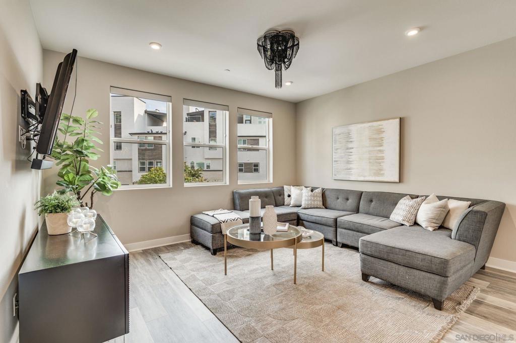 Modern luxury meets exceptional community living at 2804 Avella Circle in Civita. Set just steps from the renowned Civita Rec Center, this private and highly upgraded residence showcases a chef-inspired kitchen with walk-in pantry, wine fridge, and sleek, contemporary finishes. Beautiful grand chandeliers illuminate the staircases, adding elegance and sophistication throughout the home. The desirable first-floor bedroom with full bath is perfect for guests or flexible use, while the bright, clean interiors create a refreshing and welcoming atmosphere. The refined primary suite features a custom walk-in closet and a beautifully appointed bathroom, and the inviting terrace extends your living space outdoors ideal for relaxation or intimate entertaining. Civita offers a premier lifestyle with its 14-acre central park, resort and lap pools, cutting-edge fitness facilities, scenic trails, playgrounds, dog parks, and vibrant community events. With shopping, dining, and entertainment just moments away, Civita stands as Mission Valley’s ultimate destination for modern urban living. This stunning home is move-in ready and prepared to welcome its next owners.