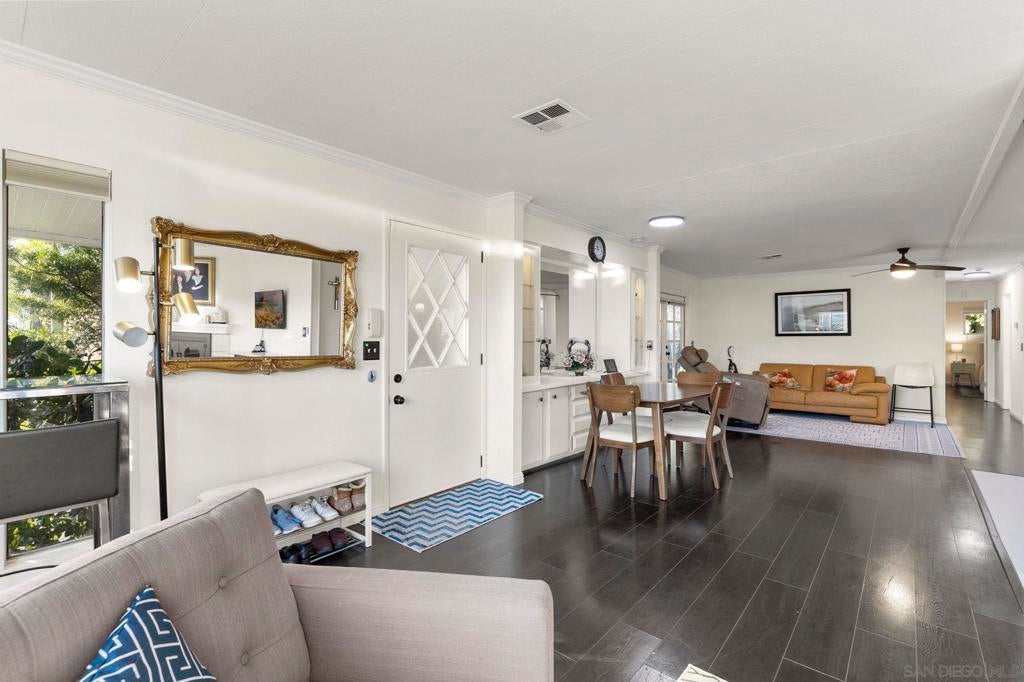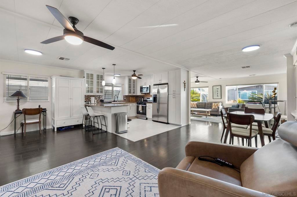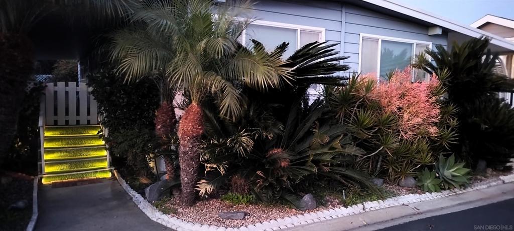 Updated and lovingly maintained 2 bedroom, 2 bath home in the prestigious 55+ community of Lakeshore Gardens! Remodeled kitchen with granite counter tops, tiled backsplash, stainless steel gas range, microwave, dishwasher and refrigerator. Extensive cabinets and bar style seating! Open concept floor plan with multiple skylights bringing in natural light. Hardwood laminate flooring and tiled kitchen and bathrooms. Expanded dual pane living room windows and rare corner gas fireplace! Ceiling fans in living and grand rooms. Open hutch across from dining area for additional storage. Crown molding throughout! Double doors to spacious covered deck. Unique rear and side yard which back up to a forested green belt making it peaceful, private & perfect for relaxing! Lakeshore Gardens is an active 55+, luxury manufactured home community located in Carlsbad! It is located on 54 acres of land, has 384 home sites, & 10 small lakes. Lush landscaping, greenbelts & mature trees throughout, giving the community a park-like feel. The ponds are home to turtles & many fish. Nature lovers have the best of all worlds here! The expansive 2 story clubhouse has a country club feel. The upper-level offers a card room with fireplace, billiard room & a beautiful balcony to enjoy ocean views. Lower level has a fabulous library, recreation room with a stage, commercial grade kitchen & restrooms. A large patio with fountain, fire pit, & outdoor fireplace just outside of the community room. A gated heated pool & spa, beautiful gym, ping pong table, RV parking & more. The entire park is enclosed with a 6 ft wall and security gates. So many activities in the community, almost daily, so residents can find friendship & companionship while attending events they enjoy. Activities include card games, bingo, monthly breakfasts, weekly potlucks, craft groups, golf groups, ladies’ luncheons & much more! You can be as active as you choose, right here at Lakeshore Gardens!