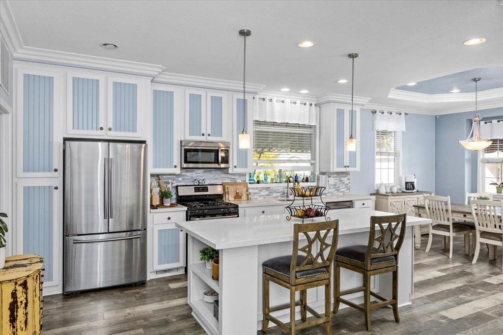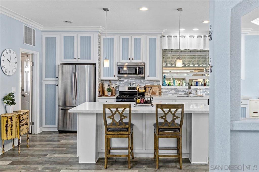 French Provencal Style W/ A San Diego Twist! This Beautiful Home offers a soft color palette with fun twists of color as accents! Kitchen is MADE FOR ENTERTAINING w/Massive Island, SS Upgraded Appliances, Stone Countertops & Beautiful Cabinetry! Upgraded Bathrooms, HUGE Laundry Room, Luxury Vinyl Plank Flooring Throughout! Large Side Yard with Turf, Mature Trees, Retractable Awning for Shade & Deck! Backs up to OPEN SPACE for privacy! Location is a 15 minute walk to South Carlsbad State Beach! LARGE strip mall offers EVERY POSSIBLE amenity from shopping to services all just a walk across the street! Lakeshore Gardens has a multitude of community areas that are upscale, assessible and beautiful!