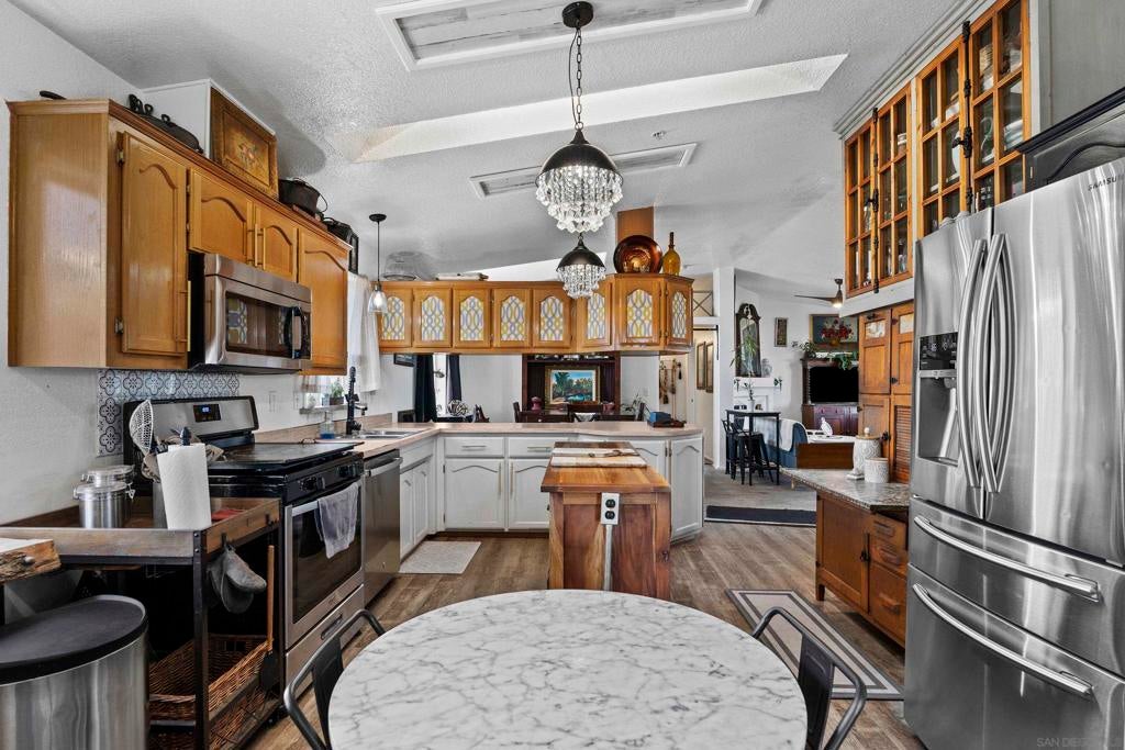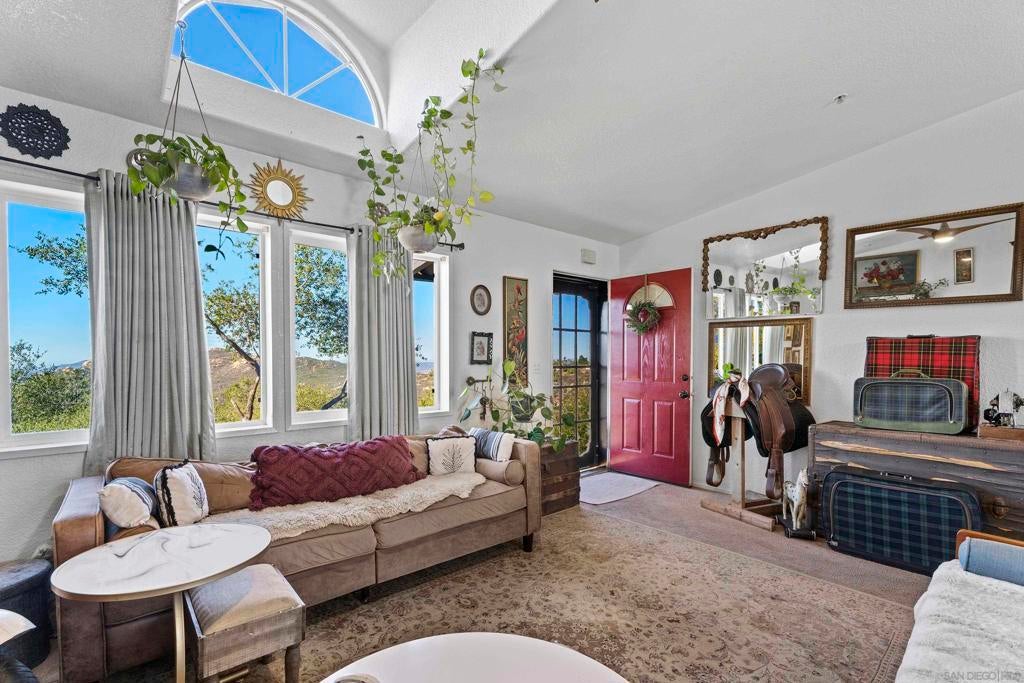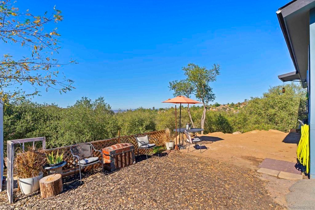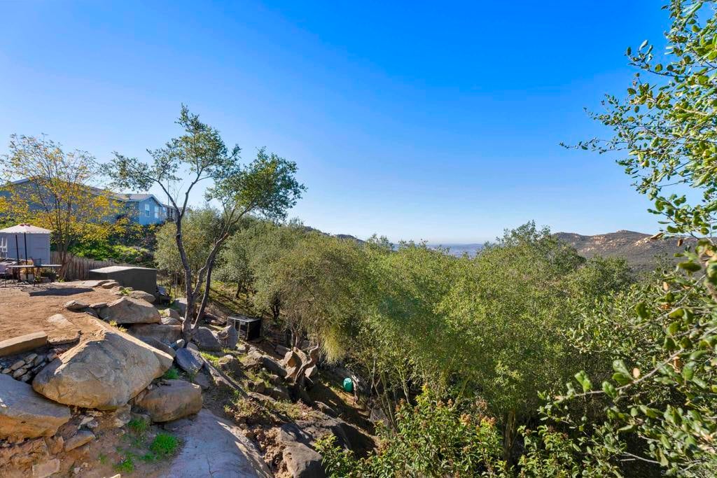 Situated at the end of a private road in a gated community, this elevated hilltop retreat offers rare privacy, sweeping city, mountain and valley views, all set in a peaceful, park-like setting. This three bedroom manufactured home is located in a private, gated 27-space community in the highly desirable Crest neighborhood. Positioned at the very end of the road, the property offers exceptional privacy with gated parking for approximately 3 - 4 Vehicles, depending on size. The elevated setting provides breathtaking city, mountain and valley views from the living room, primary bedroom, guest bedroom, and front yard. The exterior offers a serene, park-like atmosphere featuring natural boulders, gentle sloping terrain, and a grove of mature trees just beyond the front yard-ideal for relaxing, enjoying nature, or taking in the expansive views. Inside, the home features an open-concept layout with spacious kitchen, living room, and dining area designed to maximize light and views! Skylights, bay windows, vaulted ceilings and ceiling fans throughout enhance the bright and airy feel. The kitchen includes an island, ample cabinetry, and stainless steel appliances. A separate laundry room includes washer and dryer. French doors lead to a dedicated office with bay windows, offering flexible space for work or guests. The primary suite features vaulted ceilings, generous closet space, and an en-suite bath with a spa tub positioned among tranquil trees, mountains and city views! A wood-burning fireplace anchors the living area, adding warmth and character. Located in the Crest community, a unique mountain enclave known for its elevated setting, cooler temperatures, and expansive views overlooking the valley and surrounding mountains. Crest offers a quiet, semi-rural atmosphere while remaining conveniently accessible to El Cajon and Interstate 8. The area is characterized by natural landscapes, rock formations, mature trees, and a strong sense of community. Nearby amenities include Nancy Jane County Park with open green space, picnic areas, and recreational facilities.Local convenience such as a grocery store with wine and liquor, restaurant/cafe are located close by, providing everyday essentials without the need for long travel. Crest is valued for its privacy, scenic beauty, and peaceful lifestyle, making it an appealing alternative to more densely developed neighborhoods while still offering reasonable access to shopping, dining and commuter routes.