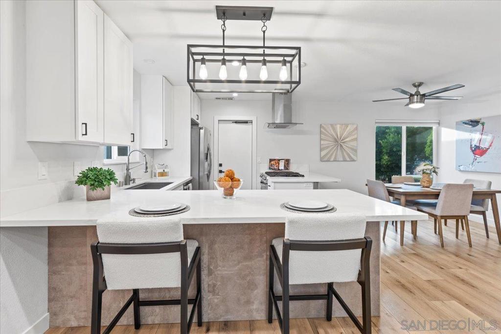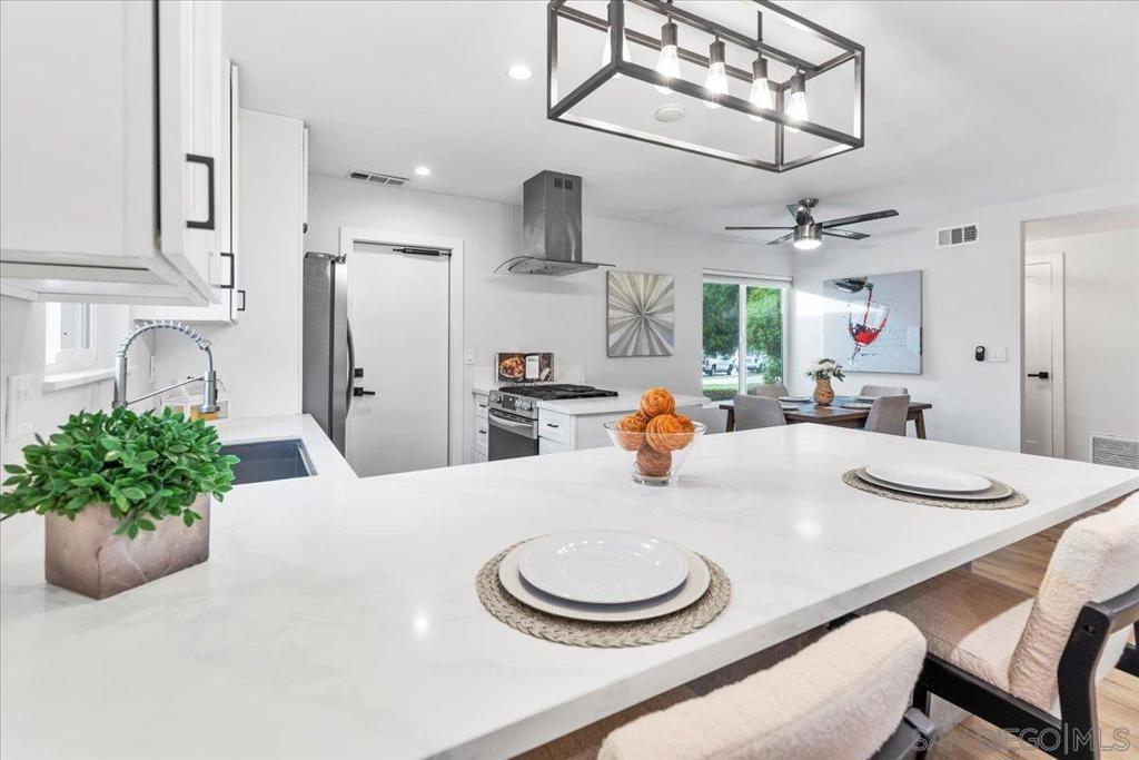 Set against a serene natural open space and positioned on an expansive quarter-acre lot, this beautifully remodeled single-story 4 Bedroom 2 Bath offers a rare sense of privacy and tranquility paired with modern comfort. A thoughtfully designed, low-maintenance succulent landscape creates vibrant curb appeal and a warm welcome. Inside, an open and inviting floor plan unfolds, anchored by a spacious living room with an updated brick fireplace. The adjacent kitchen overlooks the living area and is both stylish and functional, featuring a six-burner gas range, stainless steel appliances, designer cabinetry, quartz countertops, and convenient breakfast-bar seating, ideal for everyday living and entertaining alike. Seamless indoor-outdoor living is achieved as the living room opens to a peaceful backyard retreat, complete with a custom pergola and drought-tolerant landscaping that evokes a true sense of nature and relaxation. The primary suite is a private haven with an updated ensuite bath showcasing a walk-in shower and custom tile surround, while three additional bedrooms and a beautifully refreshed guest bath offer flexibility and comfort. Additional highlights include solar, central air and heating, and dual-pane windows. Ideally located near Santee Lakes, the Sports Complex, Cameron Family YMCA, local schools, and community events, this home also enjoys convenient access to Trader Joe’s, Costco, Target, and an array of neighborhood shops and dining—offering the perfect balance of serenity and accessibility.