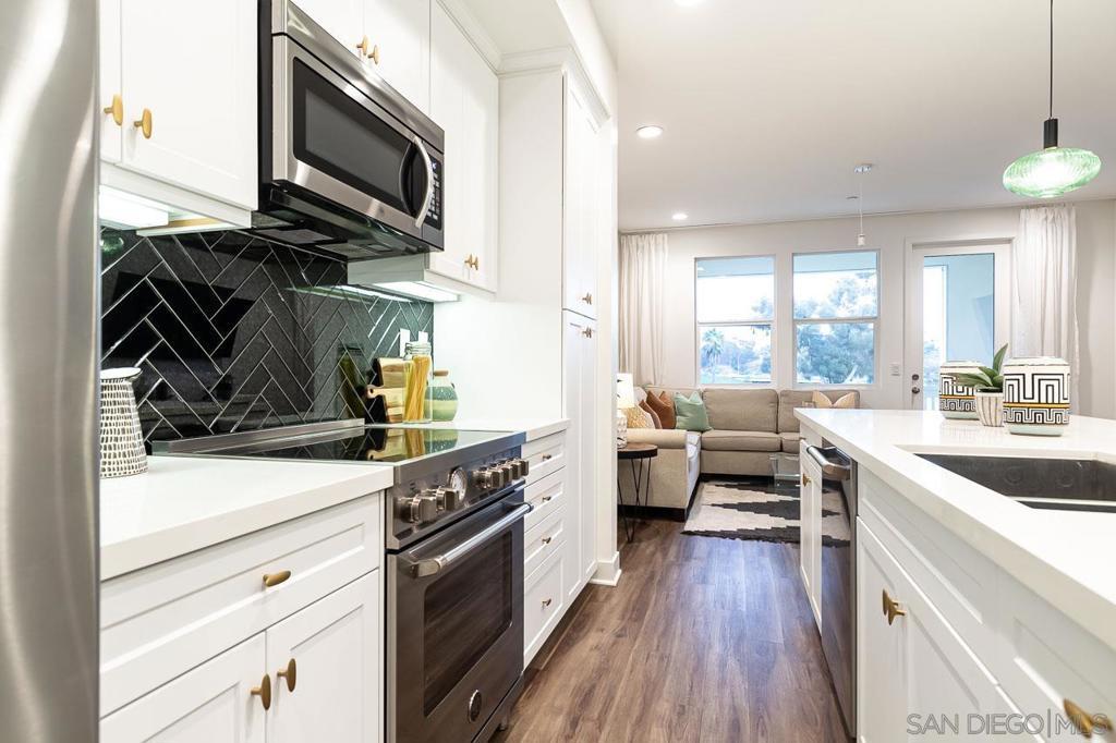 Welcome to this beach-close, west-of-the-5 townhouse in The Tides Complex. This modern residence offers a well-designed 3-bedroom, 2.5-bath layout with approximately 1,775 square feet of comfortable living space. Eco-conscious features include owned solar panels, an ECO water heater, and electric vehicle hookups in the private two-car garage. Inside, elevated finishes include wood and tile flooring, high ceilings, luxury appliances, and an open kitchen that flows seamlessly into the family room. Upgrades throughout the townhome include owned solar, an ECO water heater, Nest-controlled AC, electric vehicle hookups, and a striking 13-foot quartz island. Luxury vinyl flooring runs throughout, complemented by custom inlay tile on the stairs, a designer kitchen backsplash, curated lighting, and a custom barn door in the third bedroom. Thoughtful storage is built in, including custom closets, overhead garage storage, and an oversized tandem garage with workspace. The kitchen is anchored by a Bertazzoni range and upgraded stainless steel appliances. Built in 2019, the desirable Tides Complex features gated entry, a clubhouse, and a resident pool. Off-street parking for two vehicles and an upper-level laundry area add everyday convenience.