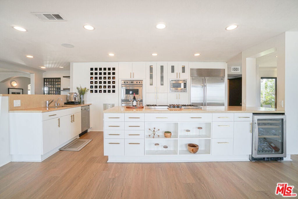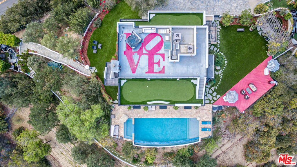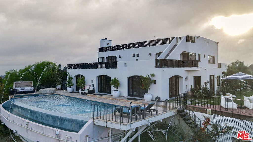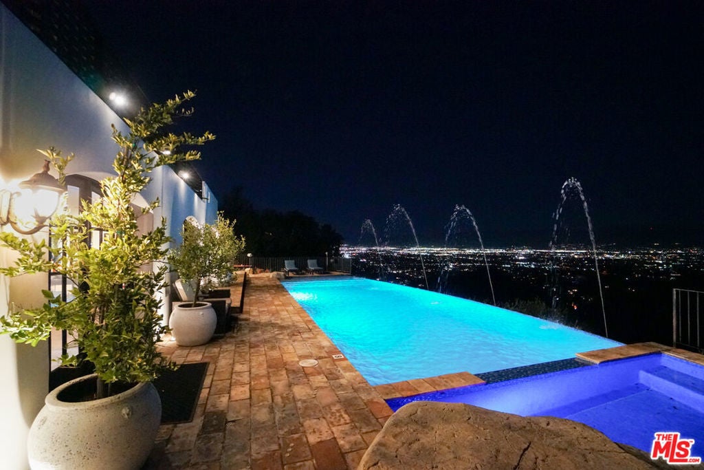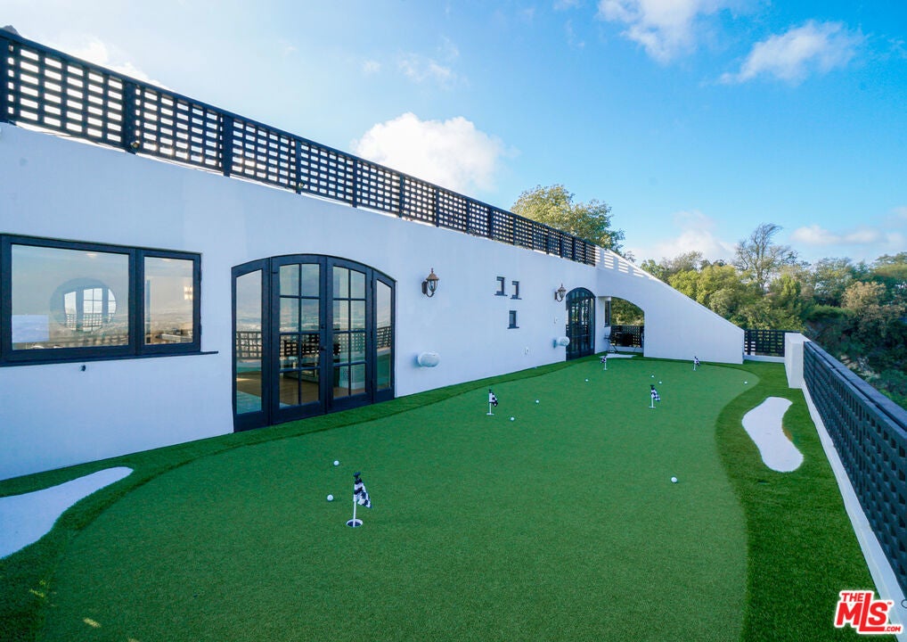 Seeking the ultimate Beverly Hills sanctuary where you can leave behind the hustle and bustle of everyday life? Look no further than this beautifully crafted secluded estate that provides the perfect blend of luxury and tranquility while being just moments from everything LA has to offer! Enviably set on over an acre atop famed Mulholland Drive, this residence commands spectacular views from an impressive 1,300 ft above sea level. A gated, private driveway leads to the grand 2-story facade. Inside, new luxury flooring and dark wood trim tastefully contrasts crisp white tones. Graceful archways greet you in the generously sized open entertainment areas as you seamlessly transition from one room to another. Multiple French doors in the family room and dining area frame sweeping panoramas of the city, ocean, and Catalina Island. A raised-hearth fireplace with a stacked-stone surround anchors the stylish volume ceilings, warming the living room as you gather. Shake up your favorite cocktails and head outside to relax by the infinity pool and appreciate the stunning views in absolutely every direction you look. Sleek and sophisticated, the chef's kitchen equips you with top-notch stainless steel appliances, abundant white wood cabinetry, granite countertops, an oversized island, and a breakfast nook with access to the patio. Working from home is even better in your private office overlooking breathtaking views. Admire picturesque sunsets from your well-sized bedrooms, adorned with mirrored closets and French doors that open to the large wraparound balcony. Surpassing all in size, the primary suite has a walk-in closet and an ensuite with a spa-like soaking tub and scenic views. Endless hours of fun and leisure await in your expansive outdoors that offers numerous entertaining decks, a resort-style infinity pool, two putting greens, and a pool cabana. Alfresco dining is bliss under the pergola as you enjoy delicious meals prepared on the built-in BBQ island. On cooler nights, sip a refreshing nightcap as you take a soothing dip in the rooftop spa while watching the sunset views and city lights twinkle below. Other notable features include a large private vineyard, a koi pond in the zen garden, a waterfall, and a professional music studio. The estate vineyard produces private reserve wines with multiple varietals, including Pinot Noir, Sauvignon Blanc and Cabernet. The golf decks are beautifully manicured with 9 holes and white artificial sandpits. Convenience is yours with smart-home technology including a Control4 music system, two Nest-operated HVAC units, app-controlled landscape lighting, home protection system, wireless pool features and a 16-camera CCTV system. Its fabulous location puts you near the world-class shopping, dining, and attractions of the Sunset Strip, West Hollywood, and Beverly Hills. Come grab the rare chance to call this Mulholland Oasis home!