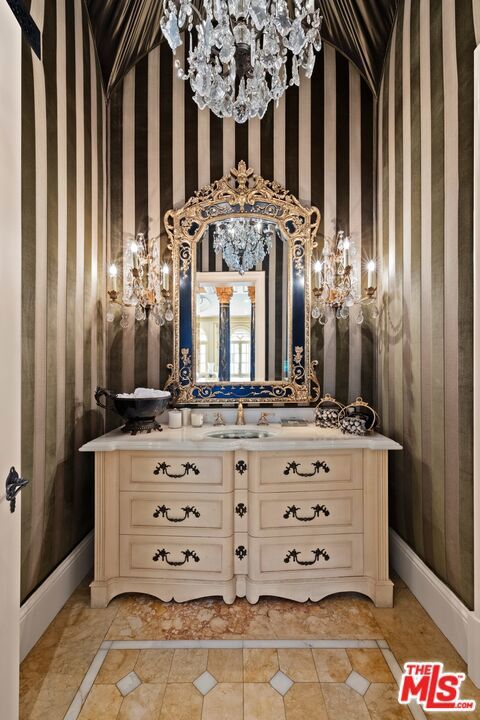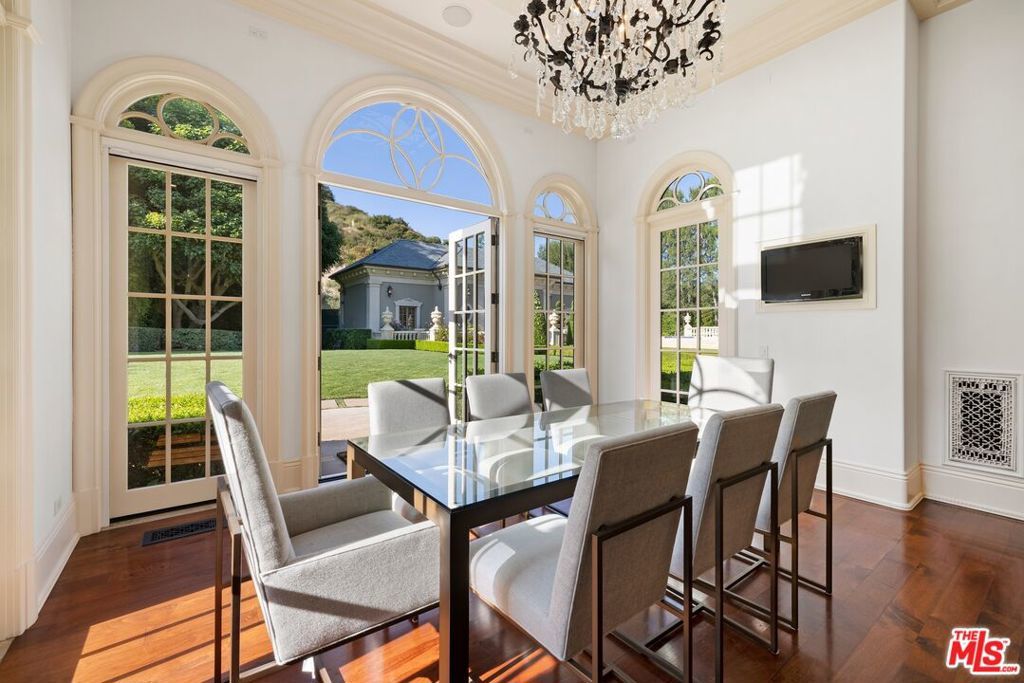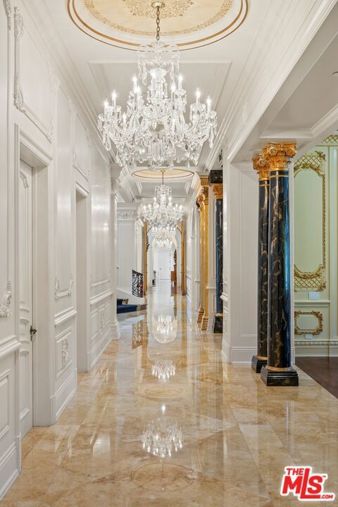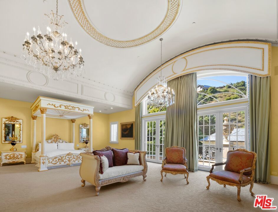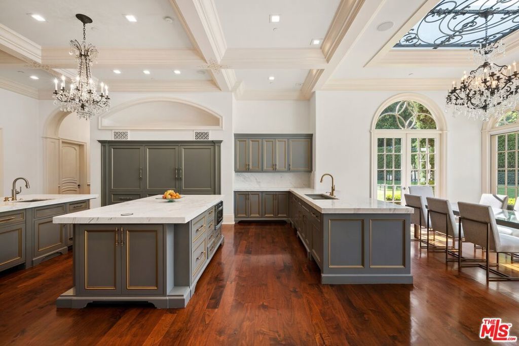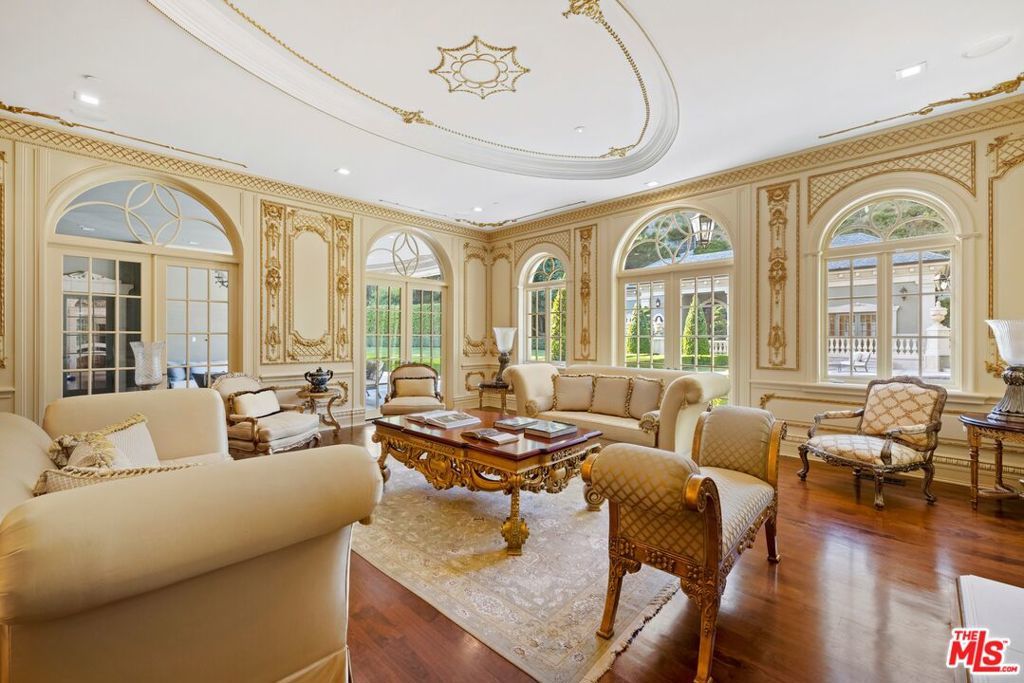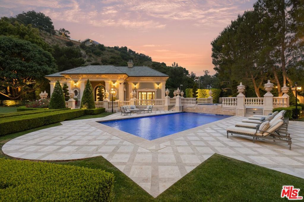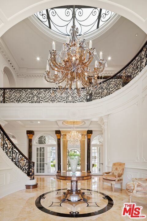 Nestled within the exclusive, guard-gated enclave of North Beverly Park, this masterfully crafted French Chateau evokes timeless elegance and refined sophistication. Set on approximately two manicured acres, the estate is enveloped by mature trees, tailored hedges, vibrant rose gardens, and expansive lawns, creating a serene and private outdoor sanctuary. A grand motor court welcomes guests, framing the stately facade adorned with classical architectural details. Inside awaits the double-height entryway with intricate wrought iron detailing, gleaming marble floors, and a sweeping spiral staircase offering an ideal backdrop for elegant gatherings and grand entrances. An array of exquisite features sets the tone for effortless luxury throughout: glittering chandeliers, French doors that flood the space with natural light, and Corinthian columns accented with gold leaf. The formal living room, with an ornate stone fireplace and rich wood flooring, offers an inviting ambiance for both intimate and grand-scale entertaining. Adjacent, the parlor/library provides a quiet retreat for study or relaxation. The chef's kitchen is a culinary masterpiece, boasting dual oversized islands, professional-grade Viking appliances, a custom refrigerator, and a double chef's range. A sunlit breakfast room opens to the enchanting rear gardens, while the formal dining room, sets the stage for memorable occasions. The family room, complete with a fireplace and entertainment center, is ideal for everyday comfort, while the private screening room and snack bar offers an unparalleled cinematic experience. Upstairs, the palatial primary suite features soaring 20-foot ceilings, a private balcony, and dual spa-inspired bathrooms equipped with rain showers, jetted tubs, and custom vanities. The exterior of the estate is a perfect retreat offering both comfort and grandeur. The pool and spa evoke the charm of a European retreat, complemented by a stately ballroom for hosting unforgettable events. A lighted regulation-size sport court accommodates tennis and basketball, while the meticulously curated rose garden provides a tranquil escape. Designed with the highest standards of privacy and security, this extraordinary residence offers not just a home but a lifestyle of unmatched comfort, prestige, and sophistication.